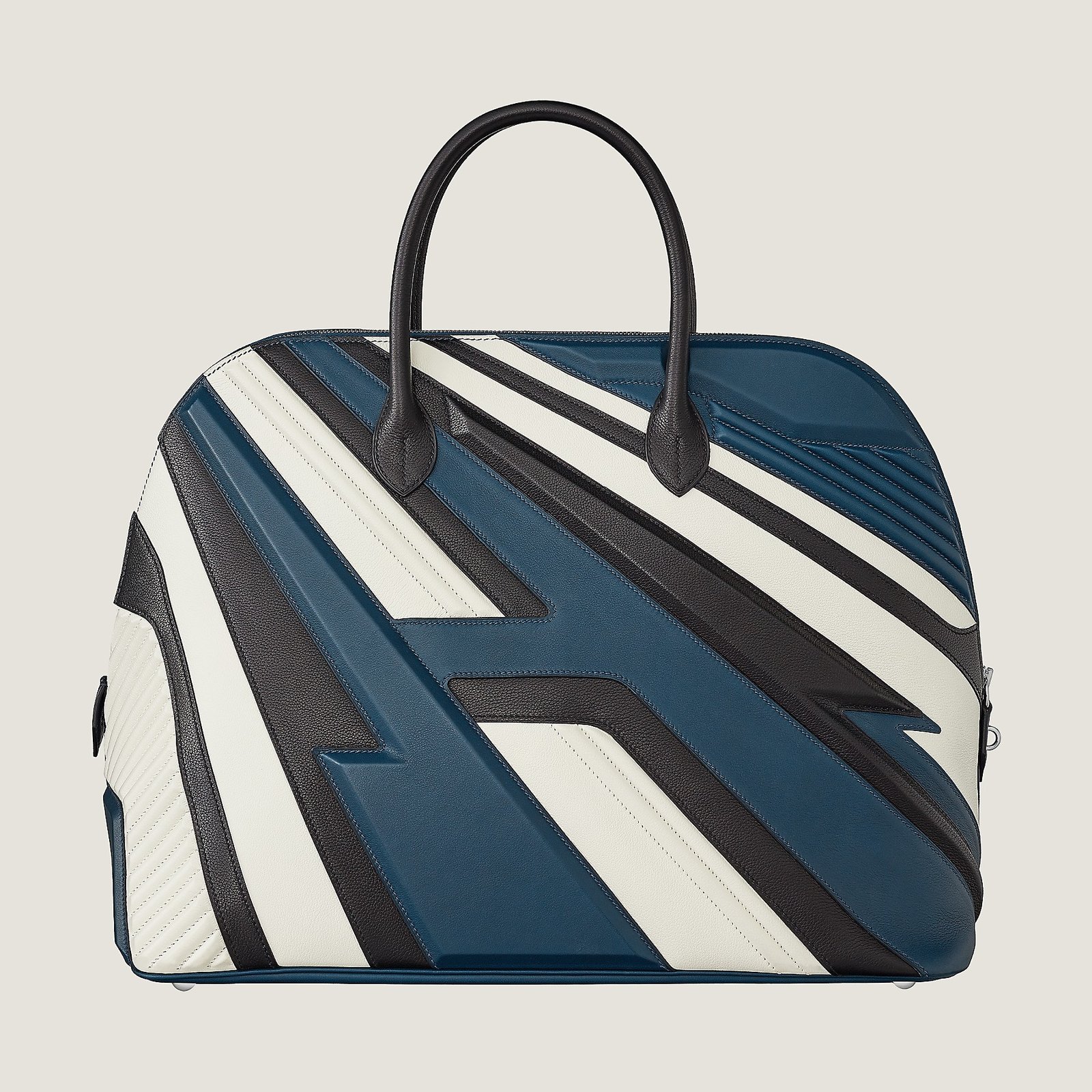 The motorcycle motif on the emblematic Bolide evokes the world of racing – at top speed. With motorcycle jackets providing a clear inspiration, the Bolide is crossed by a dynamic H, evoking an H-shaped lightning strike. This exceptional design showcases two unique forms of expertise requiring over 30 hours of work: the appliqué-stitch technique and cladding 14 pieces of leather in relief.