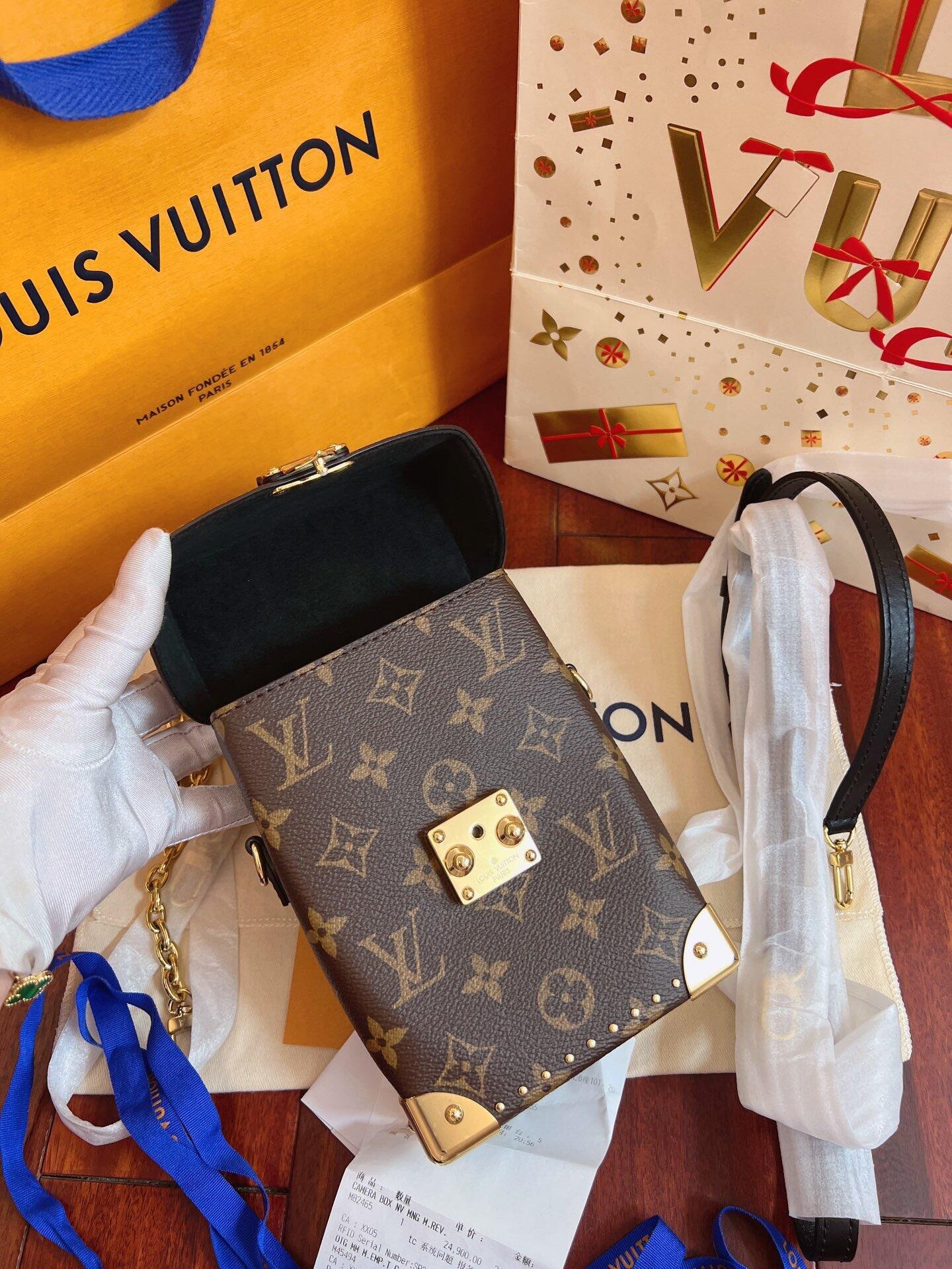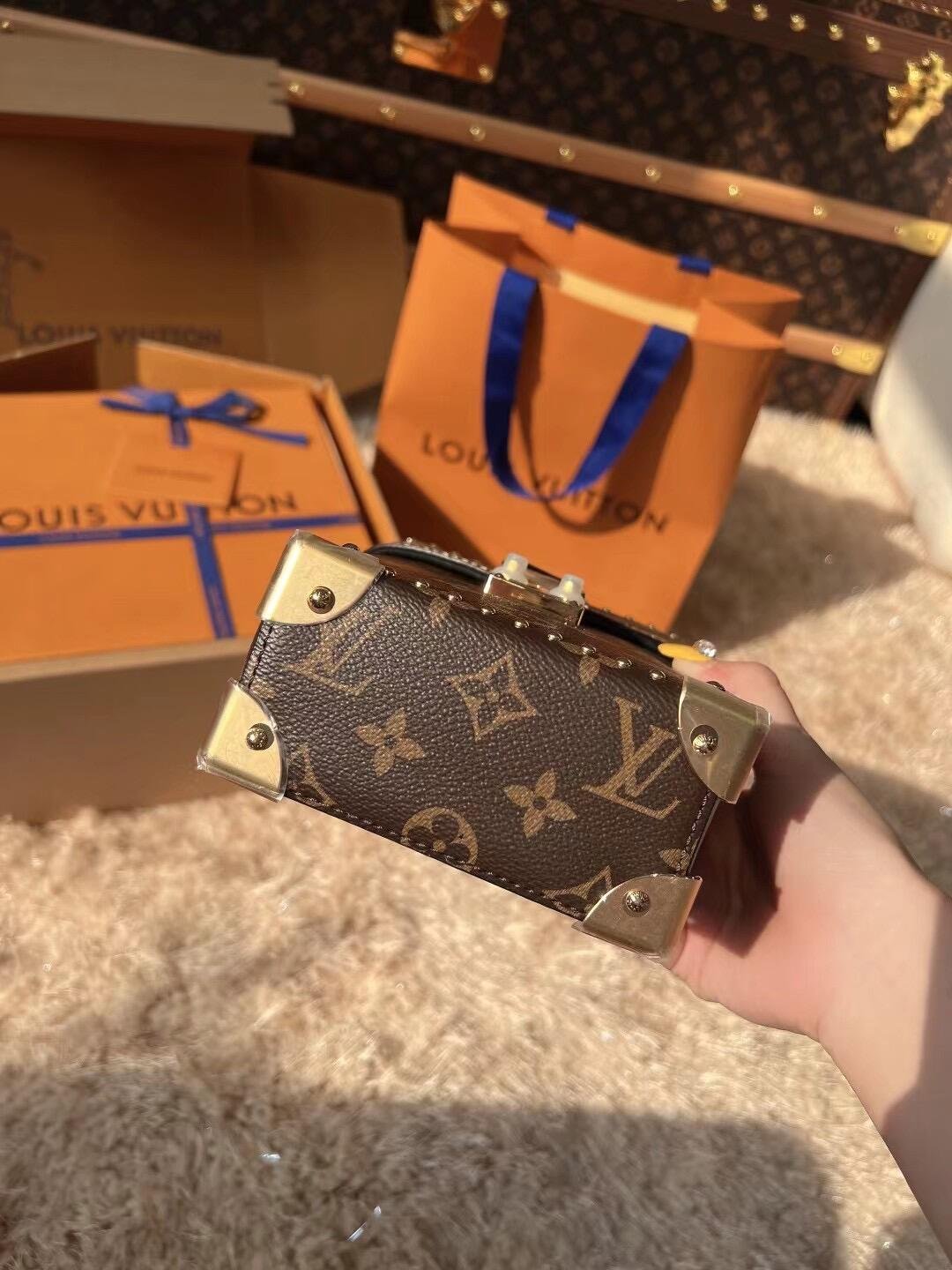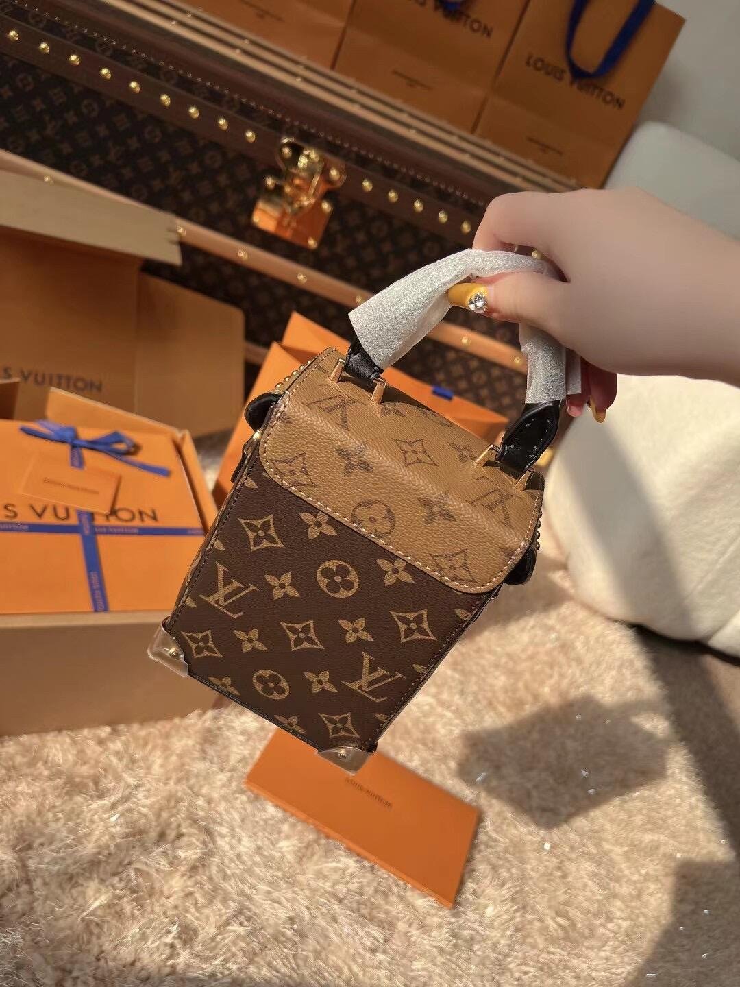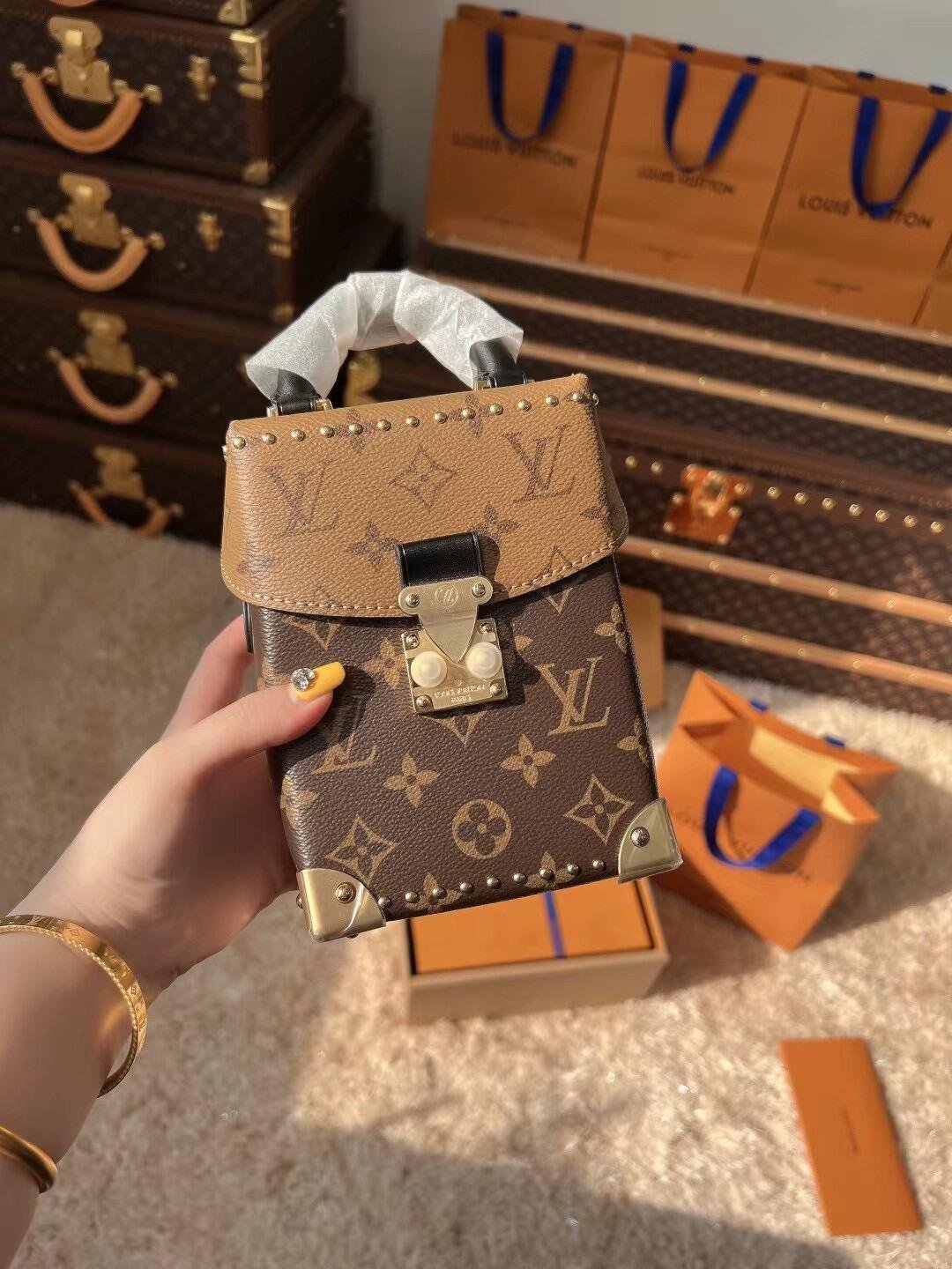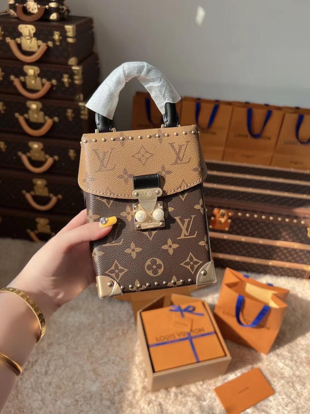 The Camera Box handbag combines all the Petite Malle’s signature details – S-lock, metallic corners, rivets, and a mix of Monogram and Monogram Reverse are all here – but on a modern shape. A thin gold-color chain brings a feminine touch to the bag while the pivoting top-handle adds a comfortable carry option.