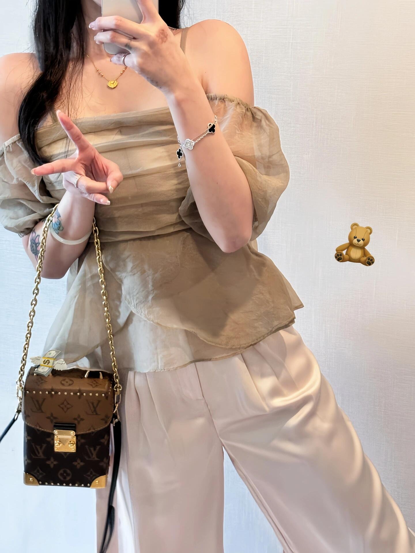 - Gold-color hardware