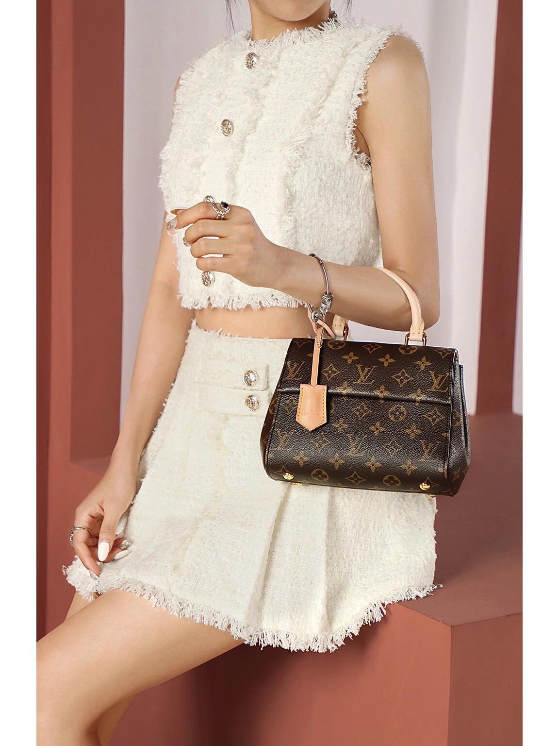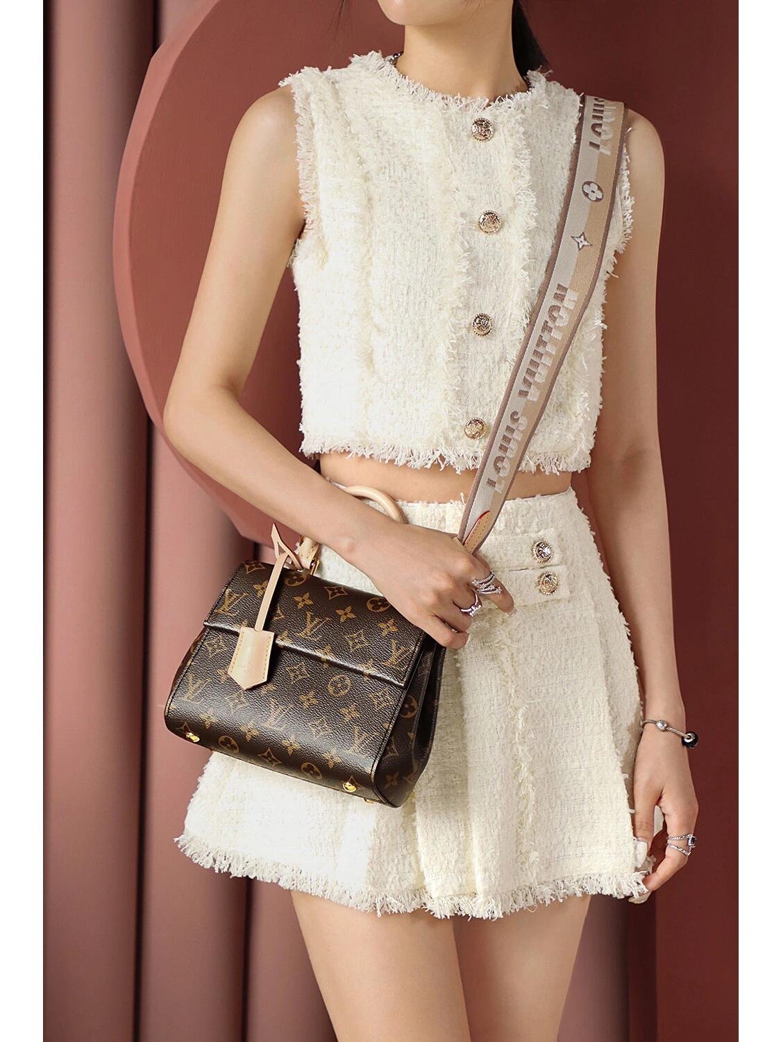 The adorable Cluny Mini handbag in iconic Monogram canvas is designed to delight LV lovers. A perfect little bag for daily wear, it features a signature Toron handle and key bell in the Maison’s classic natural leather. A textile strap enriched with a woven “Louis Vuitton” can be added or detached, thus enhancing the bag’s versatility.