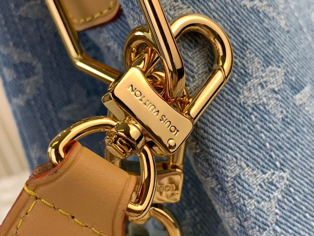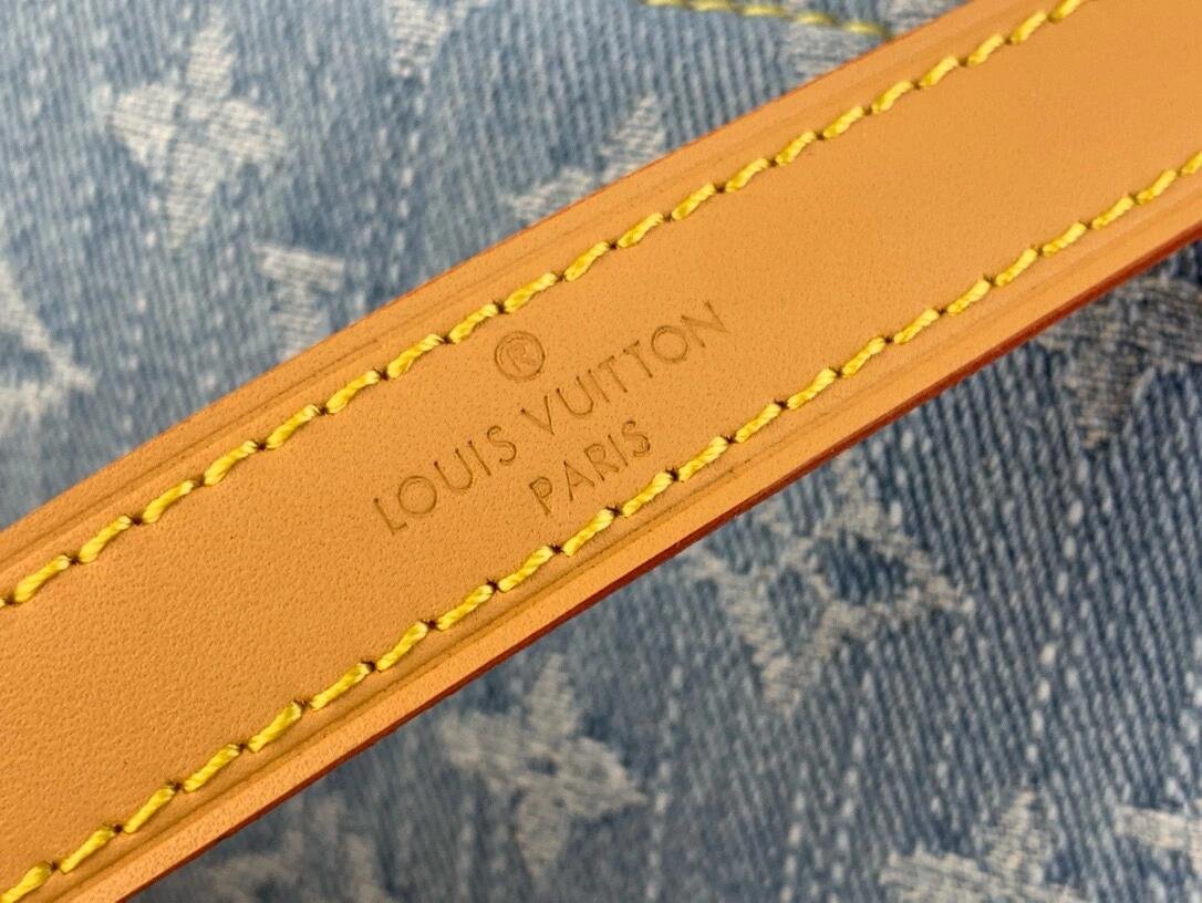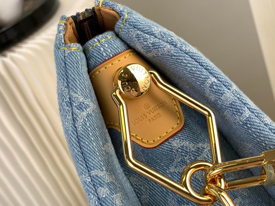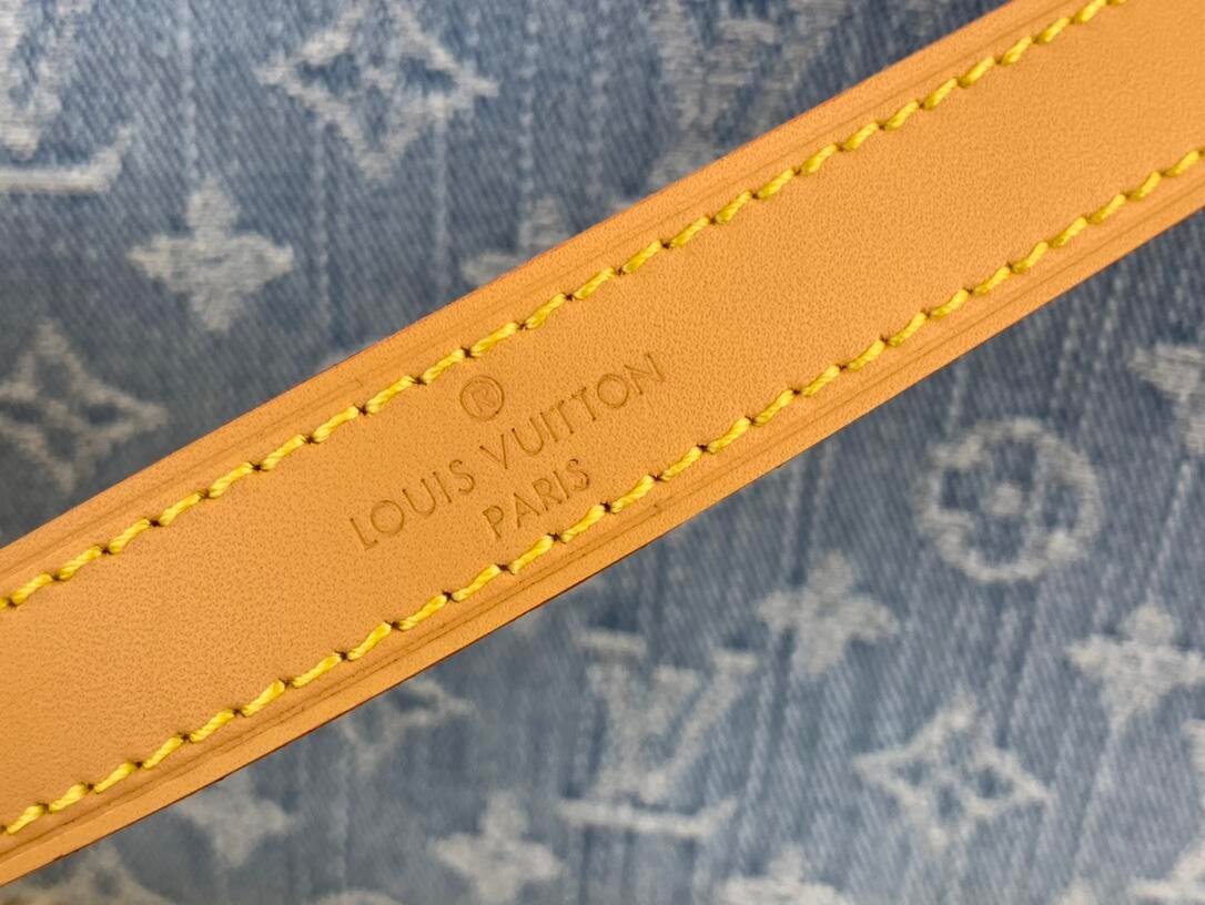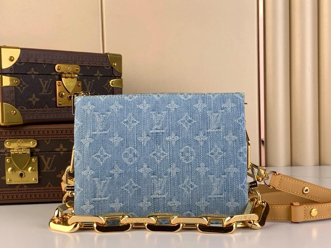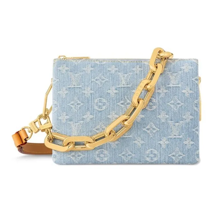 Made of 100% cotton denim, this Coussin BB handbag evokes summer fun in Monogram Denim. To create this unique fabric, the Monogram pattern is first woven into the textile, which is then bleached and stonewashed. The bag features a chunky chain and a leather smart strap, both removable.