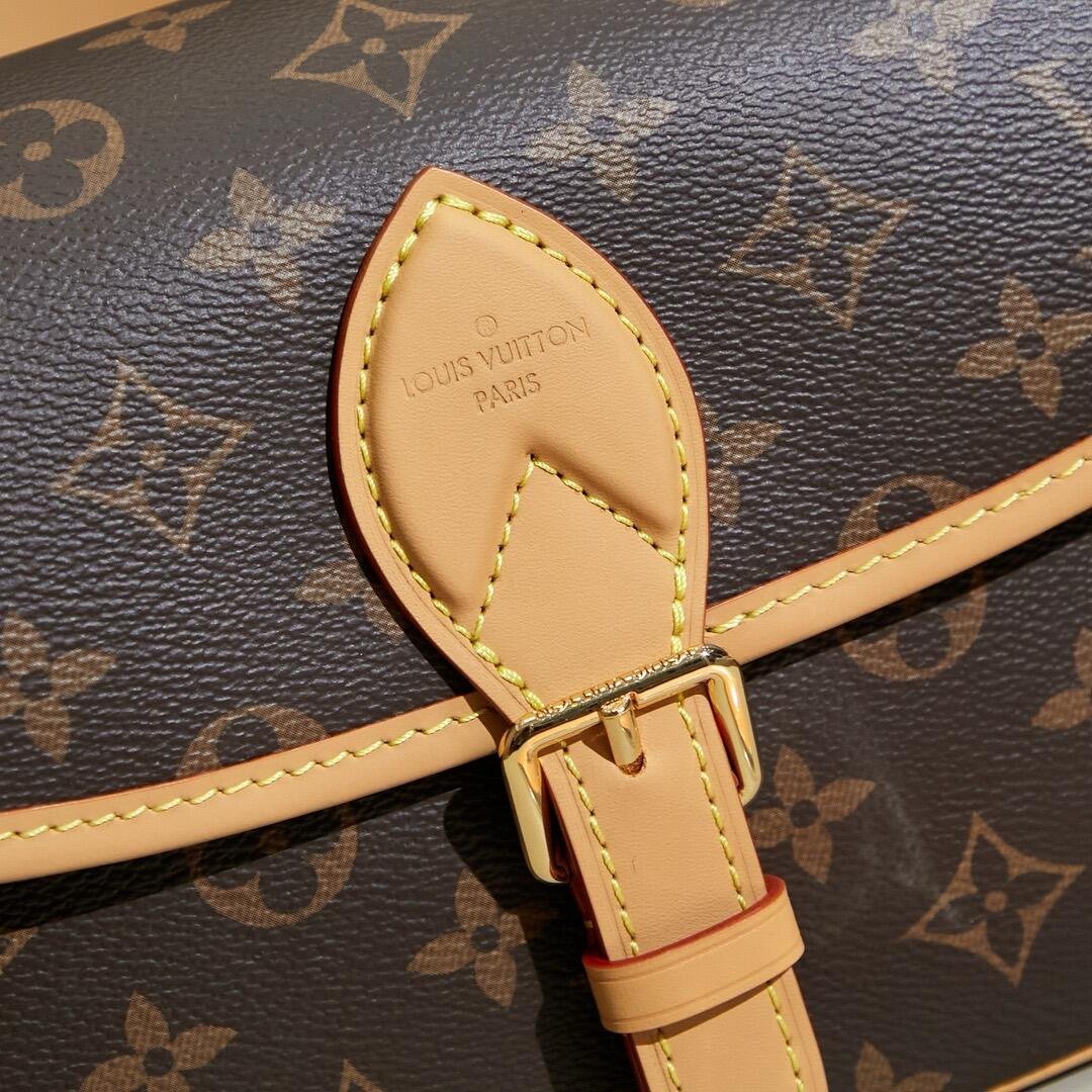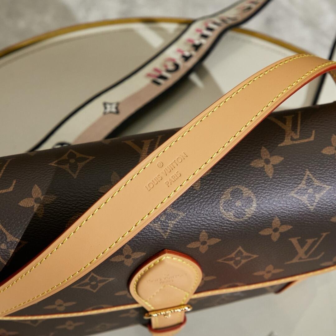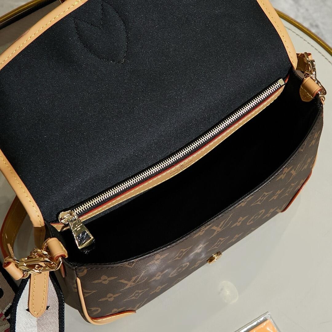 The Diane satchel in Monogram canvas revisits a classic model from the 90s, combining such vintage details as leather corners and an archival-inspired buckle with the modern functionality of smart pockets and a well-organized interior. The exclusive wide jacquard strap reverses from a bold Louis Vuitton signature to a subtle Monogram Flower motif.