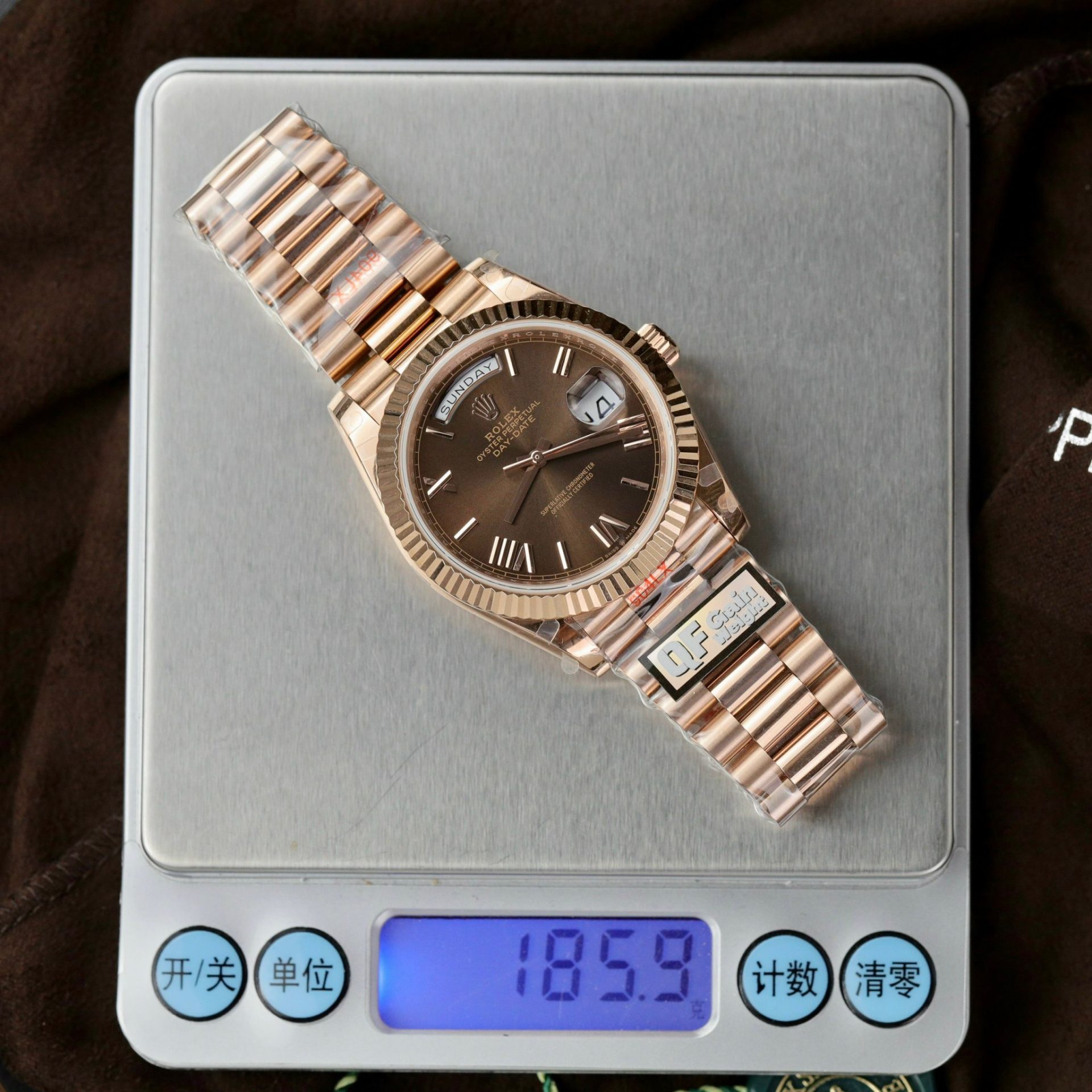 Rolex Day-Date Rose Gold Plated Replica 1:1, weighing 186 grams, QF Factory, 40mm.