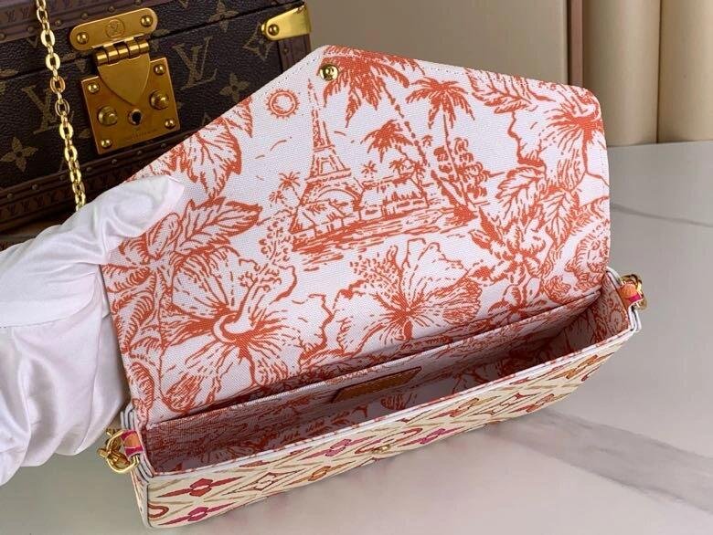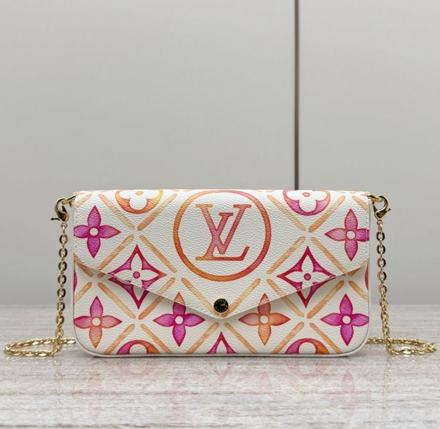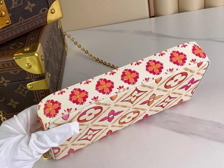 This seasonal edition of the Félicie Pochette is part of the LV By the Pool collection. It comes in coated canvas with a Mediterranean-style Monogram Tiles print and an LV Circle logo. This versatile, envelope-style pouch features two removable pockets and a removable, gold-tone chain, allowing it to double as a clutch.