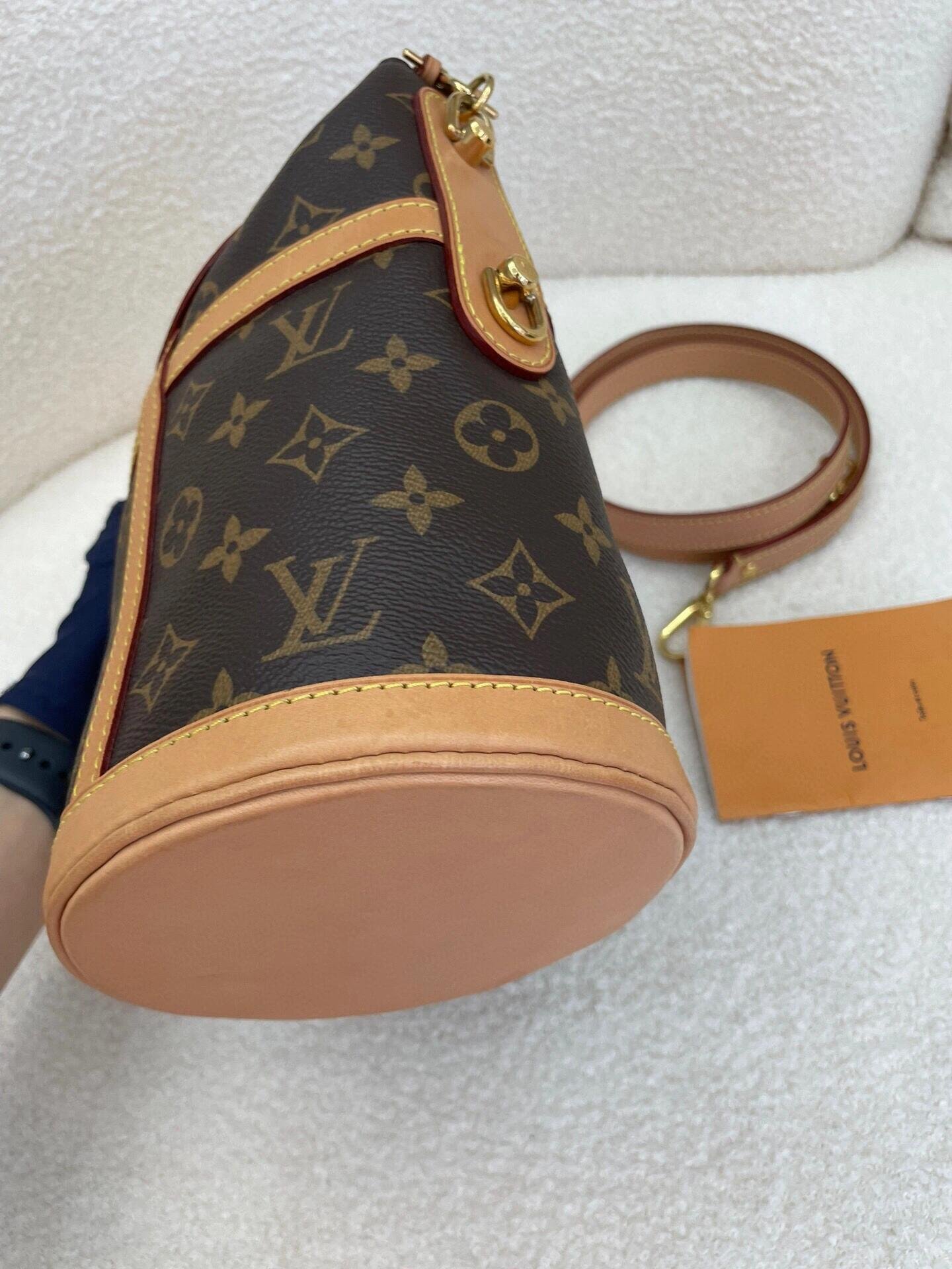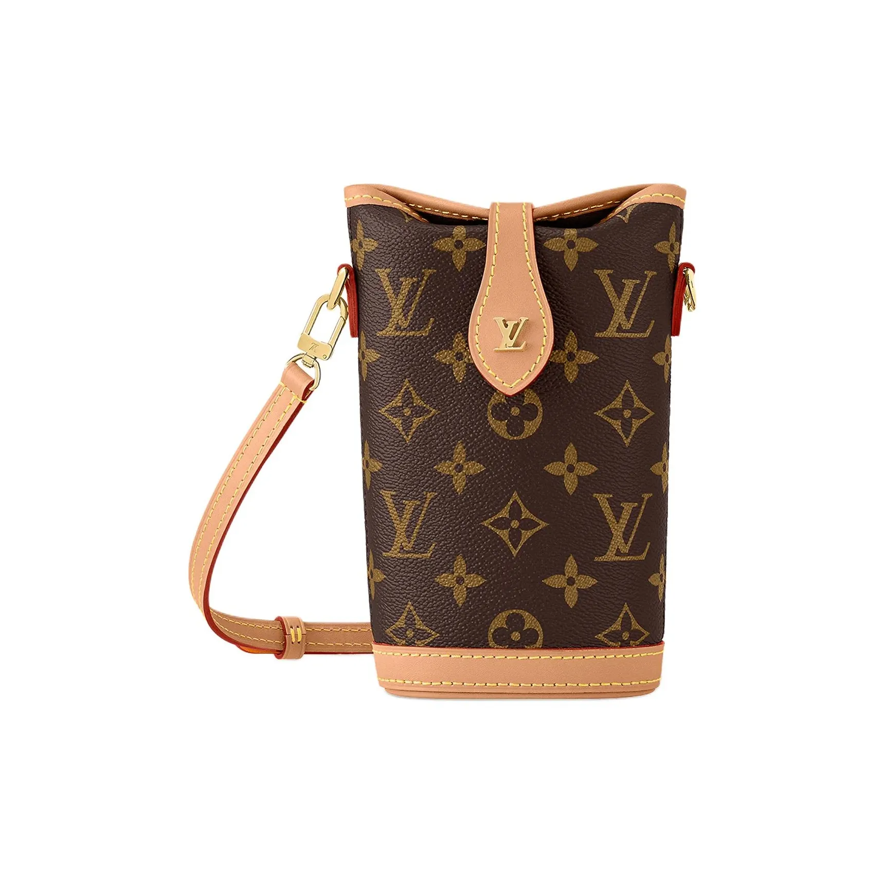 The Fold Me pouch in Monogram canvas and natural cowhide leather combines a vintage aesthetic with an on-trend functionality. Its design contrasts an oval base with a rectangular body, finishing with a folding, magnetic closure. Though small in size, it is large enough to hold everyday essentials, while its removable, adjustable leather strap offers different carry options.