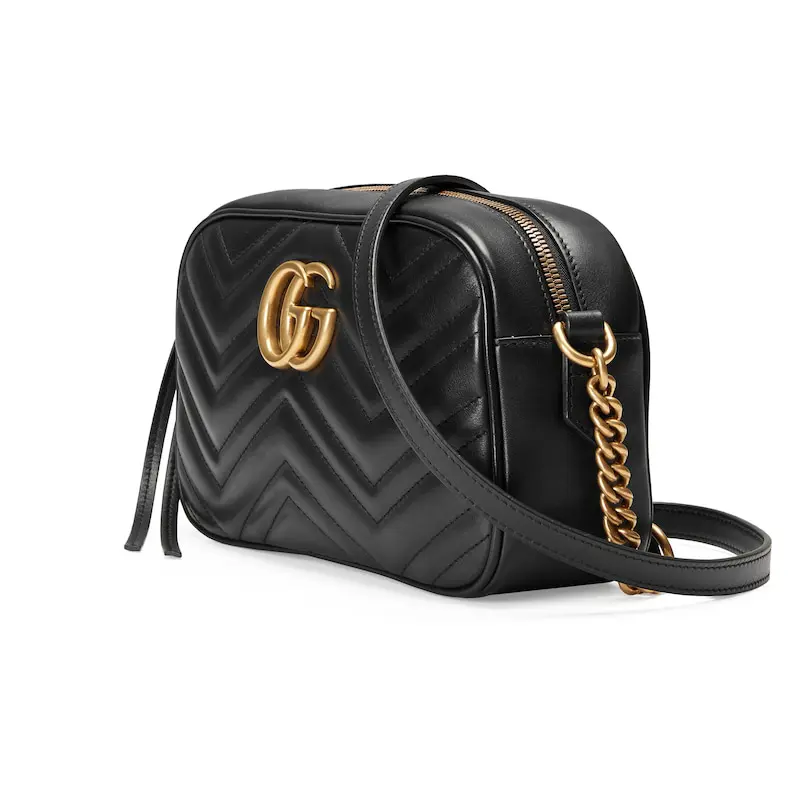 The GG Marmont small camera bag has a softly structured shape and a zip top closure with the Double G hardware. The chain shoulder strap has a leather shoulder detail. Made in matelassé leather with a chevron design and GG on the back.