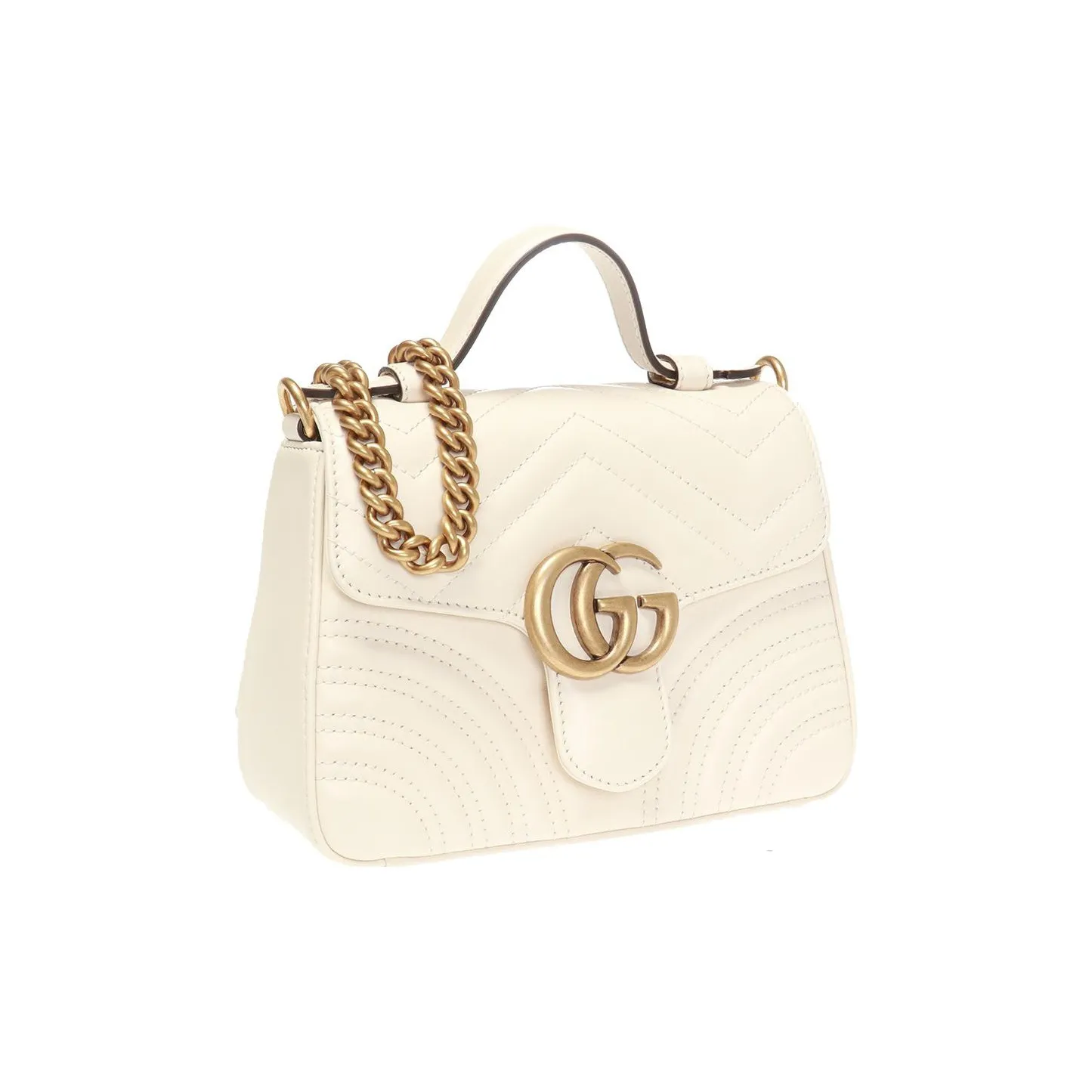A new introduction to the GG Marmont line for Cruise 2019, the small GG Marmont top handle bag has a softly structured shape and an oversized flap closure with Double G hardware. Equipped with a leather top handle and chain shoulder strap, made in matelassé chevron leather with a heart on the back.