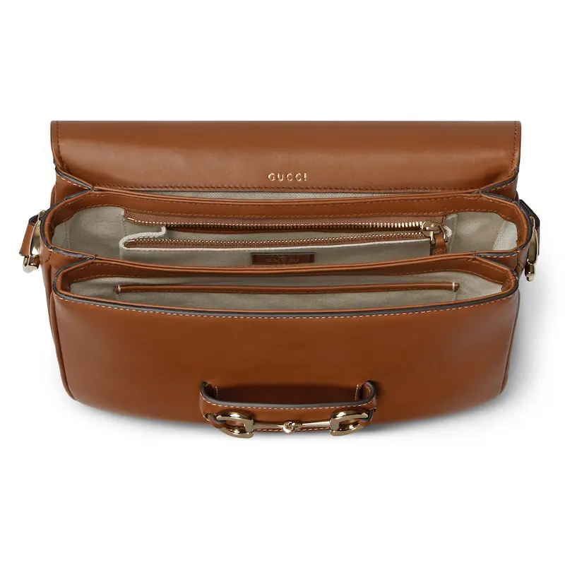 The Gucci Horsebit 1955 continues its equestrian-inspired design with the double ring and bar hardware, blending light gold-toned details and soft leather on this shoulder bag.