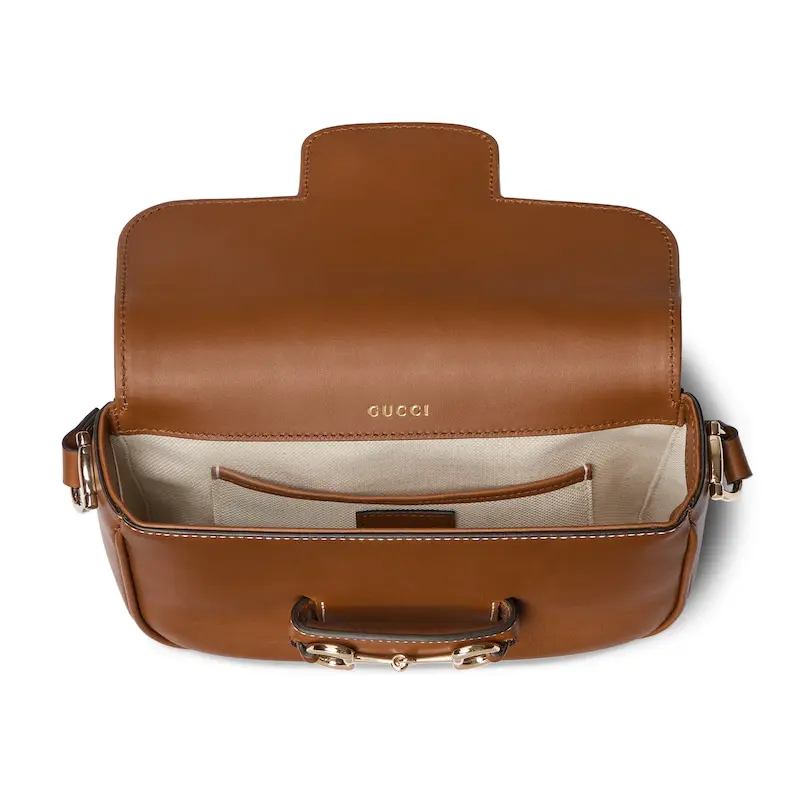 The Gucci Horsebit 1955 continues its equestrian-inspired design with the double ring and bar hardware, blending light gold-toned details and soft leather on this shoulder bag.