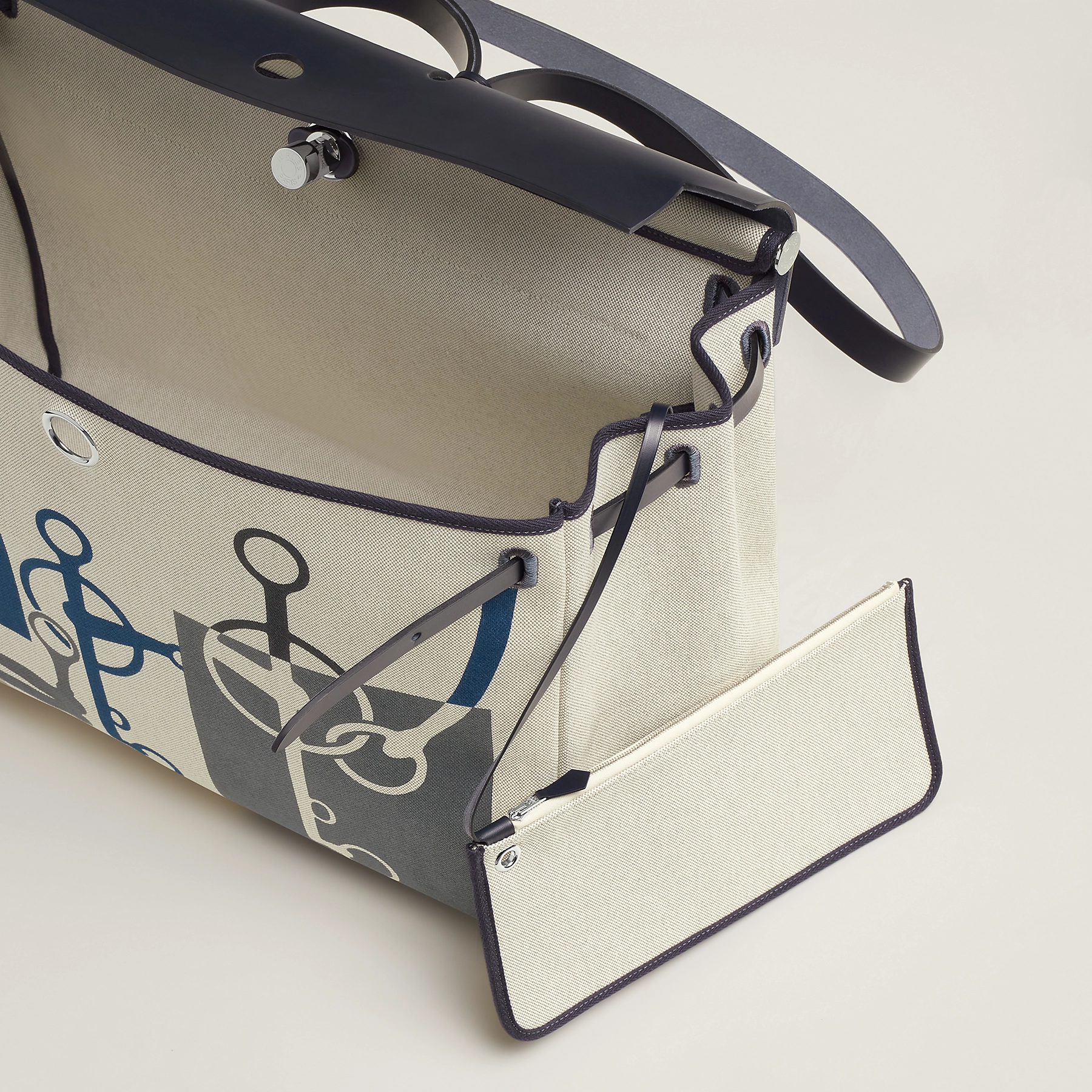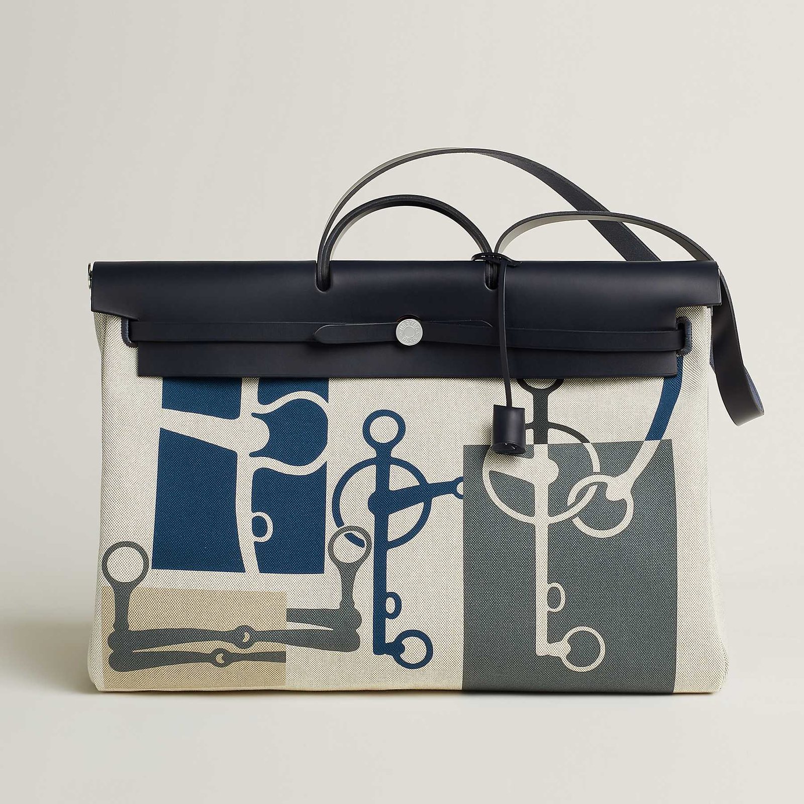 Travel bag in H Plume canvas with “Less is Mors” motif, shoulder strap, collapsible handle, exterior pocket and Clou de Selle closure