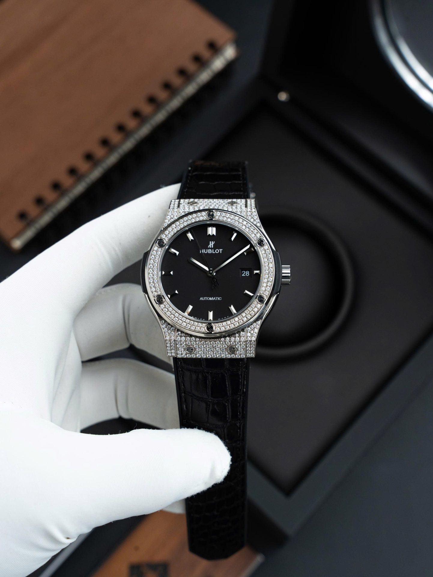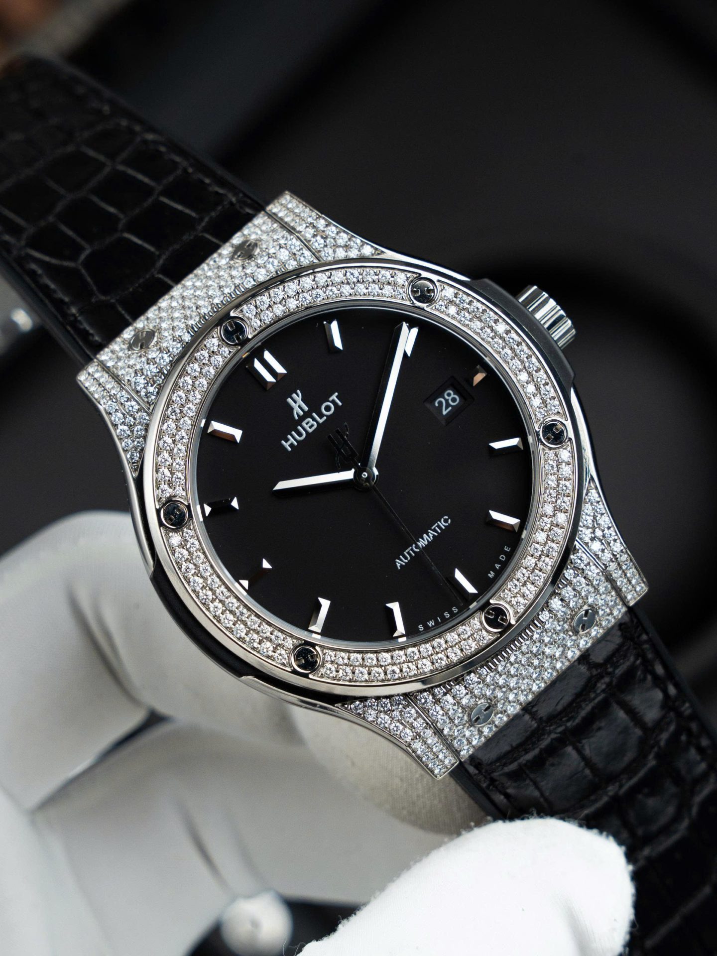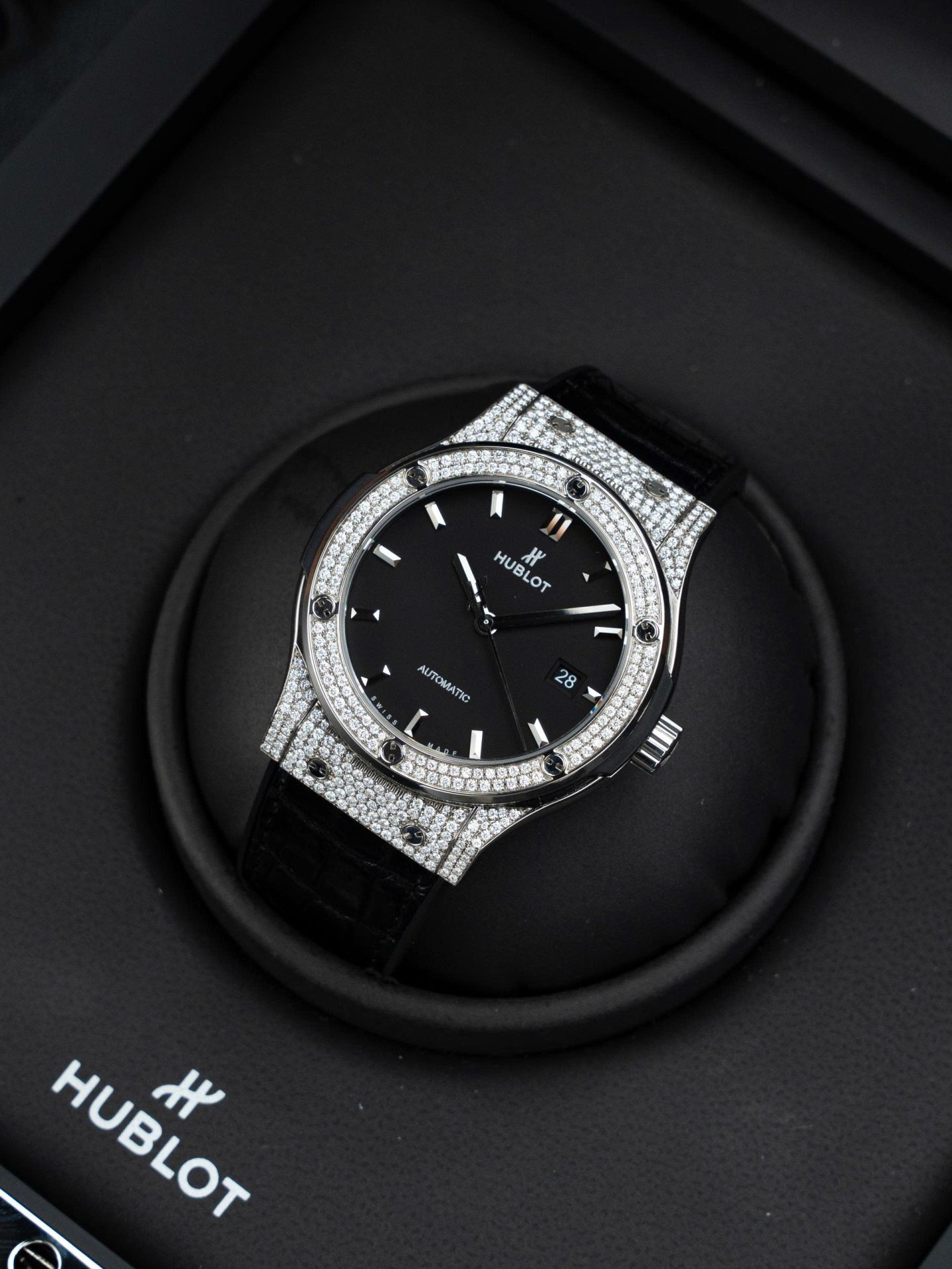 Hublot Classic Fusion Black Dial Imitation Watches Custom Natual Diamonds Automatic SW300 Movement 42mm