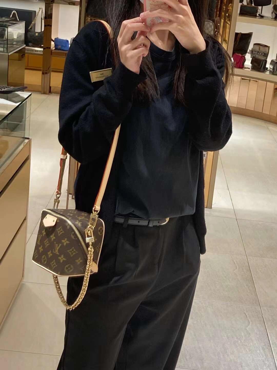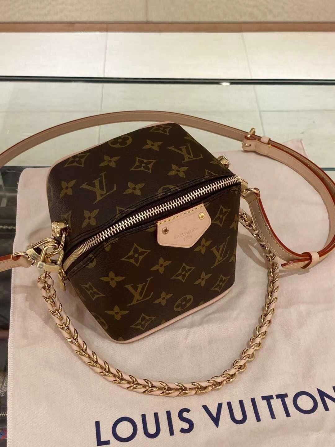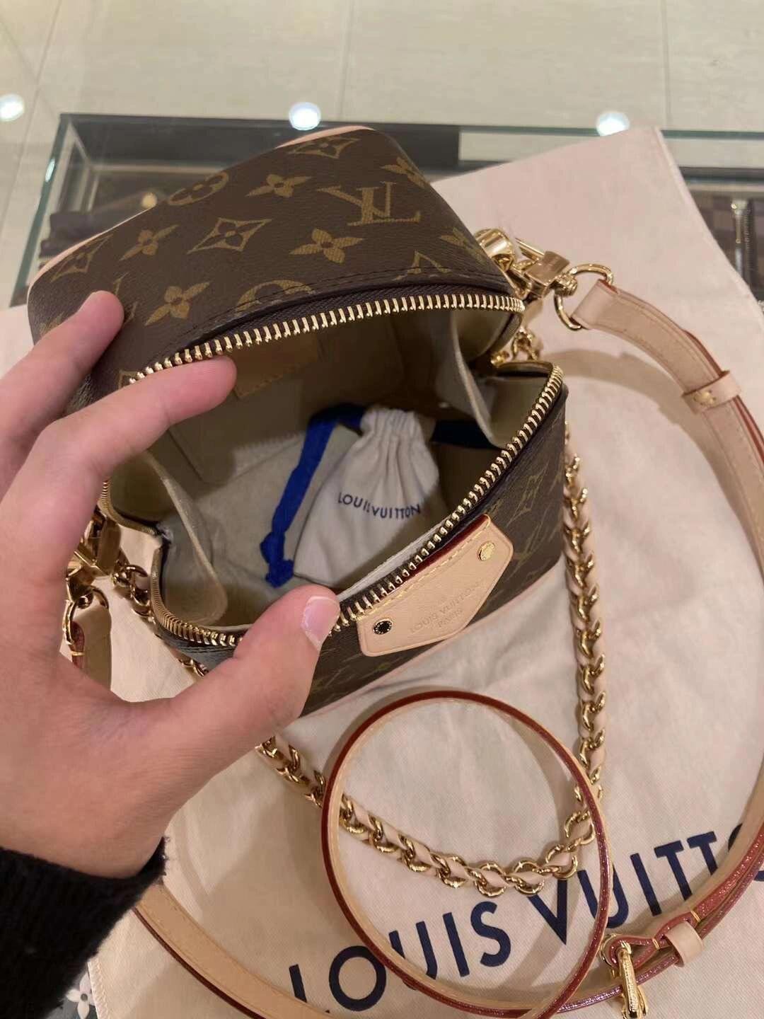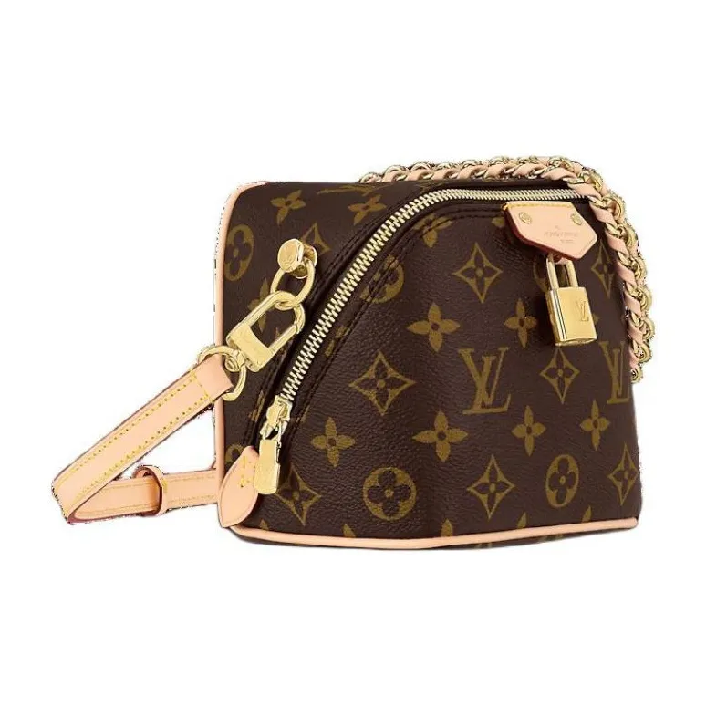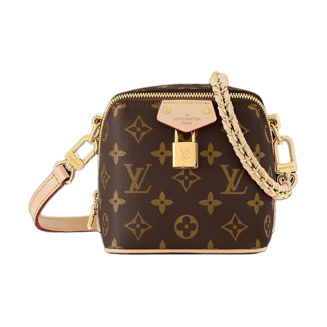 The Maison salutes its travel heritage with the Just In Case handbag. Made from Monogram canvas with natural cowhide-leather trim, this compact model keeps essentials – smartphone, keys, makeup – always close at hand. Detailed with a signature padlock and key bell, the bag is fitted with a leather-braided chain and a leather strap, both removable, for a variety of modern carry options.