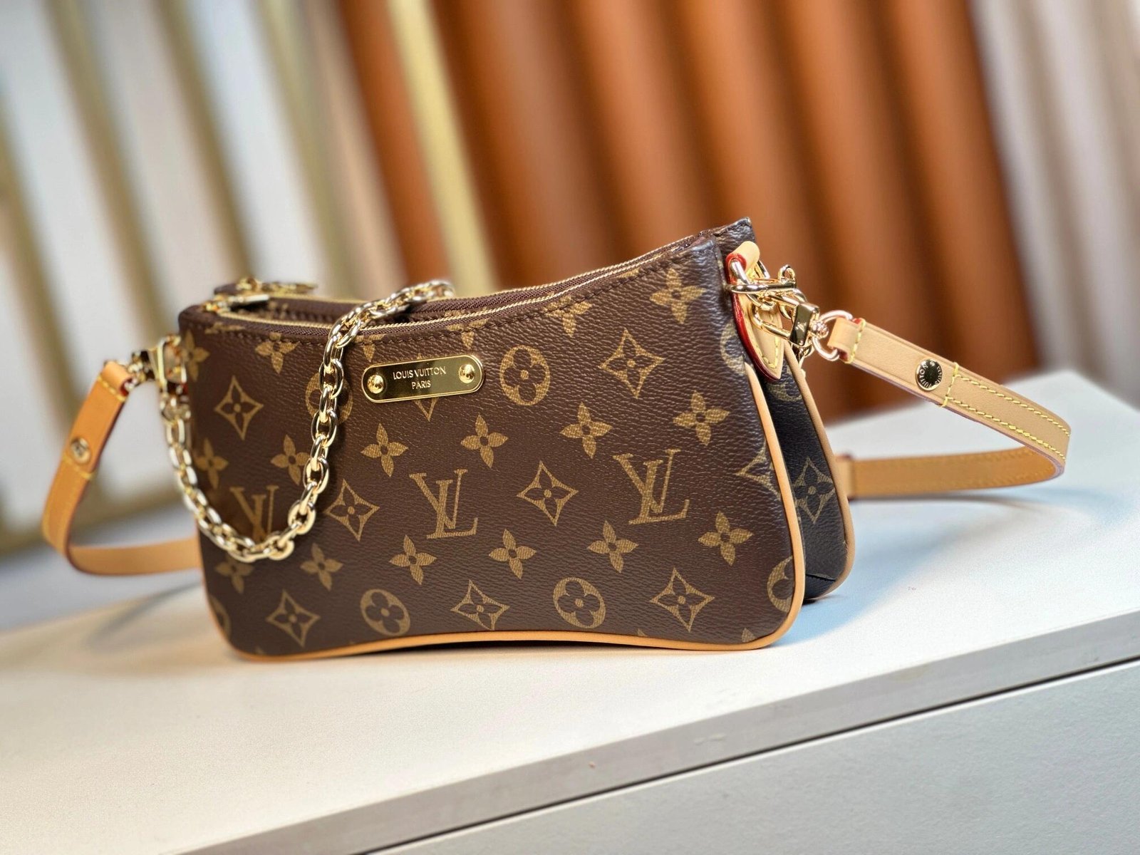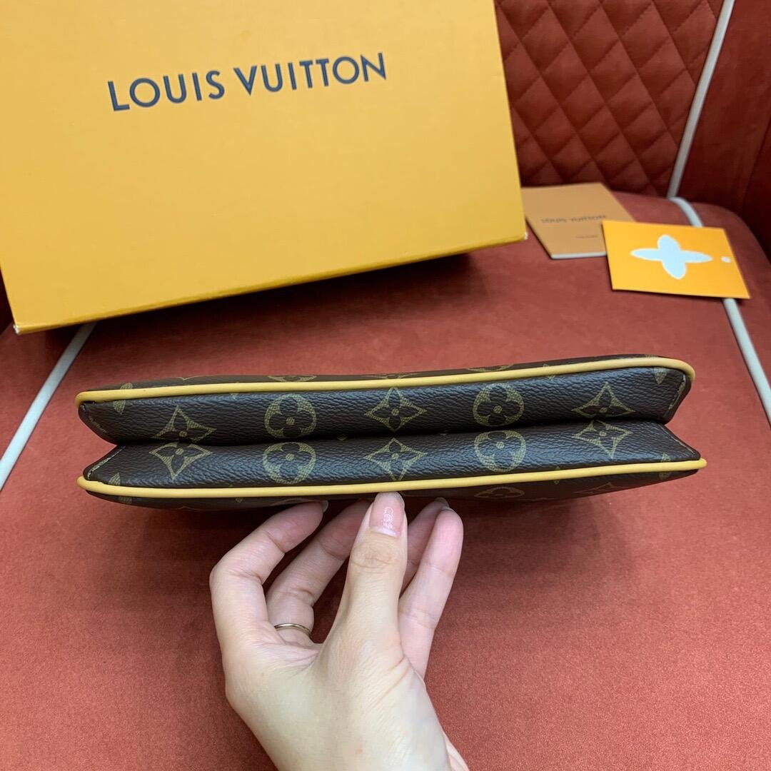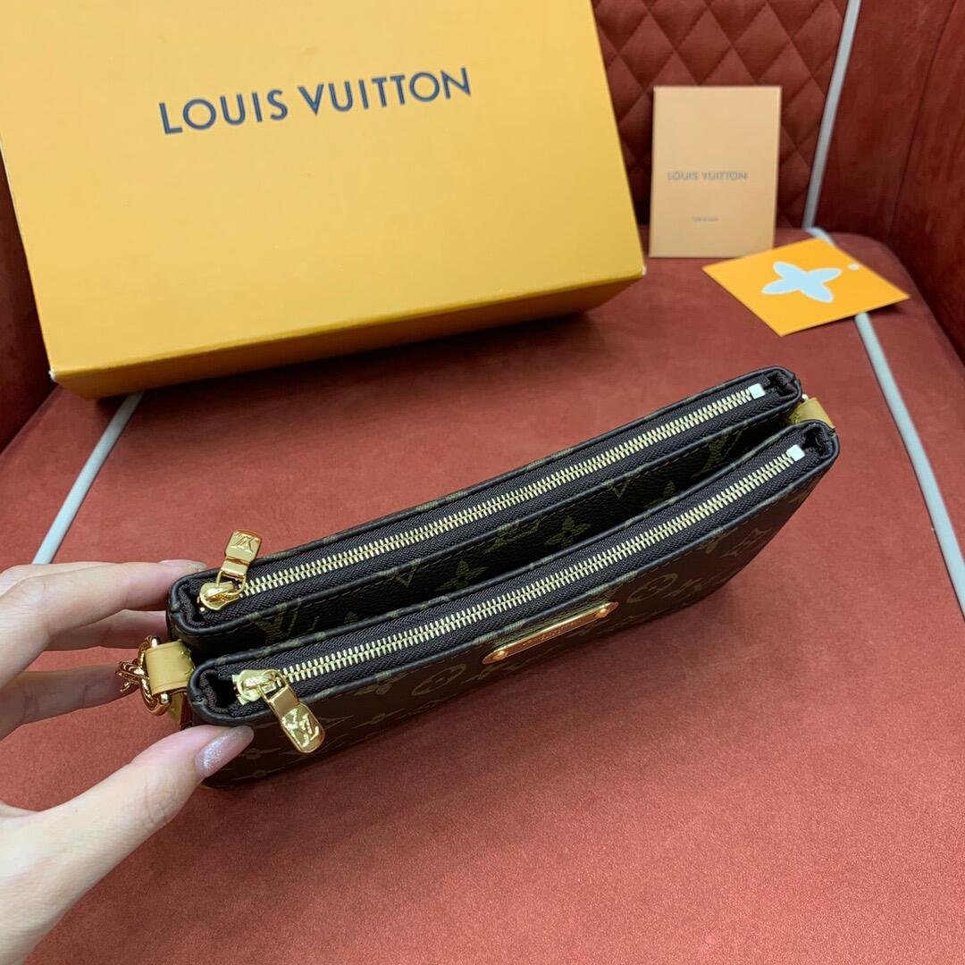 The Liv pochette in Monogram canvas is designed to fit snugly under the arm. It comes with a detachable gold-tone chain and a removable, adjustable double strap in Louis Vuitton’s emblematic natural cowhide leather. A secure, double-zip closure and an engraved, gold-tone plaque finish this stylish piece.