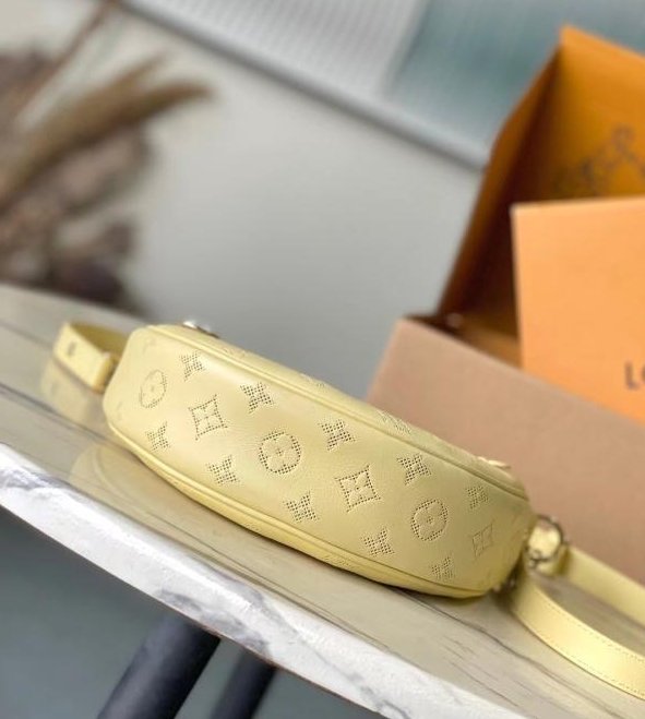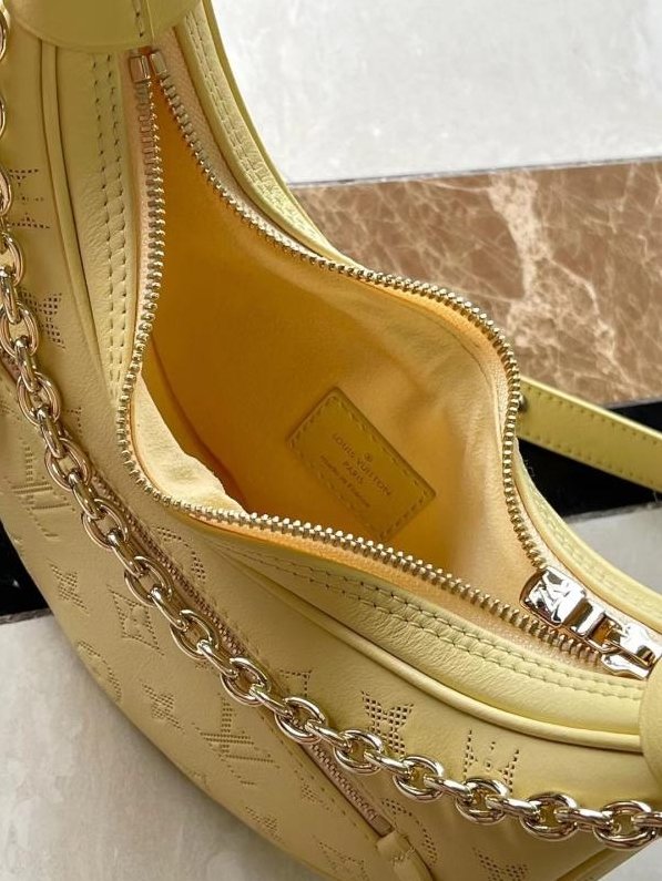 This Loop handbag is made from calfskin with a Monogram motif that at first looks to be perforated into the leather. Closer inspection reveals that the Monogram is embossed into the cowhide. A removable, pale-gold-color chain and a cross-body shoulder strap give carry options. The front pocket closes with a Monogram Blossom zip pull.