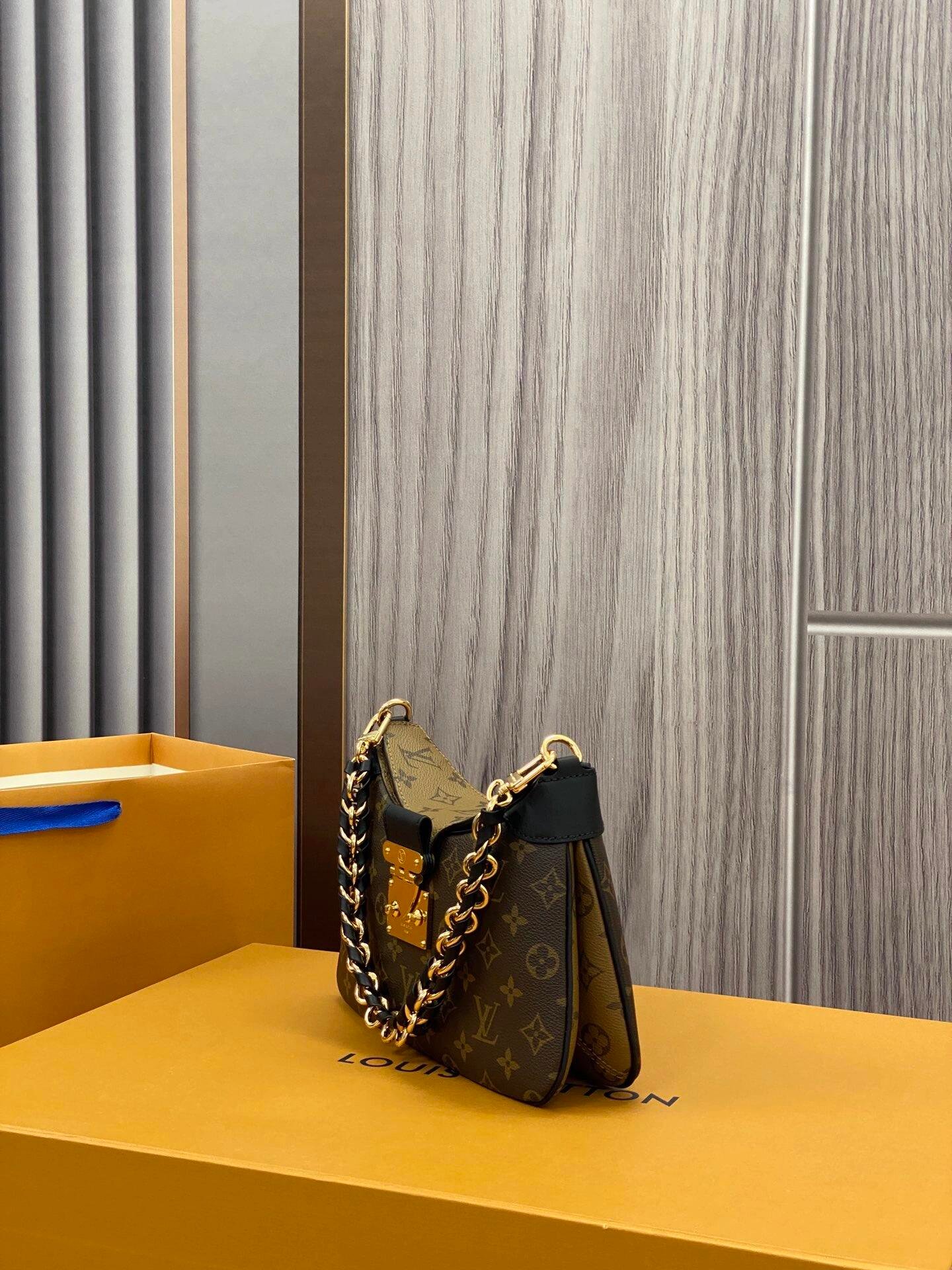 Inspired by the Maison’s archives, the casual yet sophisticated LV Twinny is the Monogram handbag of the season. Crafted from a mix of Monogram and Monogram Reverse canvas with black leather trim, it is detailed with an iconic S-lock and a braided chain handle. The bag lends itself to all manner of stylings: from elbow and shoulder to short or long cross-body wear.