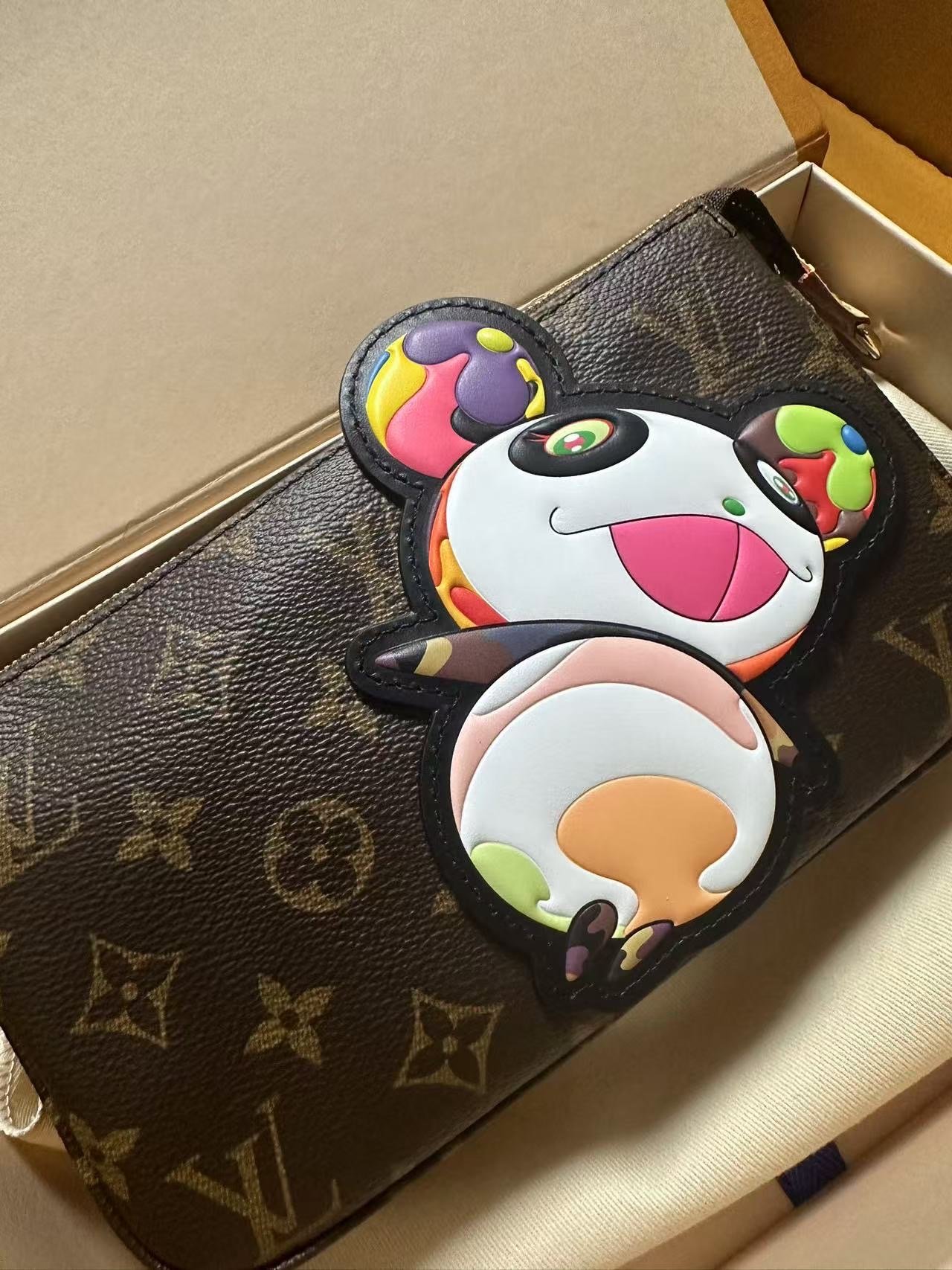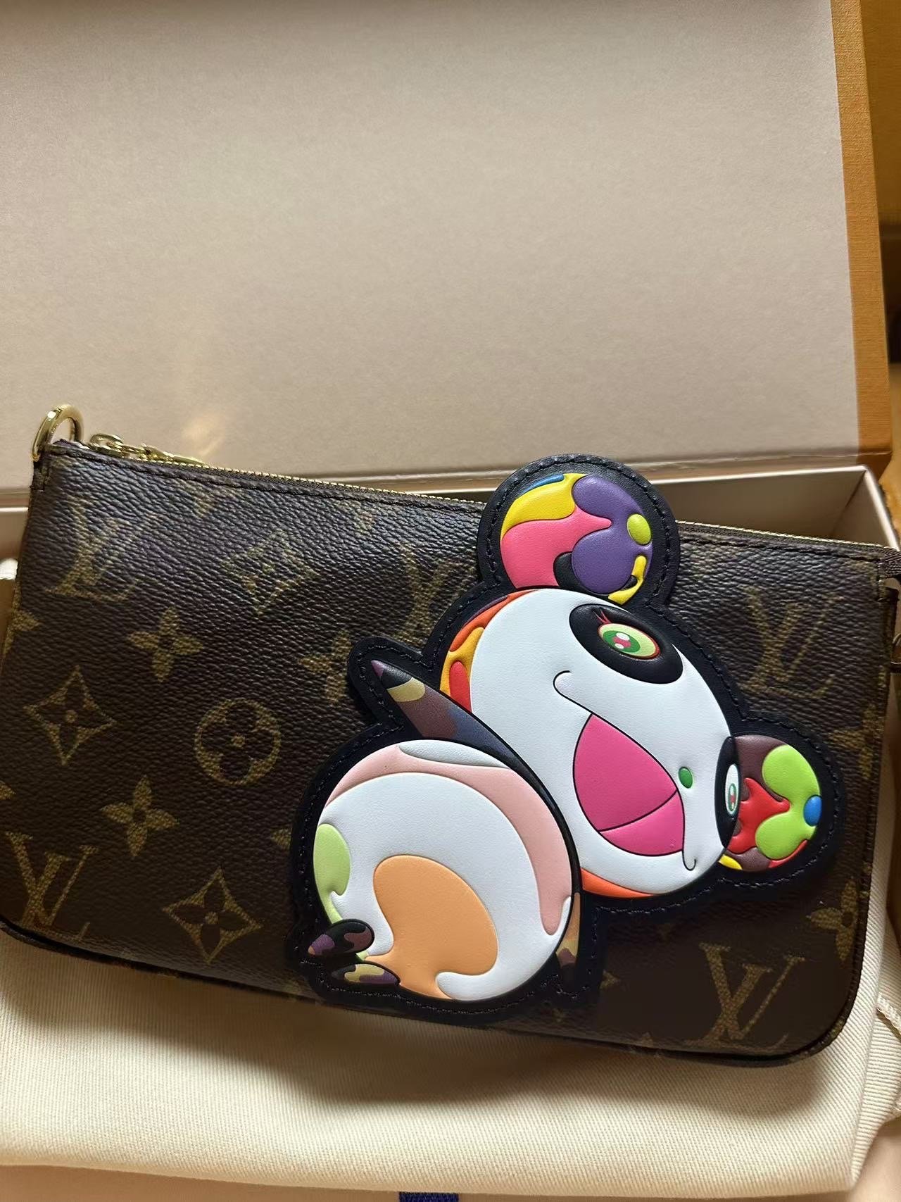 The House’s classic Pochette Accessoires makes a vibrant statement as part of the re-edition of the Louis Vuitton x Murakami collection. Crafted from timeless Monogram coated canvas, the silhouette of the pouch is reworked with the artist’s playful Panda character in vibrant pop colors. The natural cowhide leather strap and chic golden chain are both removable for versatile styling options, while a zipper fastening keeps daily essentials secure.