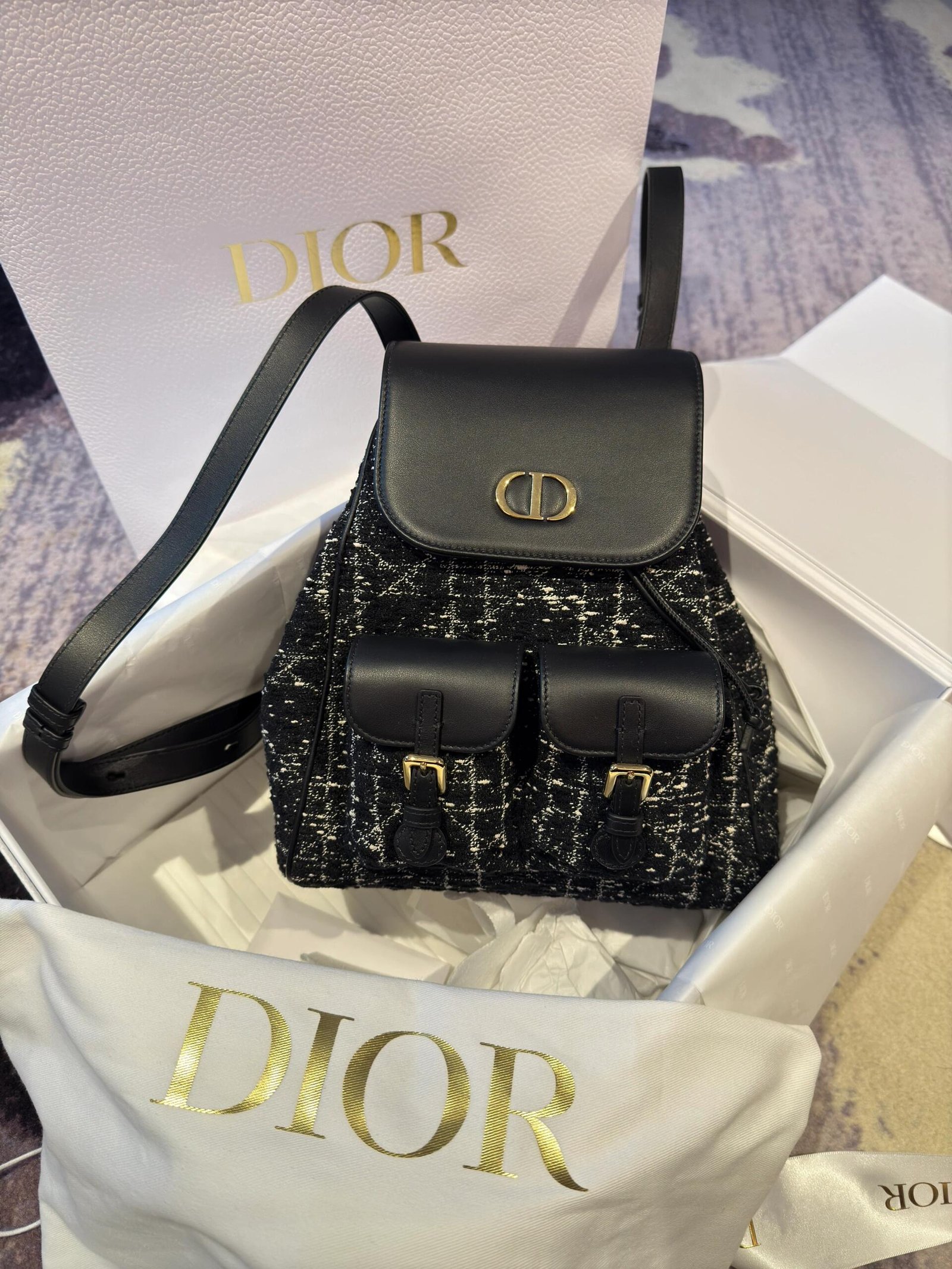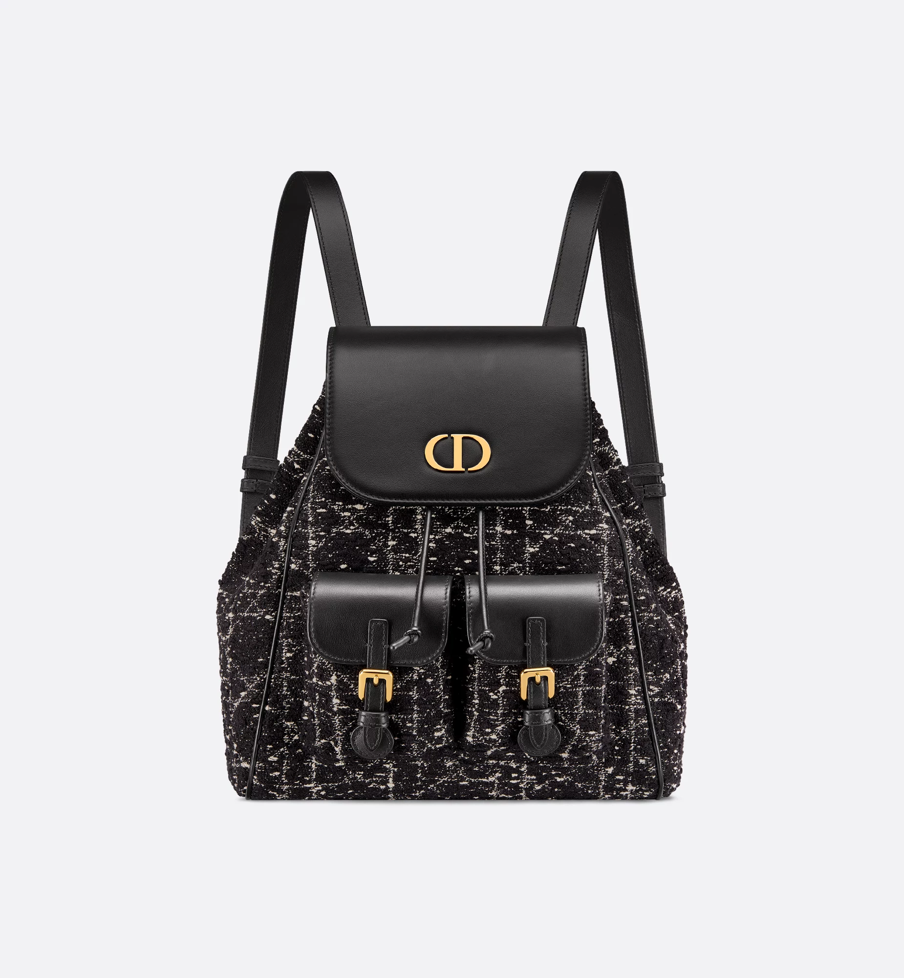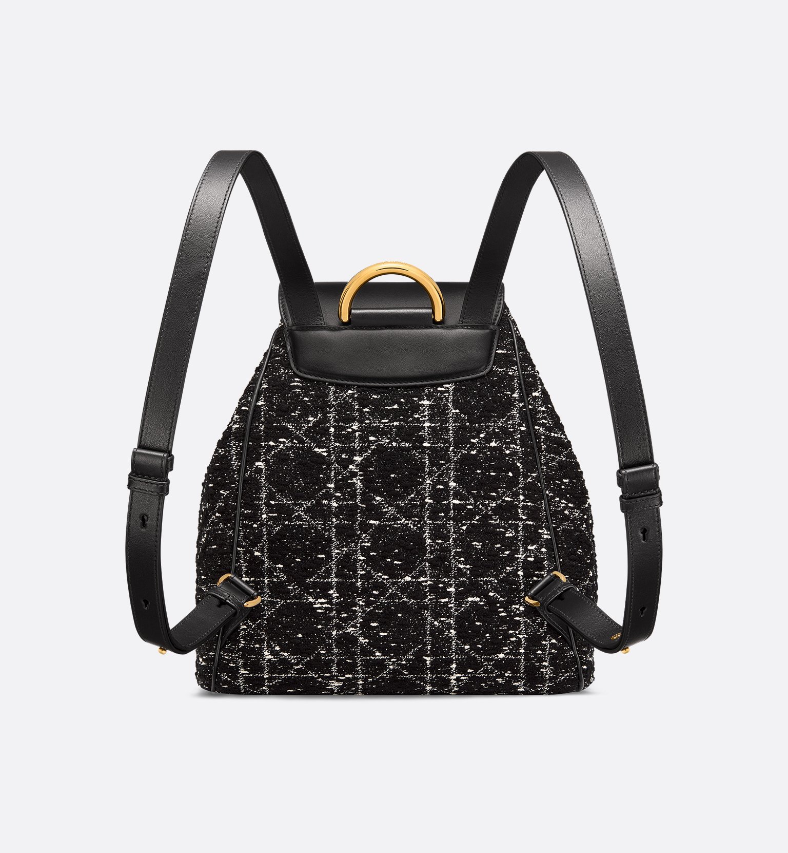 The Dior Caro backpack embodies modern and elegant style. Crafted in black tweed with a white Cannage motif, the design features a flap adorned with an antique gold-finish metal CD signature that opens to reveal a spacious drawstring main compartment, while two small flap pockets can hold all the small essentials. The medium backpack has a gold-finish handle and adjustable straps for added comfort.