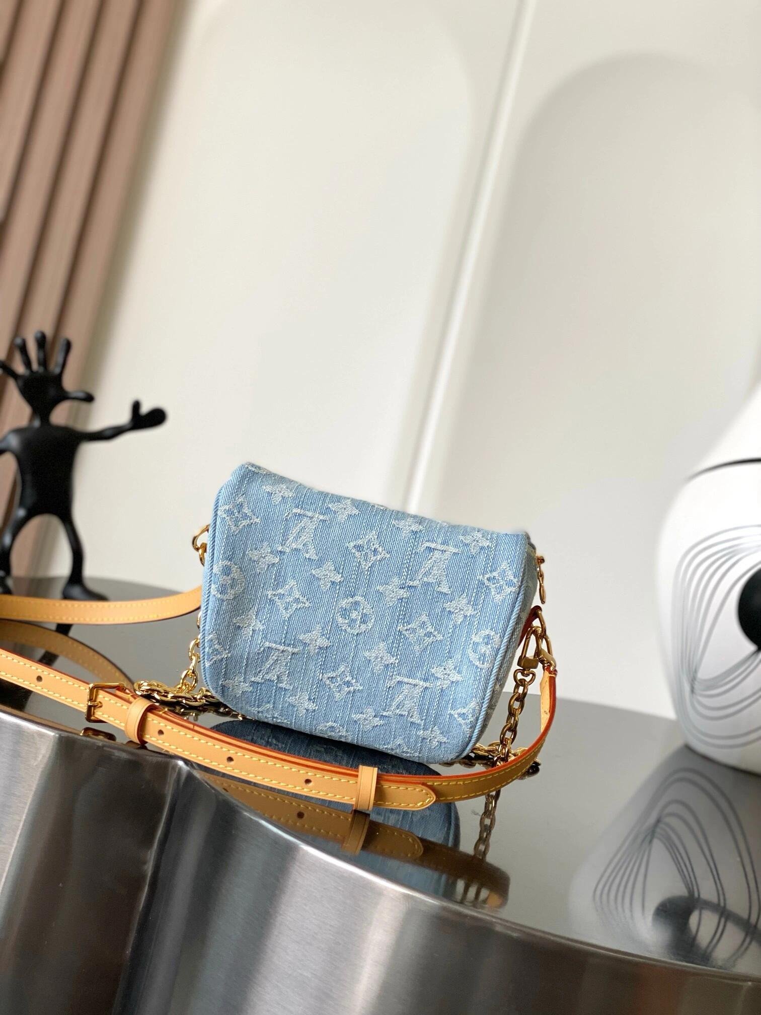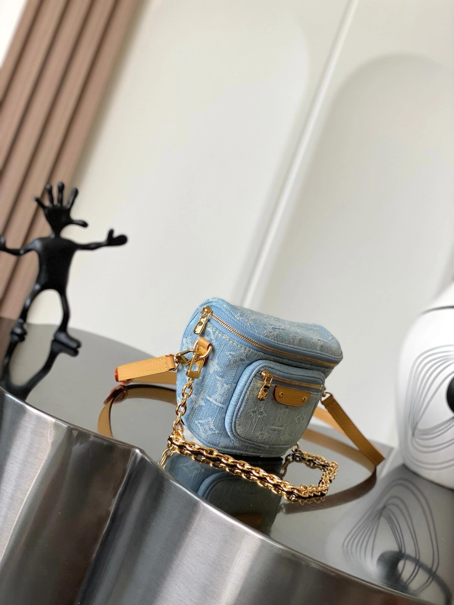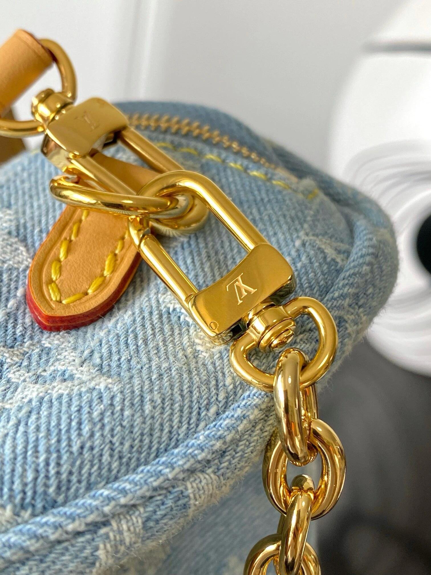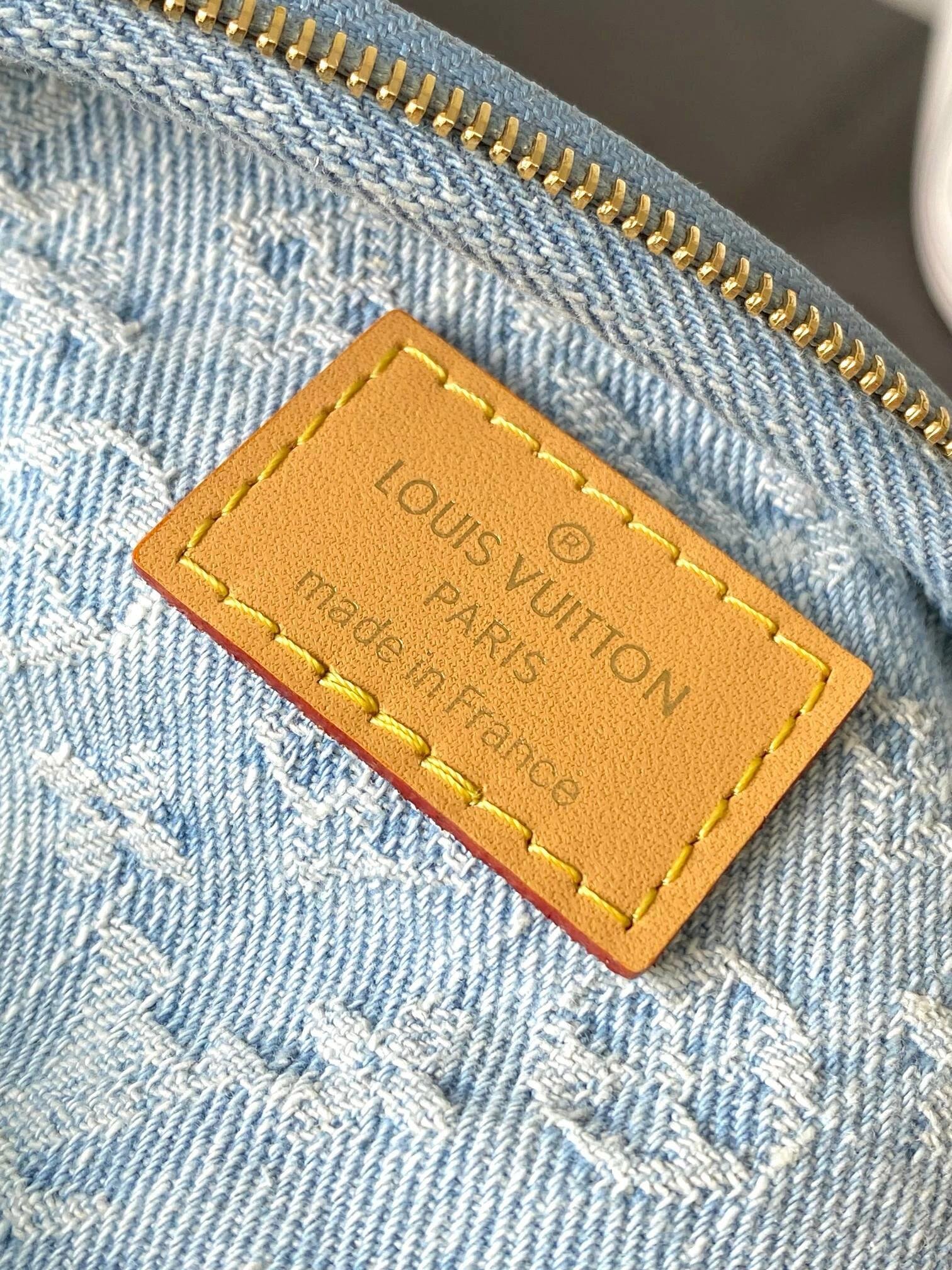 This summery edition of the Mini Bumbag comes in vintage-look denim, which is woven with the Monogram pattern, then bleached and stonewashed. This on-trend model has a zipped main compartment and a zipped front pocket, which is signed with a Louis Vuitton-embossed leather label. Its removable chain and removable, adjustable strap offer different carry options.