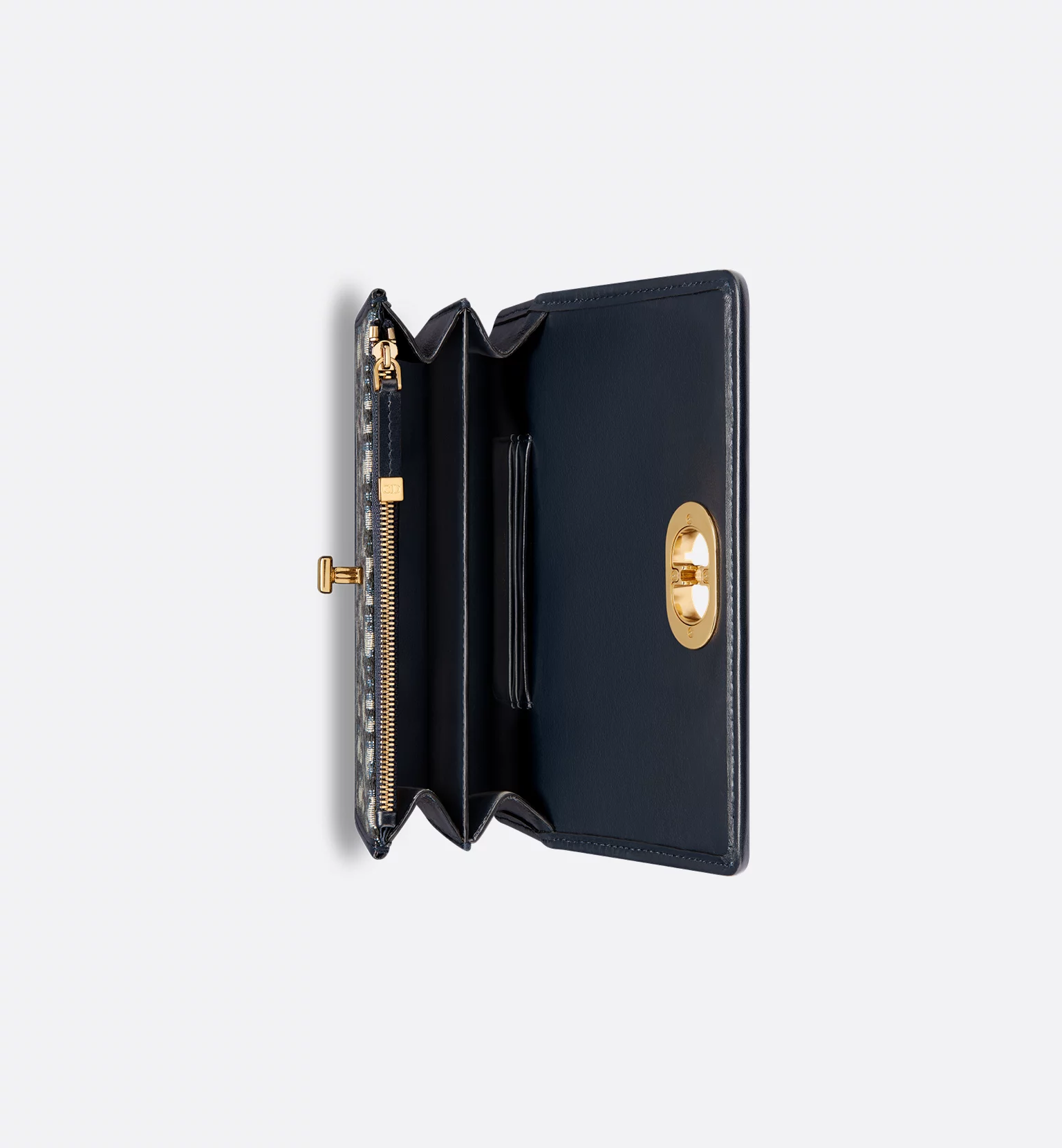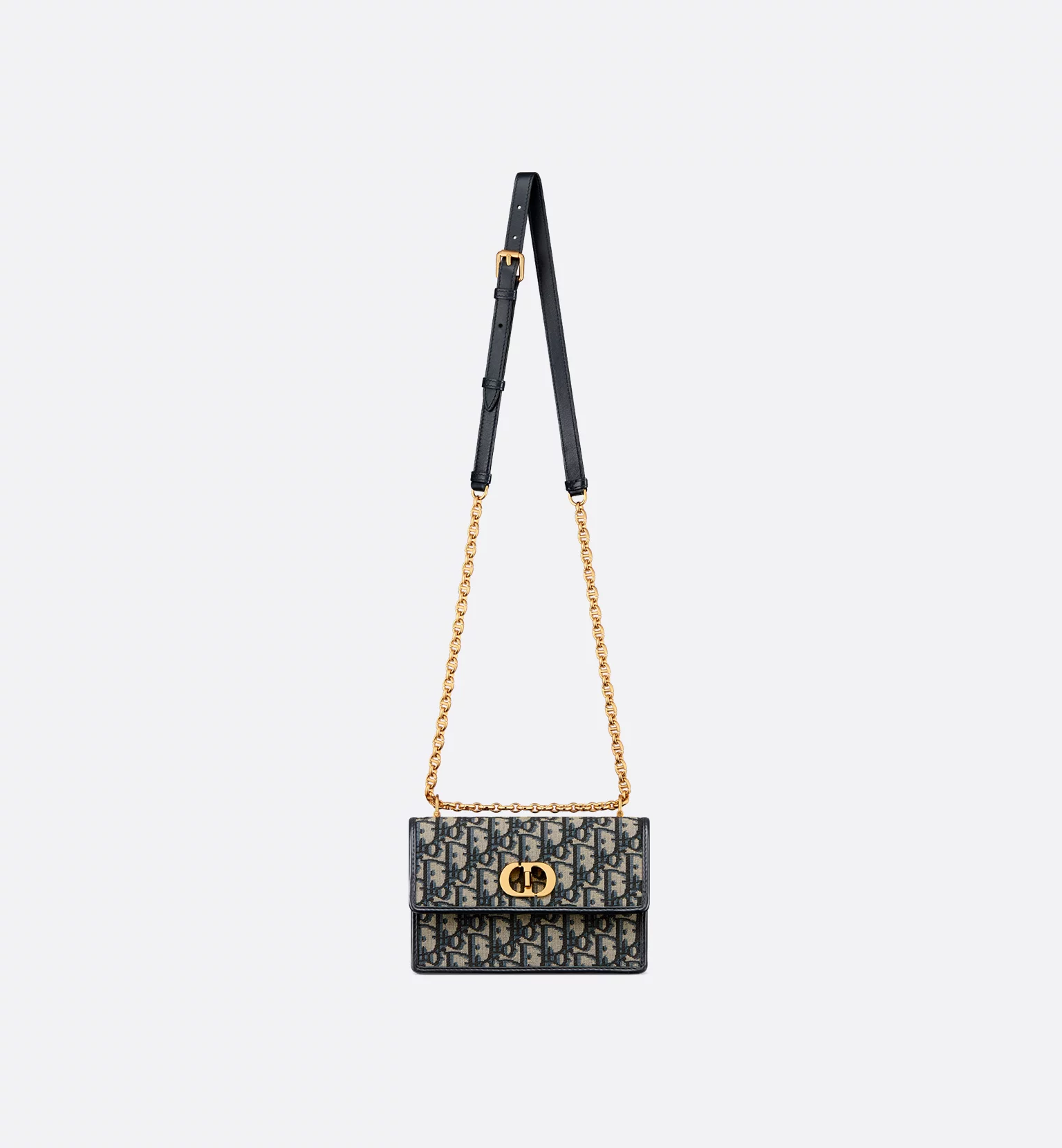 The Miss Caro mini bag combines modernity and timeless elegance. The blue Dior Oblique jacquard style is embellished with tonal leather detailing and has a flap accented by an antique gold-finish metal CD twist clasp inspired by the seal of a Christian Dior perfume bottle. The adjustable chain strap has a leather insert for added comfort when carrying the bag by hand, wearing it over the shoulder or crossbody.