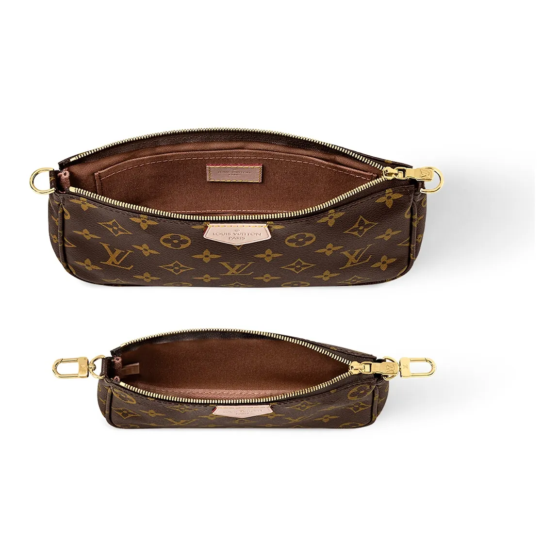 The Multi Pochette Accessoires is a hybrid cross-body bag with multiple pockets and compartments that brings together a Pochette Accessoires, a Mini Pochette Accessoires and a Round Coin Purse. Fashioned from Monogram canvas with a mini Monogram pattern on the sides of the two pochettes, it has both a removable gold-tone chain and an adjustable Louis Vuitton inscribed Jacquard strap for multiple carrying options.
