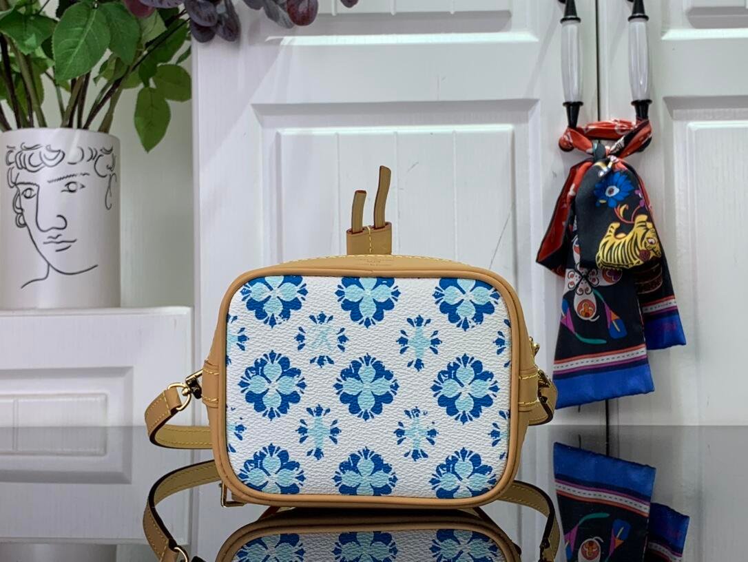 The Nano Noé bag is revisited with a Mediterranean-style Monogram Tiles print on coated canvas as part of the LV By the Pool collection, which evokes travel to sunny destinations. Leather trim complements this design, notably on the removable top handle and removable, adjustable shoulder strap, which offer different carry options.