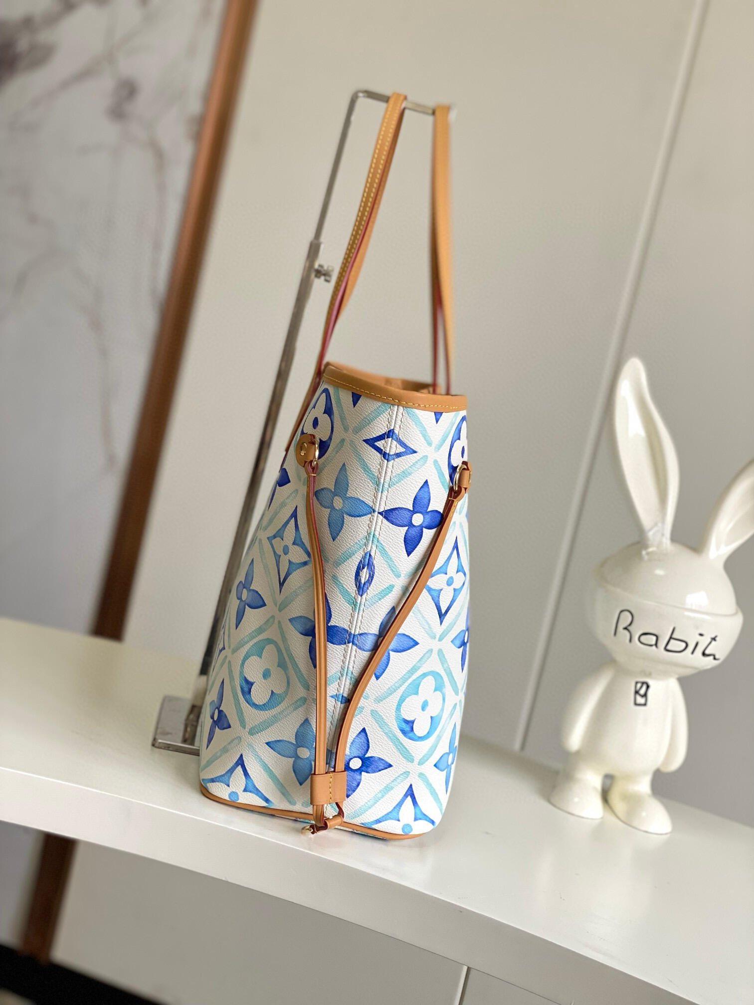 The Neverfull MM tote is made from Monogram Tiles canvas with leather trim along the top of the bag and on the handles. The Monogram pattern has a watercolor aspect and features the LV Circle in the center. It comes with a zipped pouch, with a complementary print, that can be removed and used separately.