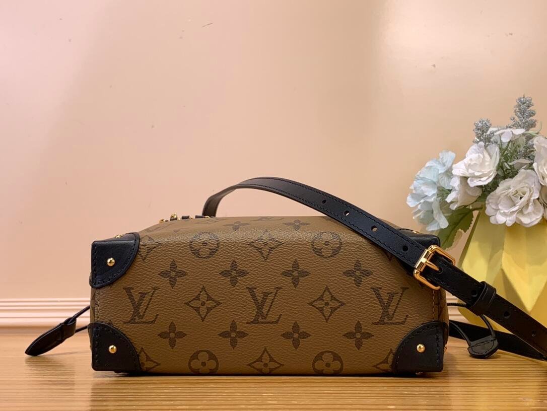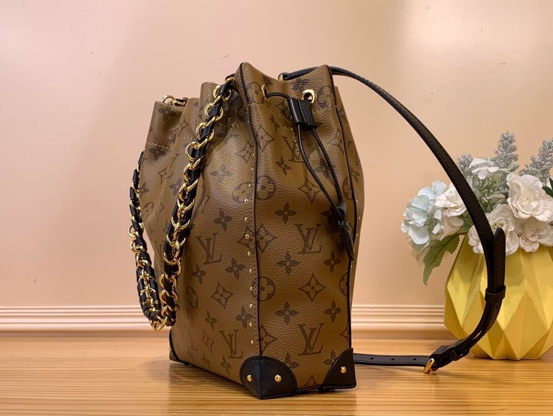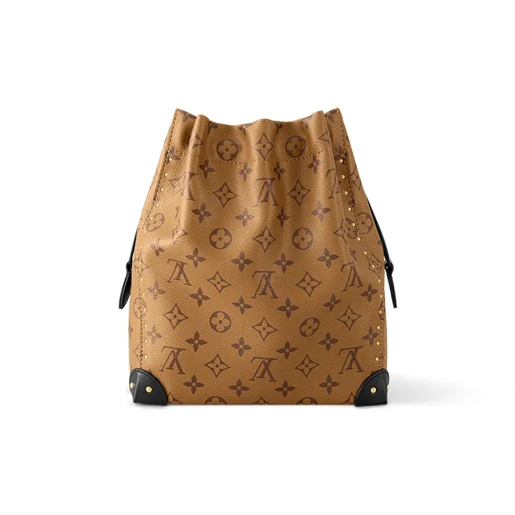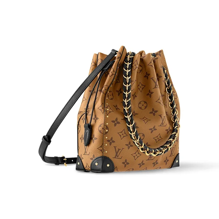 The historical Noé handbag is reinterpreted for Cruise 2025. This version, which is a new member of the Trunk family, showcases iconic DNA details, including leather corners and a drawstring closure. The versatile design is crafted from canvas patterned with the House’s signature Monogram Reverse and is accented with a gold-toned braided chain. Follow the runway styling and carry it by hand, or wear it cross-body.