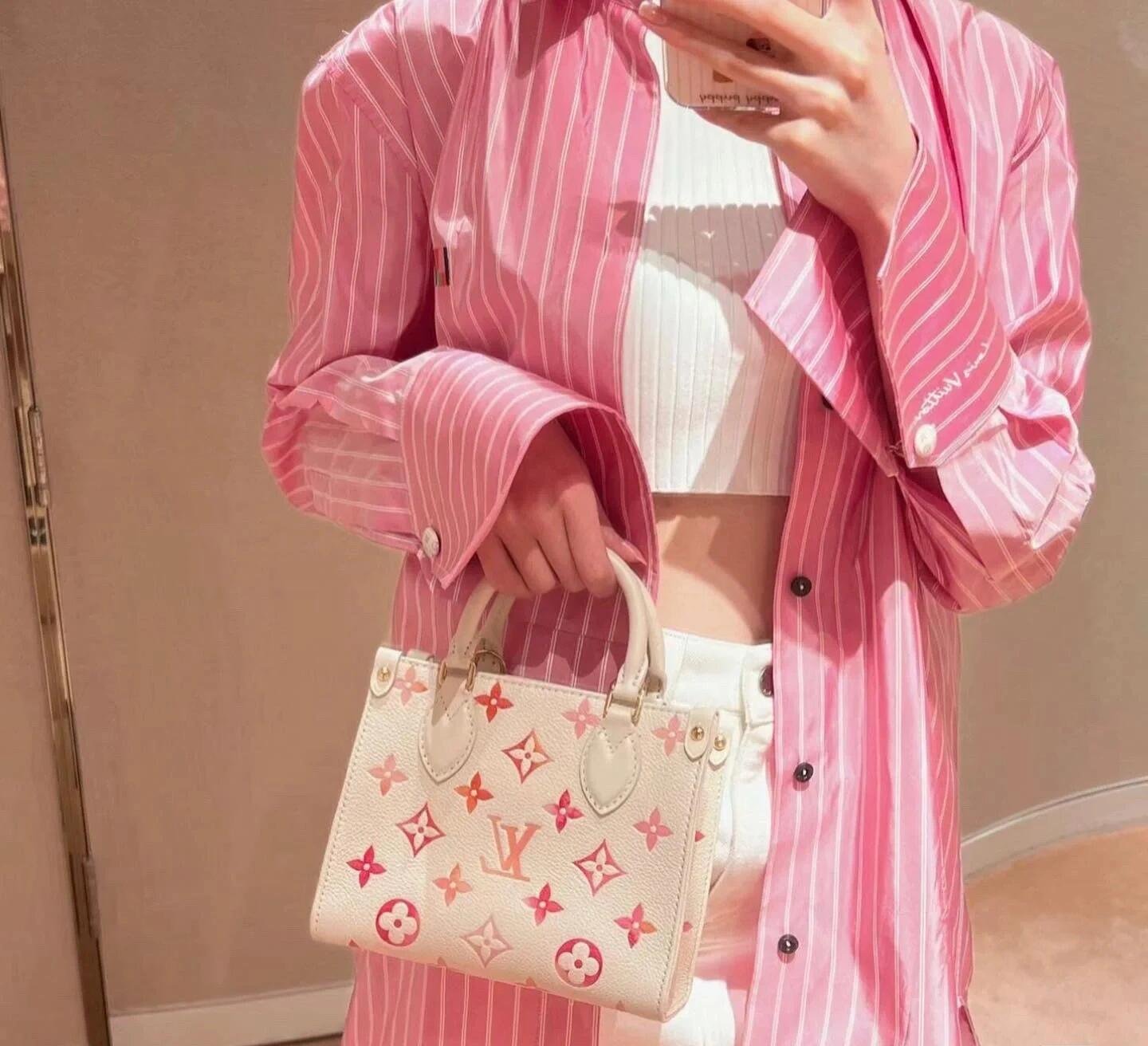 Part of the Sunrise Aquarelle collection, this OnTheGo BB handbag is fashioned from Monogram Empreinte leather in a colorway of orange, pink and fuchsia, inspired by sunrise. The LVs and Monogram Blossoms printed on the leather have a watercolor aspect. A hint of glossiness is screen-printed onto the surface, like glistening drops of morning dew. Two rolled-leather top handles and a removable and adjustable strap enable various carry options.