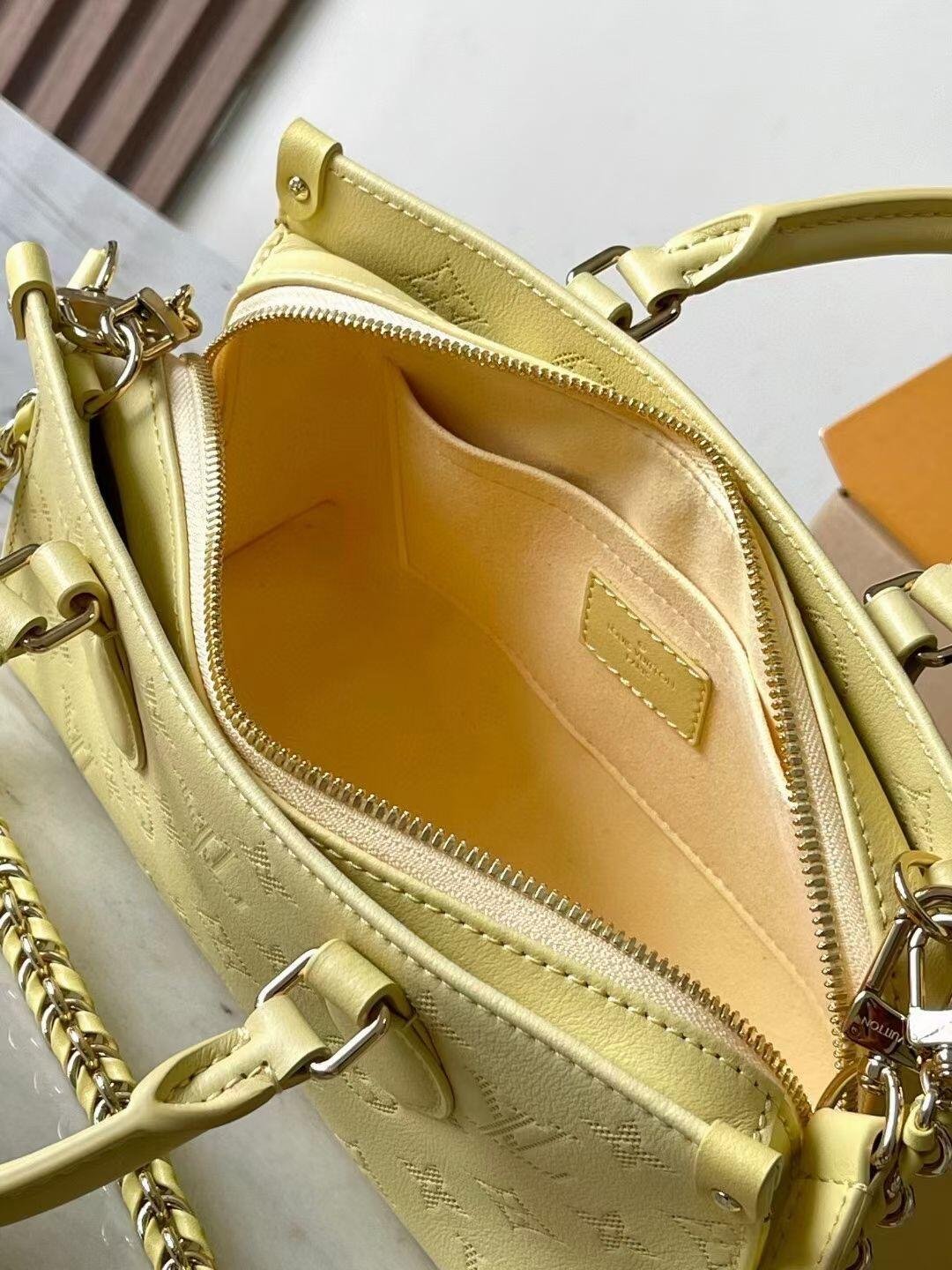 The elegantly elongated silhouette, exquisite calf leather, and subtle pale-yellow colorway all come together to make this OnTheGo East West bag truly eye-catching. It’s signed with a Monogram Flower name tag attached to the handle. Two articulated top handles and a removable chain-and-leather strap give carry options.