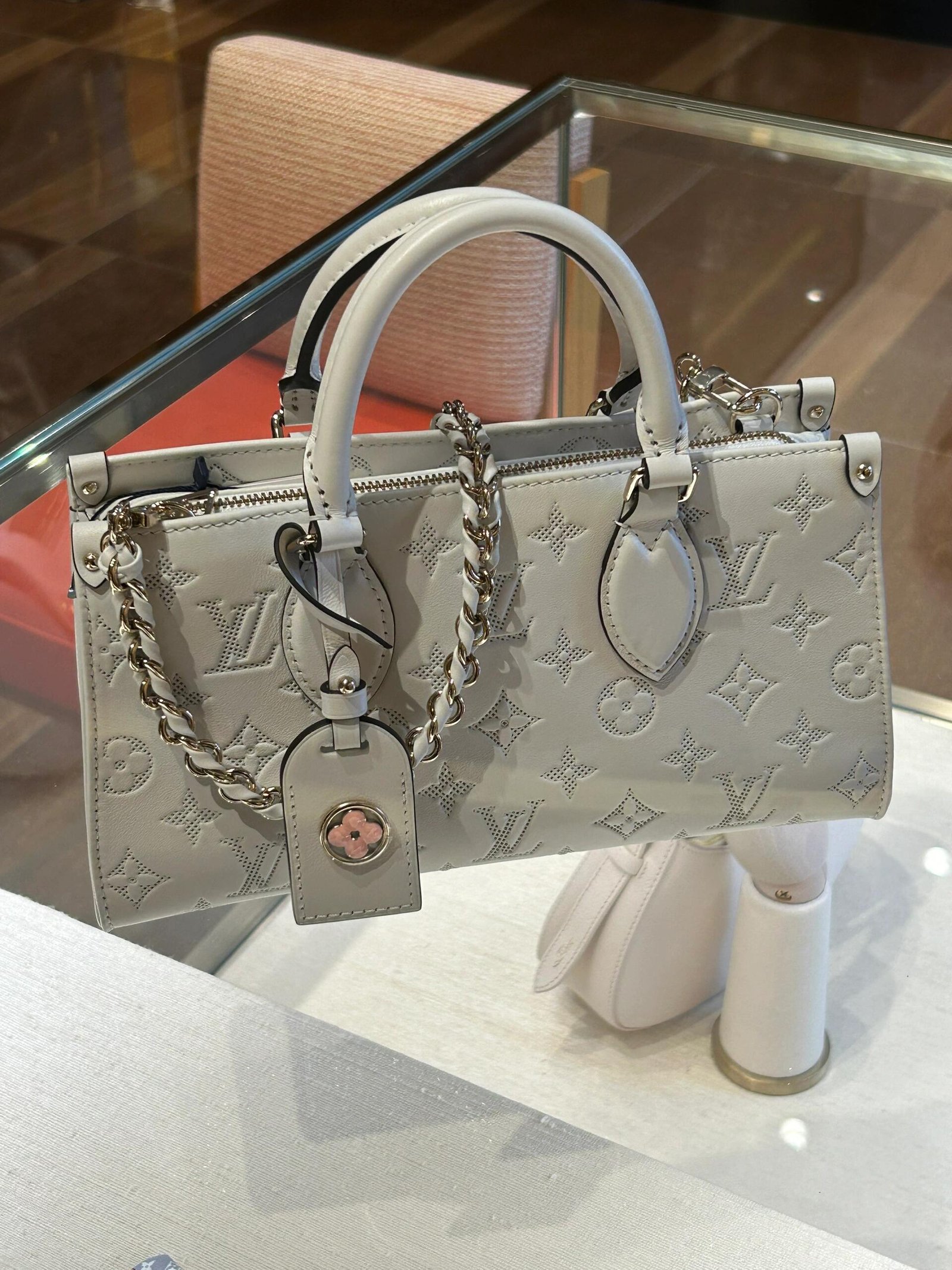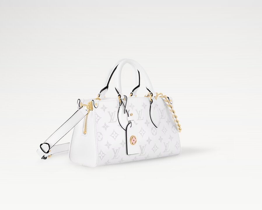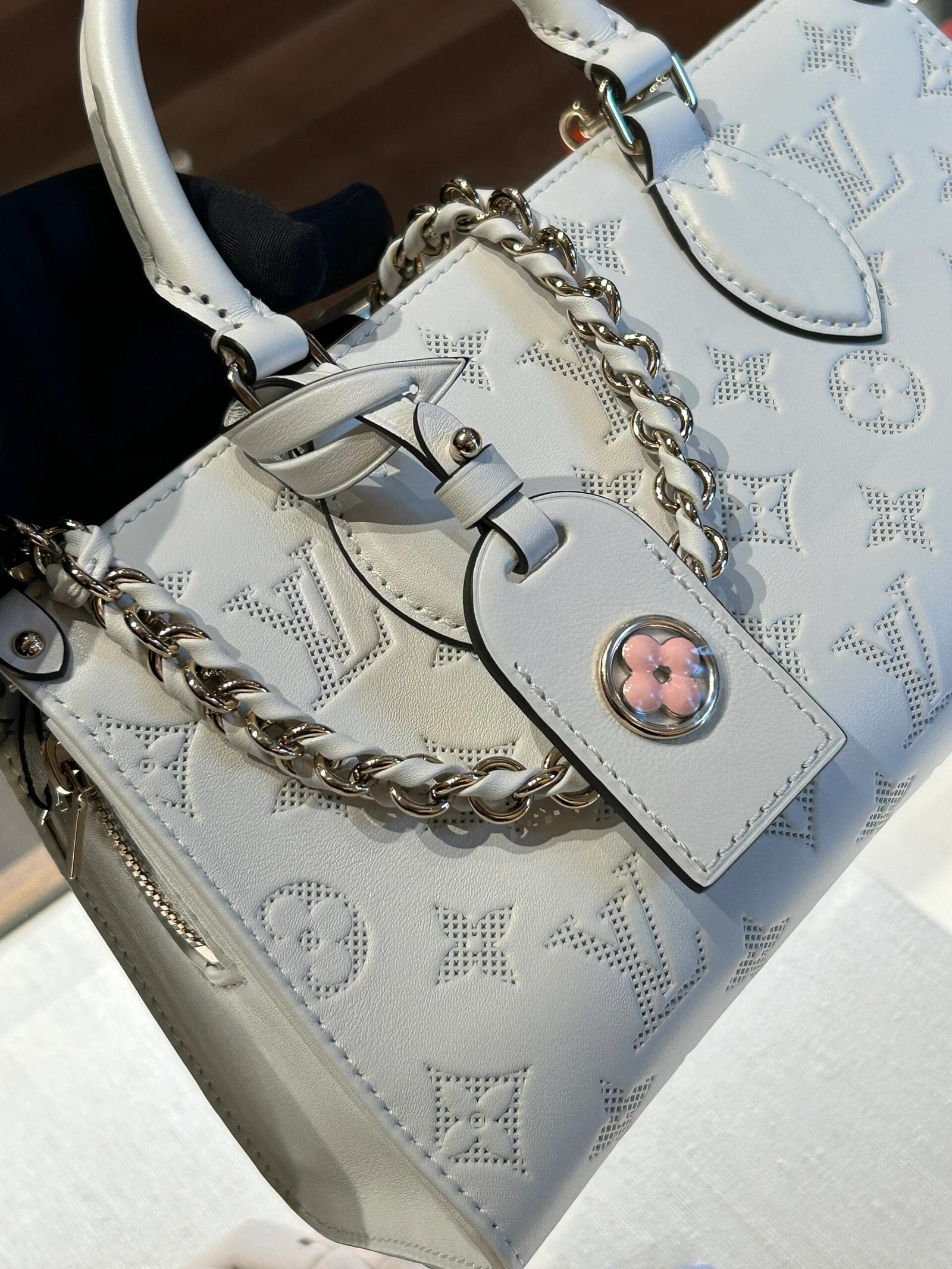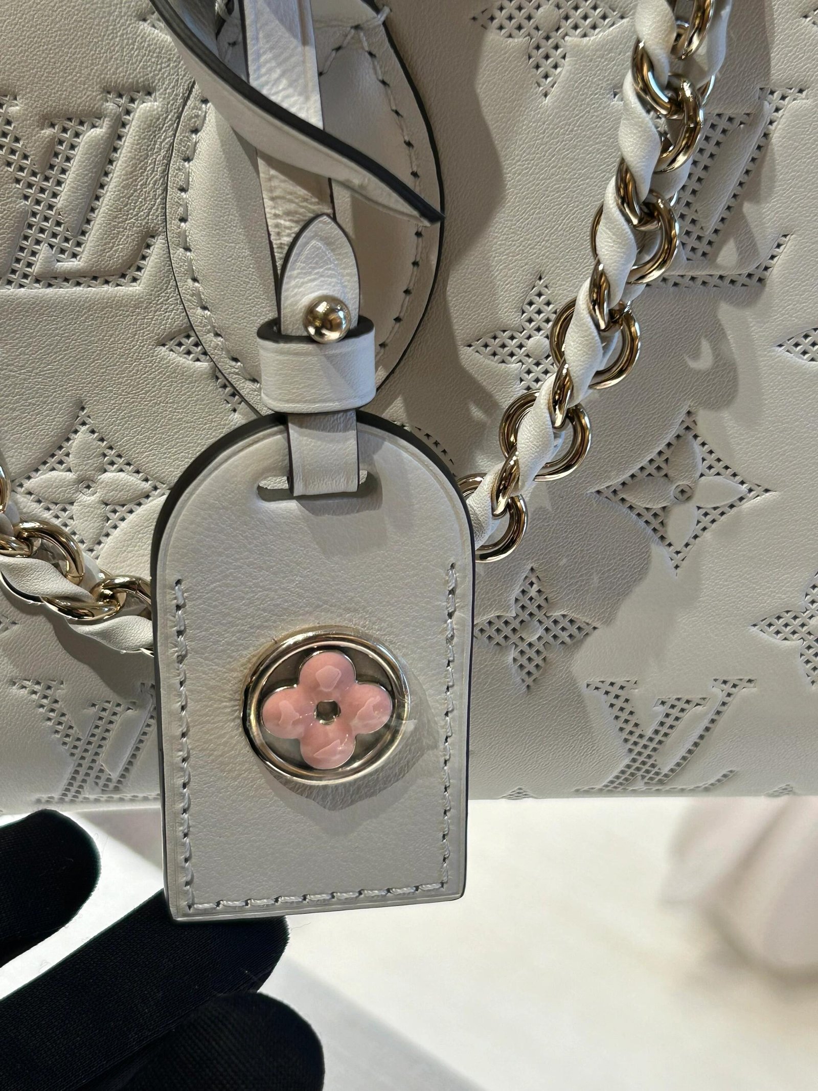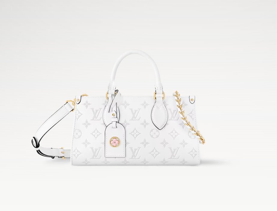 With its beautifully elongated silhouette, the OnTheGo East West handbag is made from calfskin with the Monogram pattern produced with a perforation trompe l’oeil embossing technique. The bag features light-gold-color hardware and a removable name tag, adorned with a Monogram Flower detail inspired by ready-to-wear.