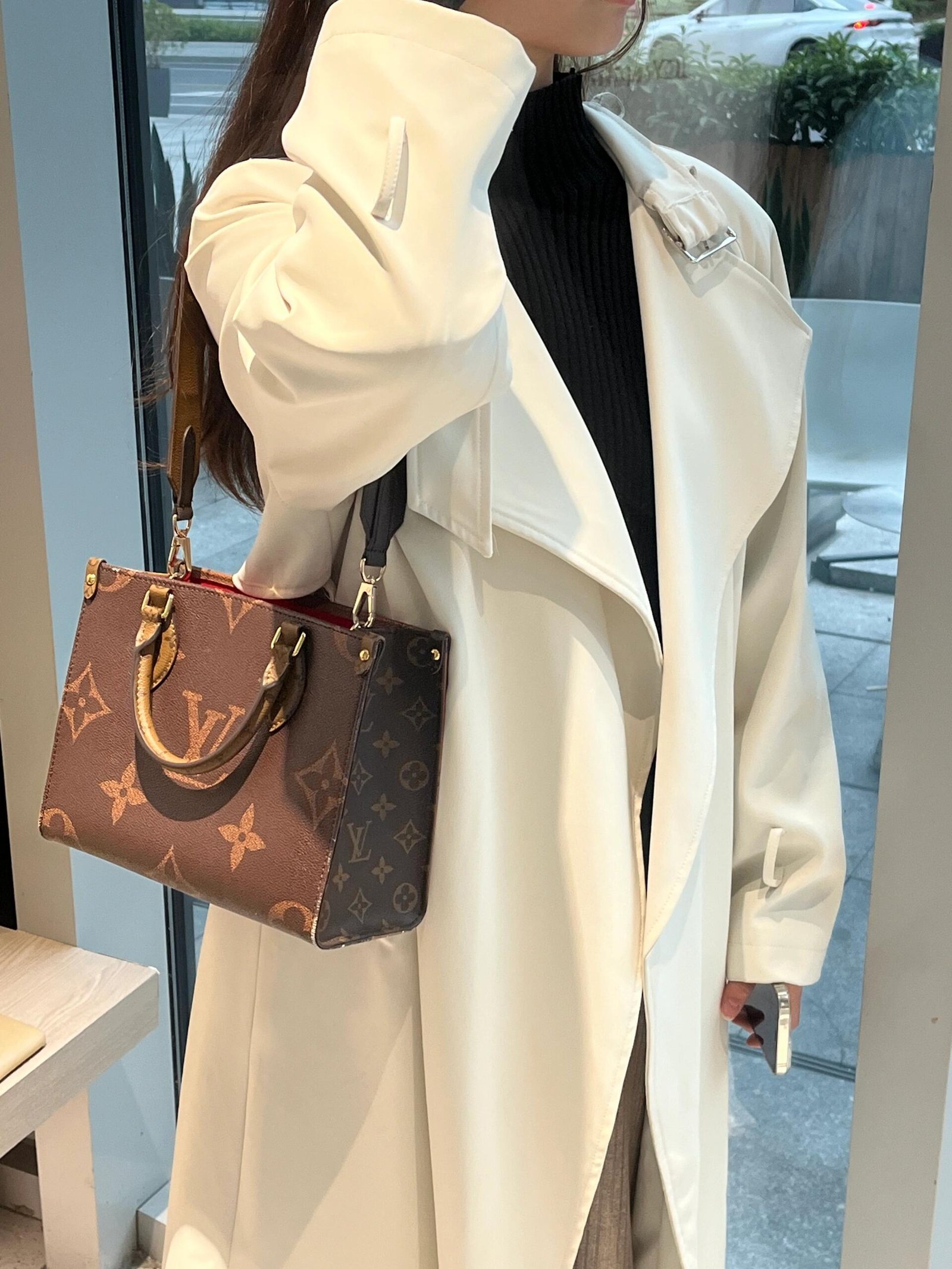 Both fashionable and functional, this OnTheGo PM tote is an ideal everyday companion. Made from a mix of Monogram and Monogram Reverse canvas with the on-trend Giant pattern, it is fitted with Toron handles and a signature woven jacquard strap in contrasting crème beige. The detachable coin purse is perfect for storing change or tiny treasures.