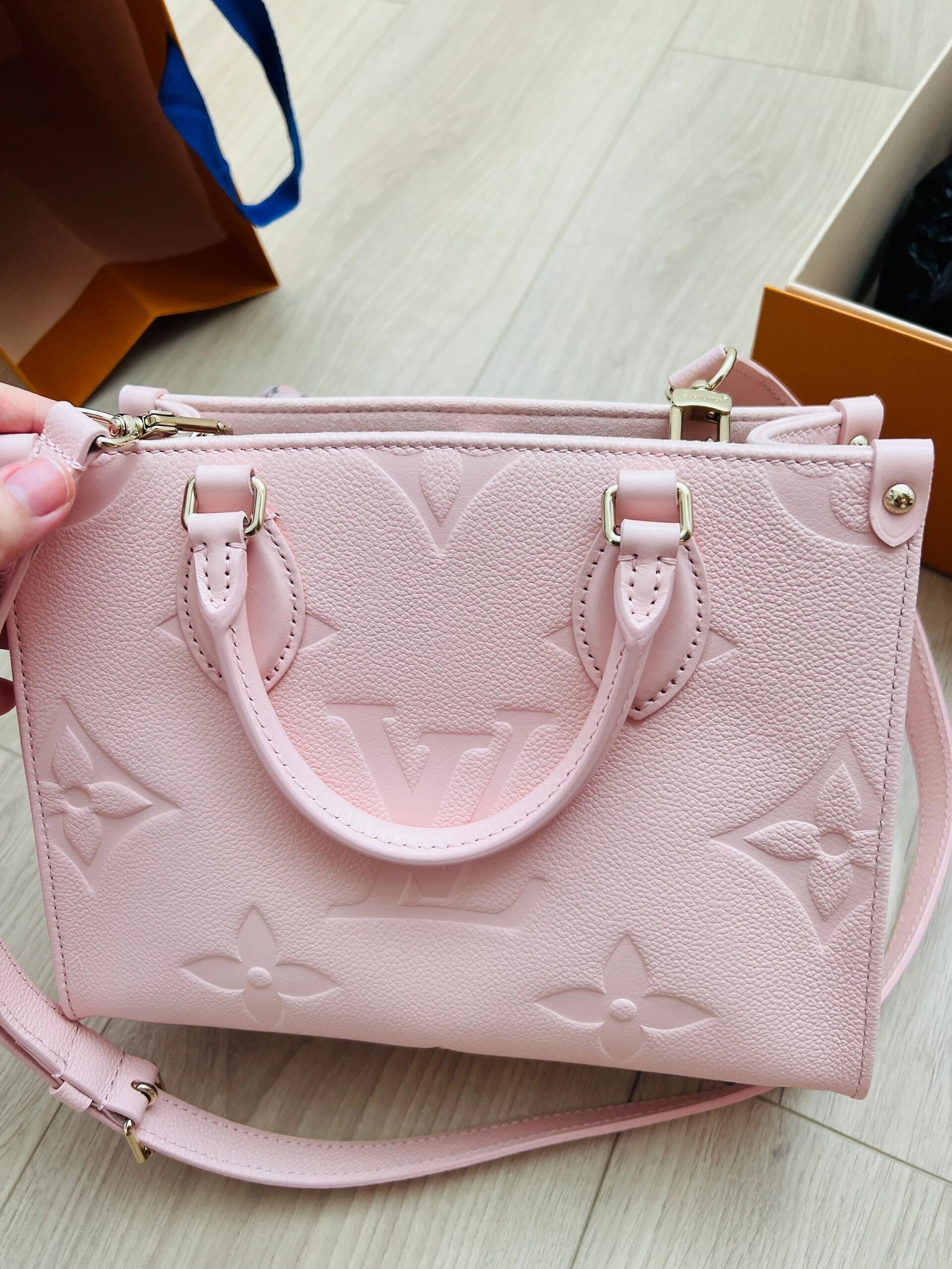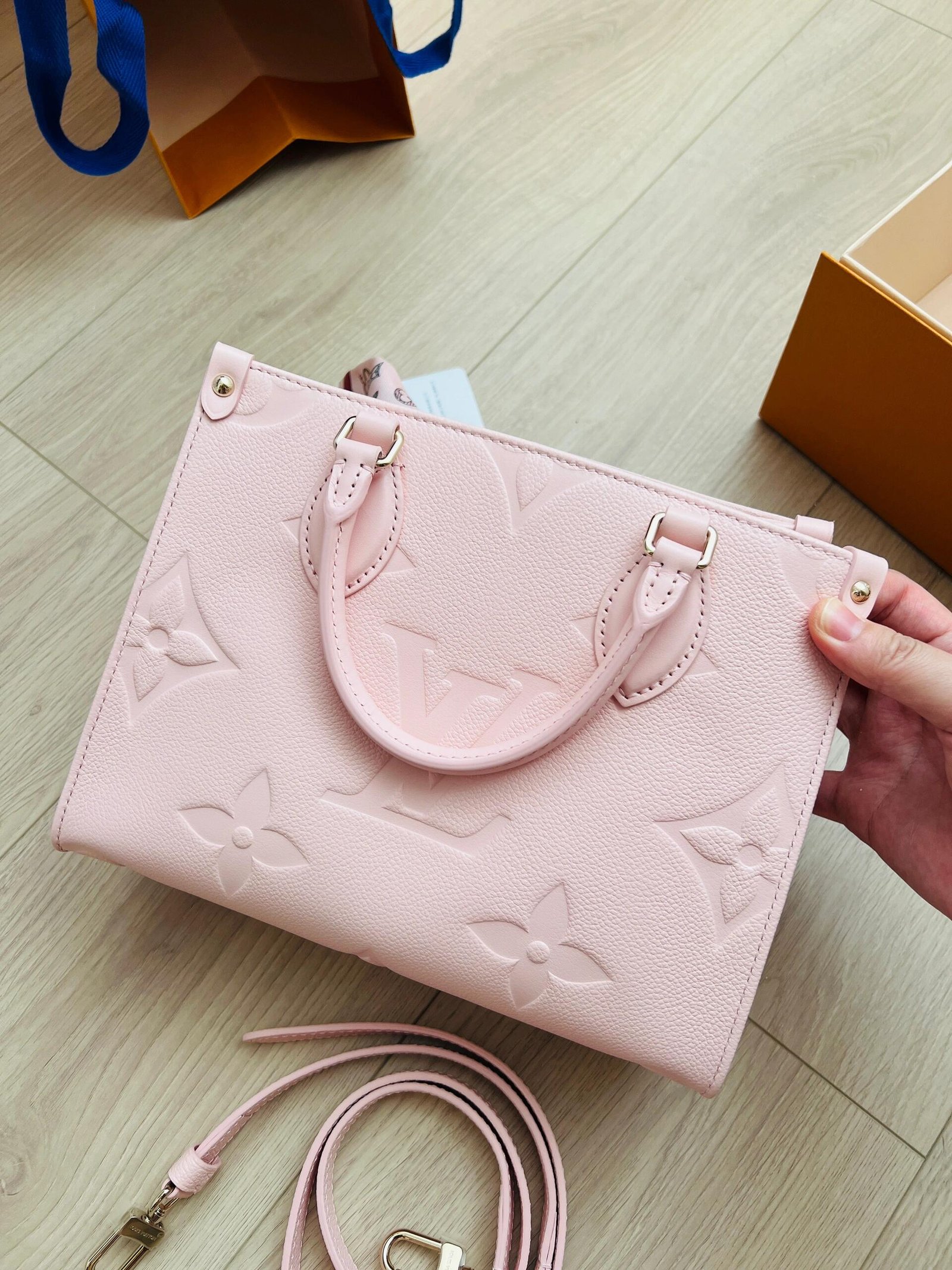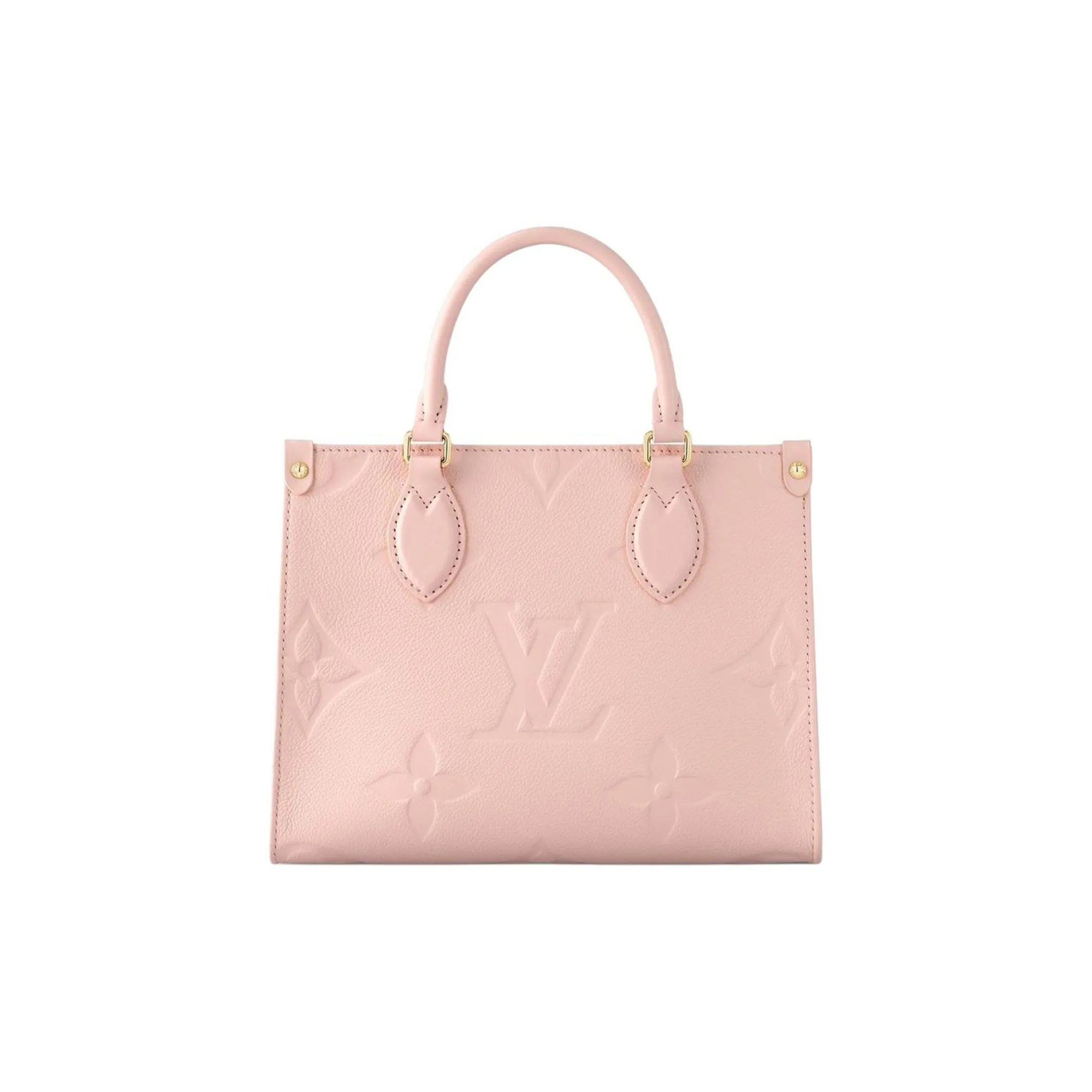 The OnTheGo PM is a tote-style handbag made from pastel-colored Monogram Empreinte leather, with its distinctive Monogram embossing. The four riveted corner-tabs evoke the House’s famed trunks. Inside, a large flat zipped pocket keeps papers and cards organized. Two rolled-leather top handles and a removable and adjustable strap enable various carry options.