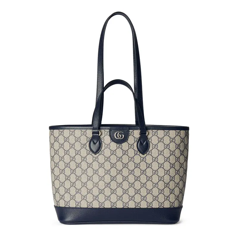 The Ophidia line is reimagined with new sizes and styles, combining top handles and shoulder straps for versatile carry options. This tote bag is crafted from beige and blue GG Supreme canvas, enhanced with the iconic Double G hardware for added charm.