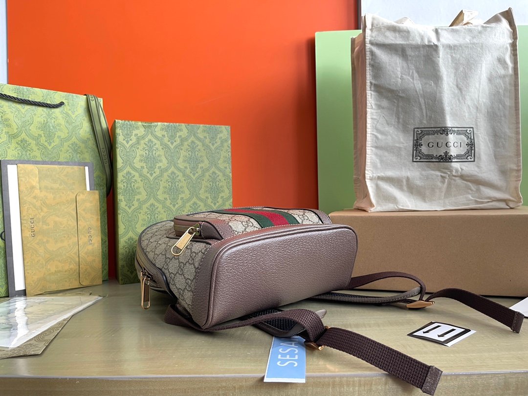 A versatile style that can be used as a travel accessory or a bookbag, the backpack continues to be an important silhouette in the world of Gucci, offered in a variety of sizes and interpretations. Part of the ever-expanding world of Ophidia, it’s crafted in GG Supreme canvas with textured leather trim. The inlaid green and red Web detail and Double G hardware are steeped in the House’s rich history, referencing symbols incorporated in Gucci collections since the ’50s.