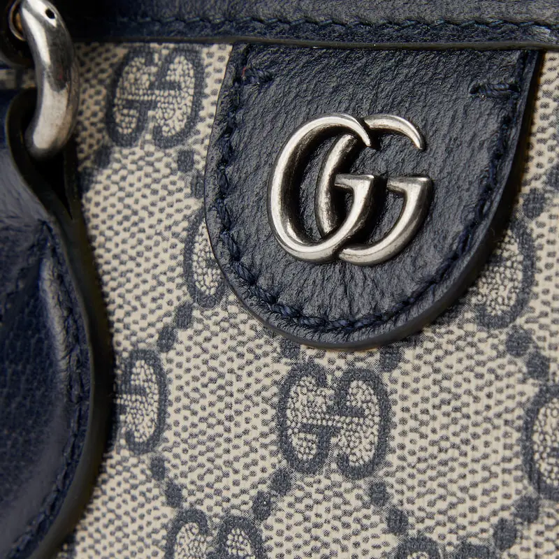 The Ophidia line is further elevated through new sizes and styles, like this small tote bag which has a detachable pouch and detachable leather shoulder strap, allowing for versatile wear. The beige and blue GG Supreme is complete with light gold-toned Double G hardware.