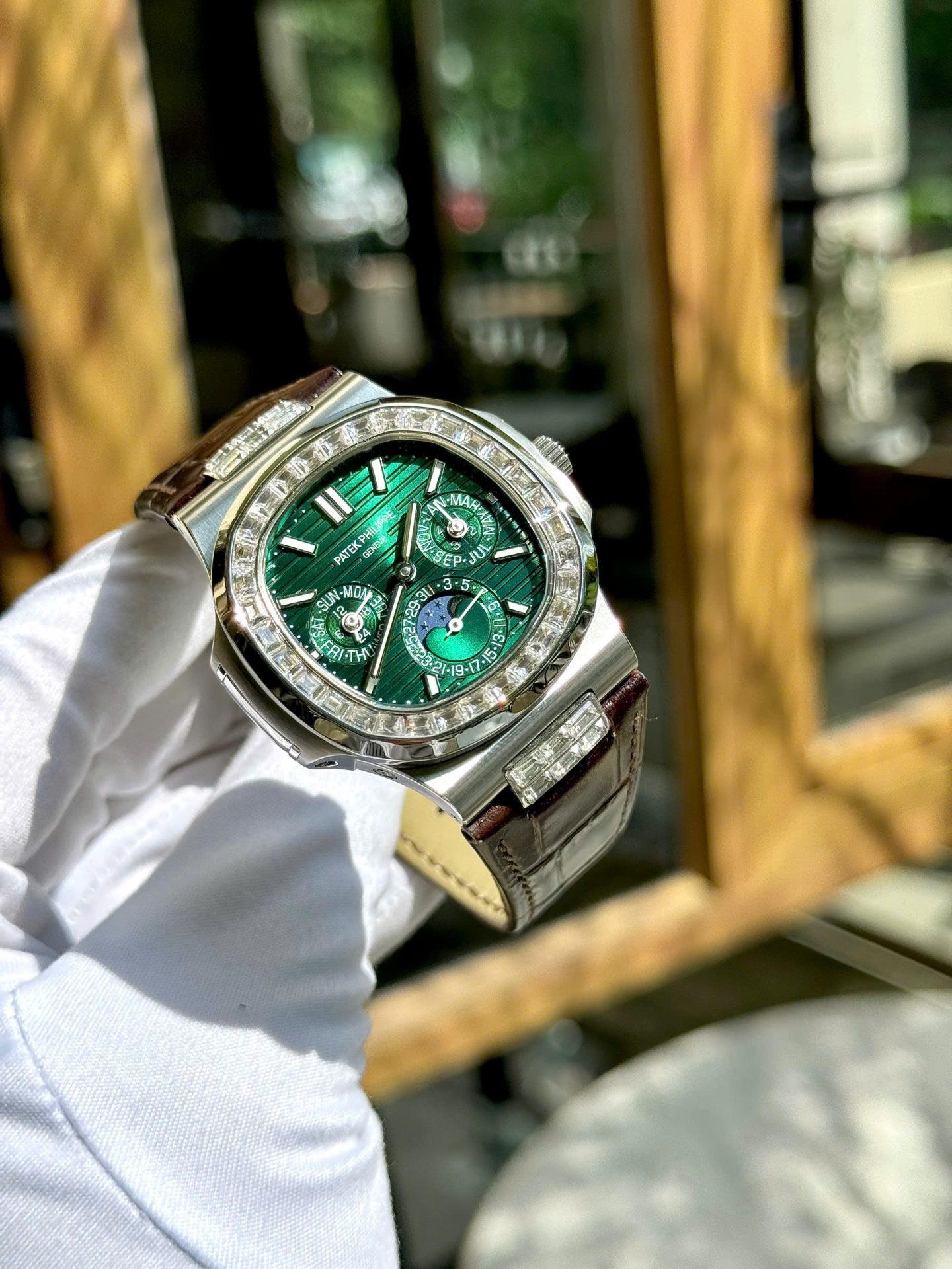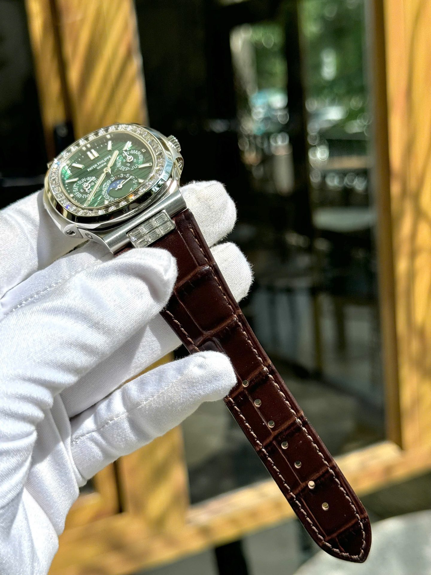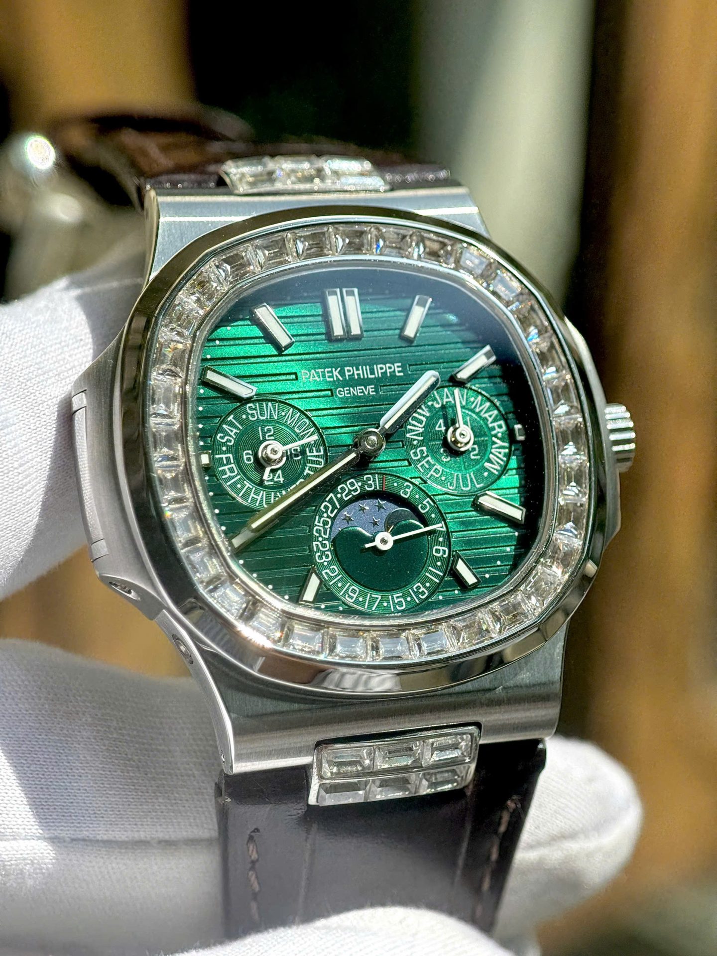 Patek Philippe Nautilus 5740G Replica Watches Green Dial Leather Strap TWS Factory 40mm
