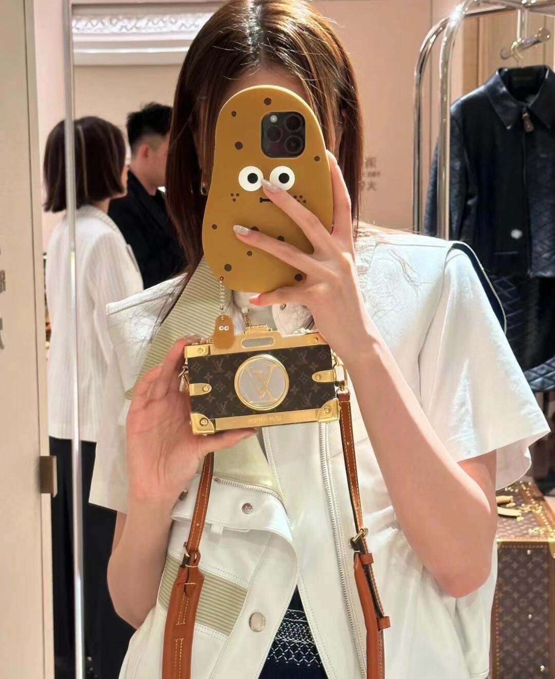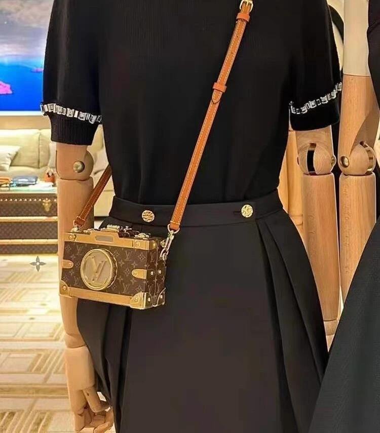 An exceptional creation from the Spring-Summer 2024 show, the Pic Trunk is in fact a minaudière disguised as a vintage camera. Fashioned from Monogram canvas, the tiny trunk is encased in cognac-colored calf leather, with a golden LV Circle “lens cap.” Fitted with a padded strap, this eye-catching accessory can be worn around the neck, on the shoulder, or as a short cross-body bag.