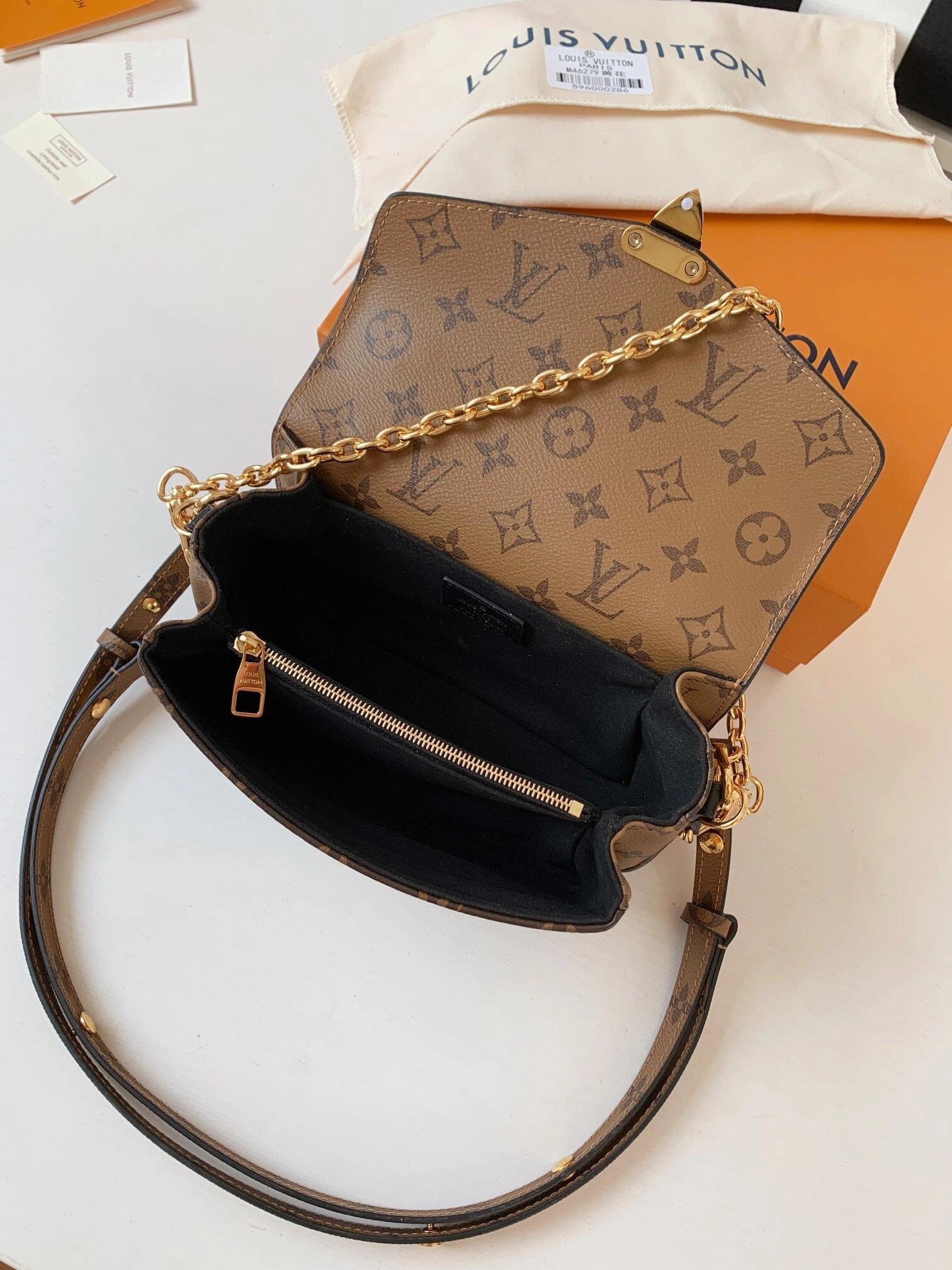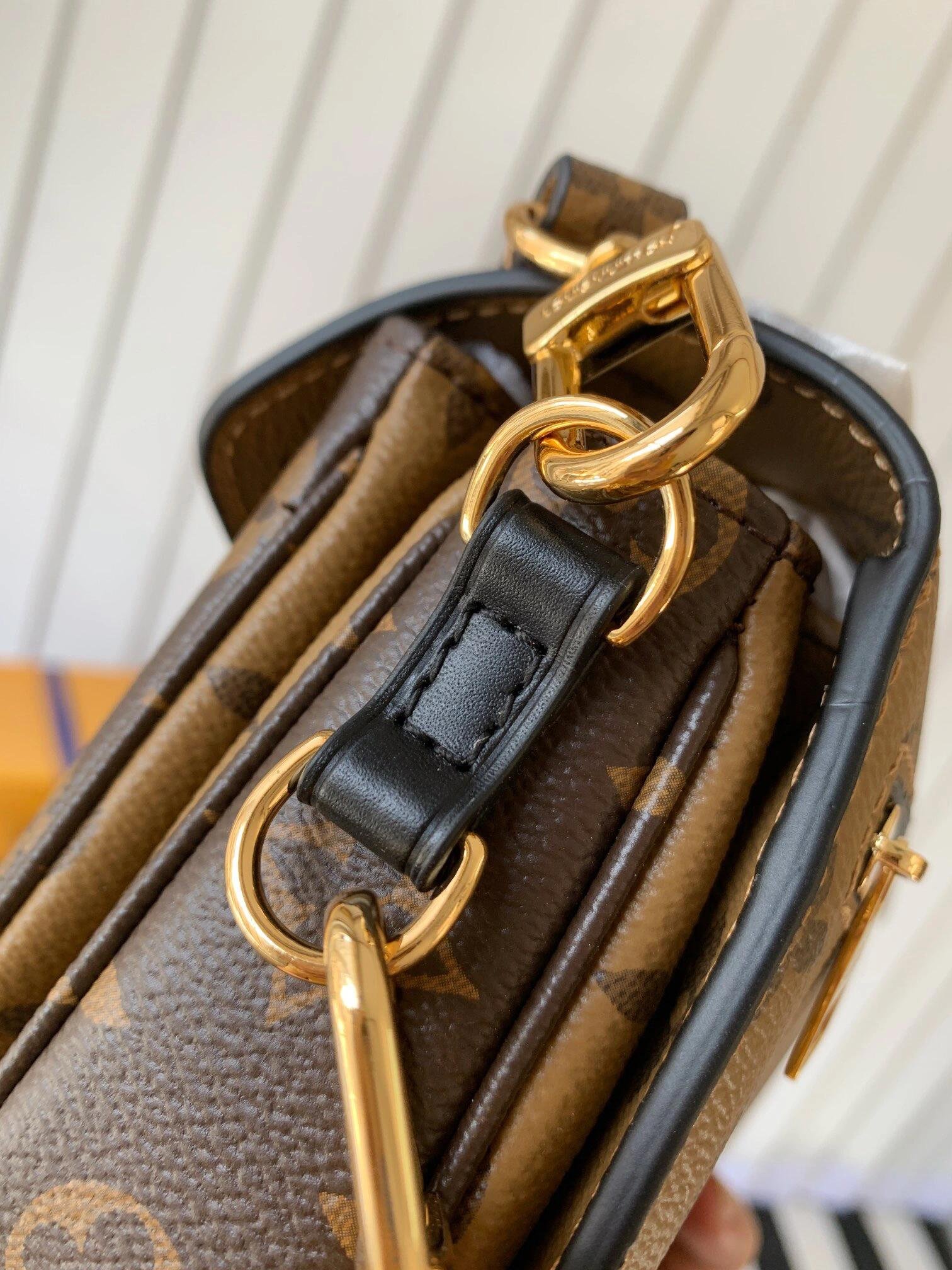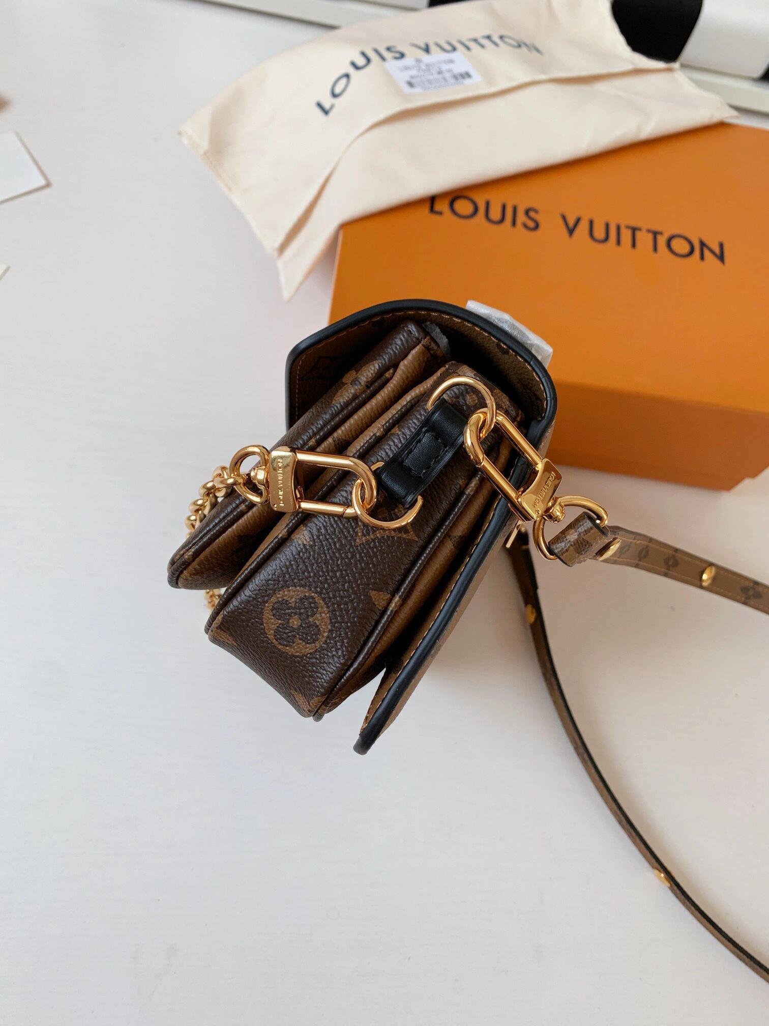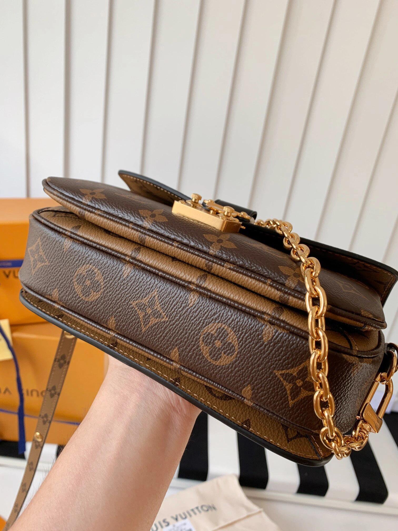 Made from Monogram canvas with natural cowhide-leather trim and the S-lock signature, the Pochette Métis East West bag combines emblematic House cues with new contemporary details like a gold-color chain for fashionable short-shoulder carry. Roomy enough to store a smartphone, it has three inside compartments, a zipped pocket inside, and another outside.