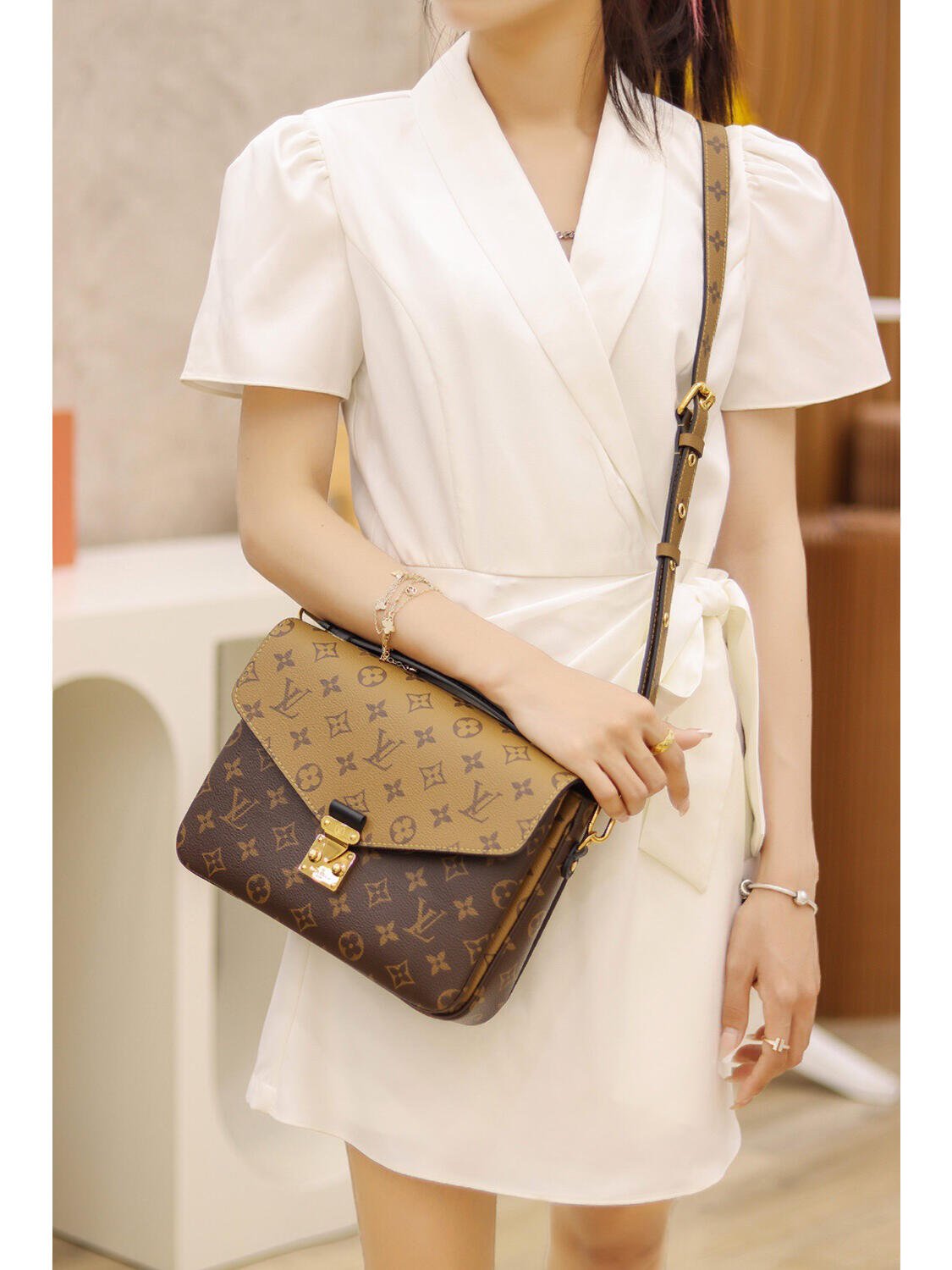 With its distinctive satchel silhouette, the Pochette Métis bag has become an object of fashion desire. This compact, go-everywhere model in trendy Monogram Reverse canvas features a signature S-lock closure with a gleaming gold-tone finish. Versatile and surprisingly roomy, it is fitted with a chic top handle and a long removable strap for shoulder or cross-body wear.