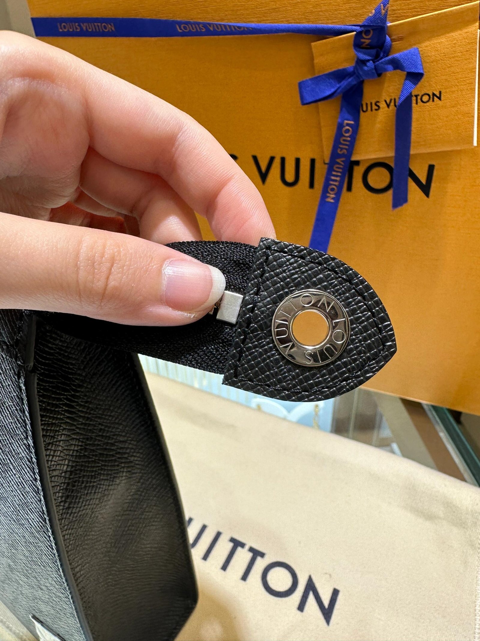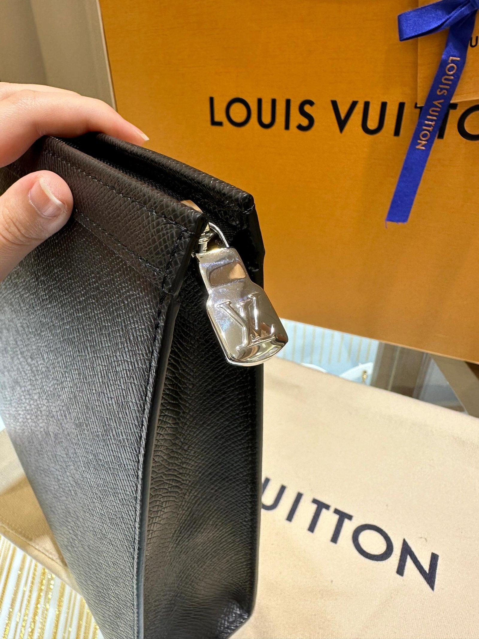 The versatile Pochette Voyage in deep-dyed Taiga leather can be used as a bag inside a bag or hand-carried as a document portfolio. Signed with silver-color metallic LV Initials on the lower righthand corner, this understated bag includes an interior flat pocket and 6 card slots to keep essentials in order.