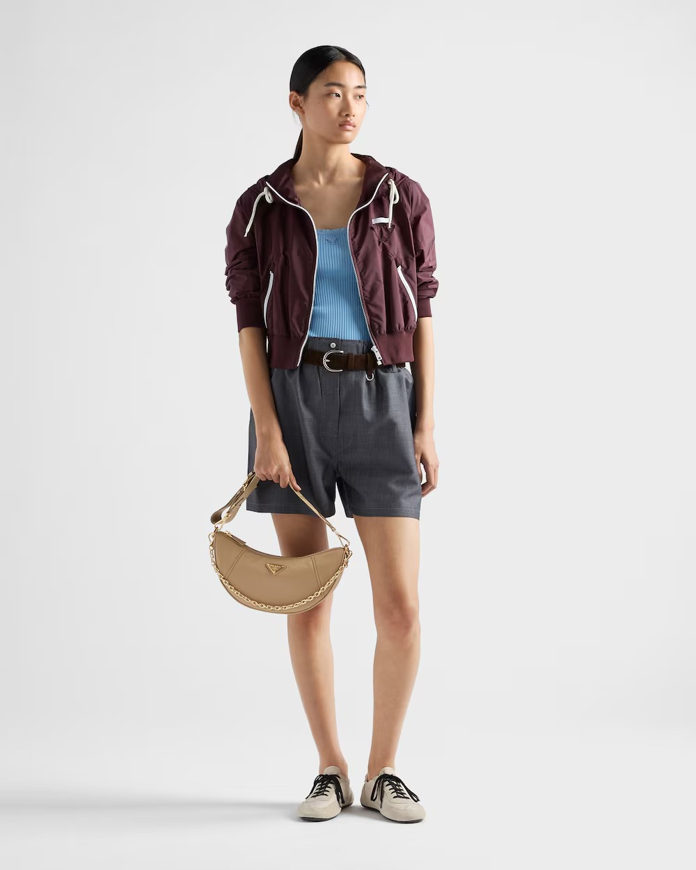 This versatile and refined Re-Nylon bag combines archive shapes with pragmatic, contemporary style. The half-moon silhouette can be worn in different ways, thanks to the detachable sporty shoulder strap and the refined chain handle. The accessory is decorated with the iconic enameled metal triangle logo. For sustainable care to preserve the product’s characteristics and reduce microfiber shedding, we recommend not washing the item too often. Let the product air out after every use and have it dry cleaned at a specialized ecological dry cleaners.