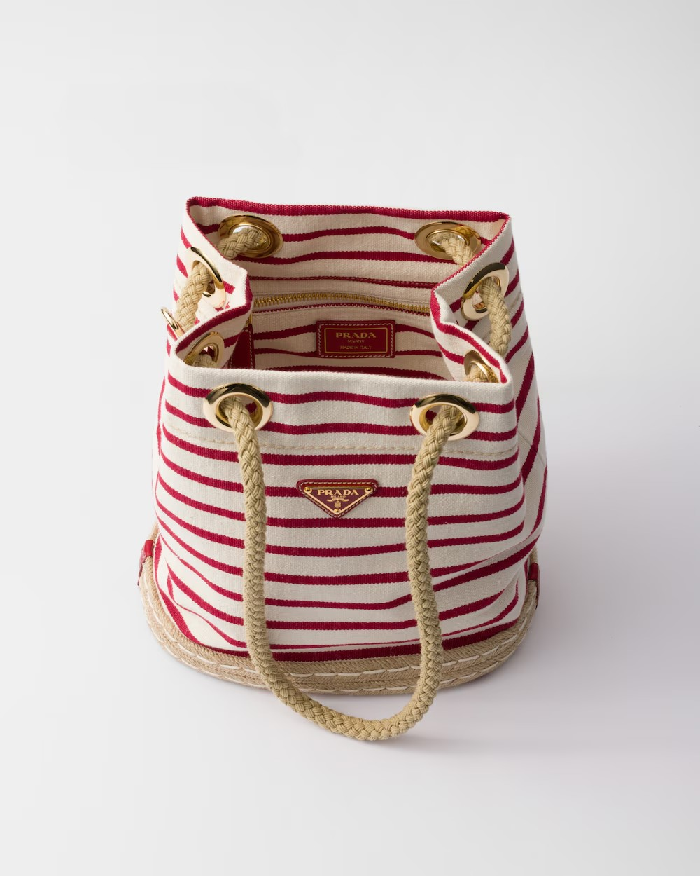 The nautical-inspired stripe motif adds color to this small fabric bucket bag. The espadrille-style base and the cord, another symbol of the nautical world, are a strong reference to summer.