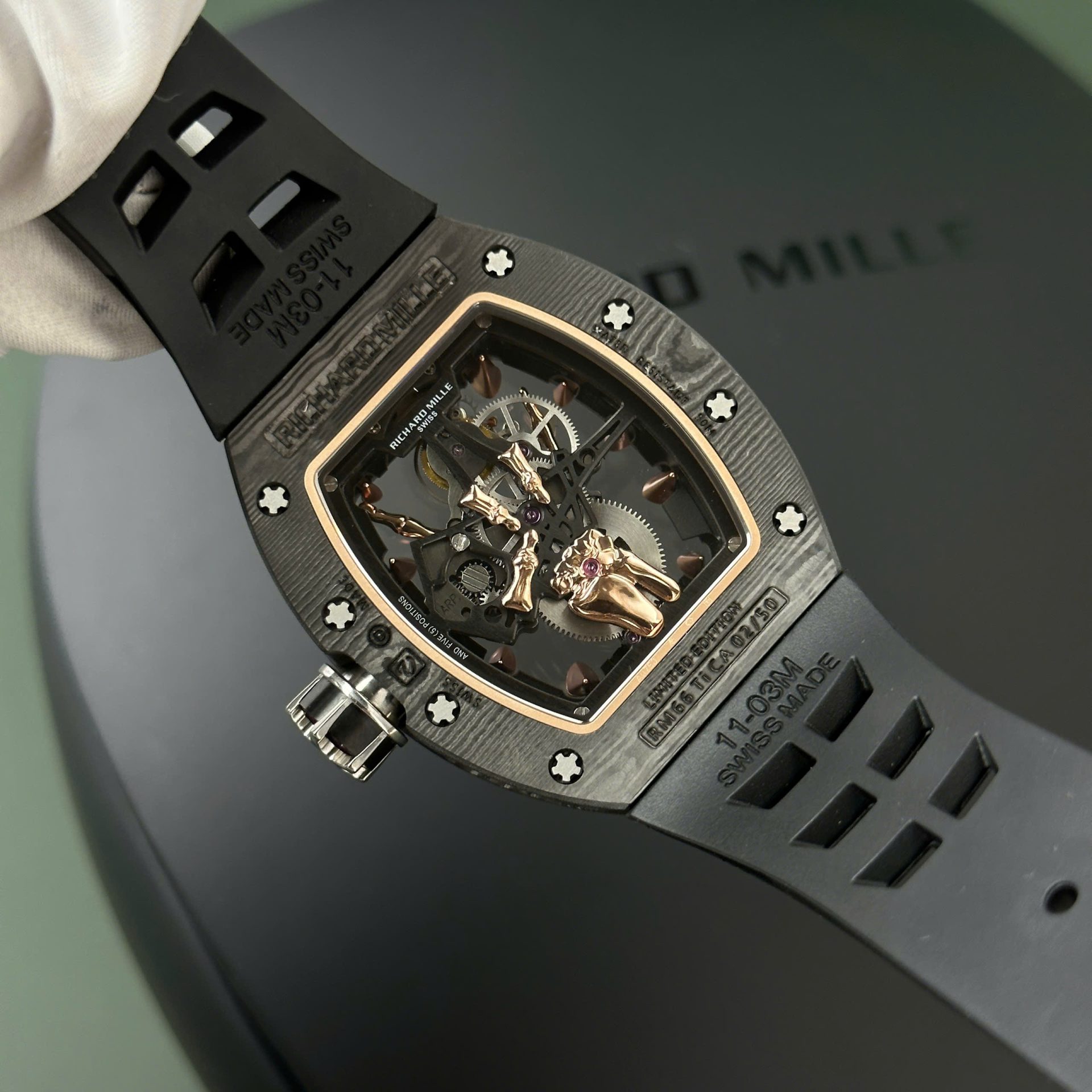 Not only does the RM66 Flying Tourbillon Replica 1:1 impress with its design and technology. but it also comes with practical features. The watch has moderate water resistance. ensuring reliable performance in everyday conditions. Additionally. the high-quality rubber strap adds both style and durability. while also being easy to replace when necessary.
