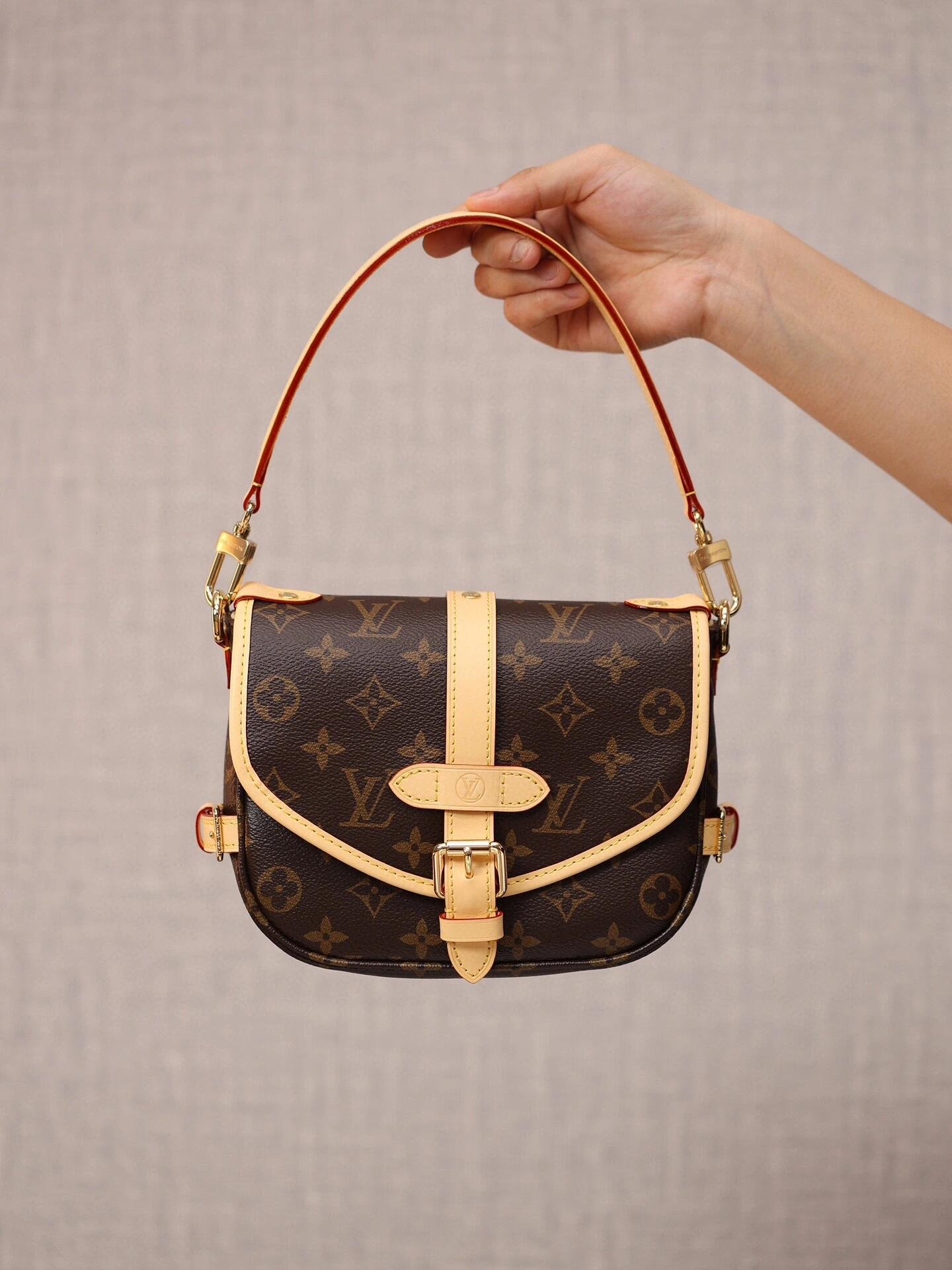 The Saumur BB handbag in Monogram canvas reimagines a beloved archival design in contemporary style. The saddle-bag shape and natural cowhide-leather buckles evoke an equestrian spirit, but the front buckle conceals a magnetic closure: a convenient modern touch. With room inside for a day’s essentials, this compact bag is versatile too, thanks to the detachable strap and handle.