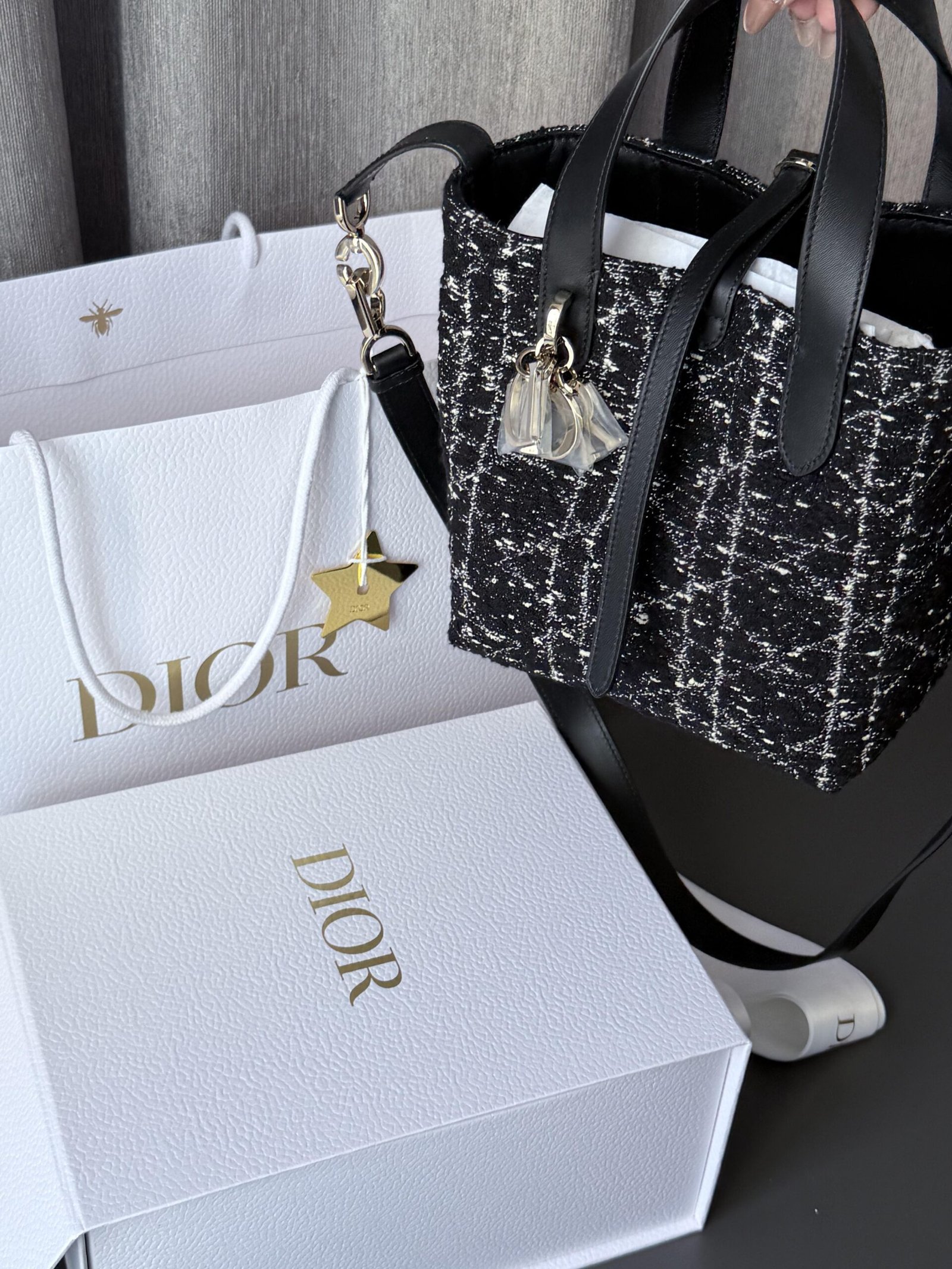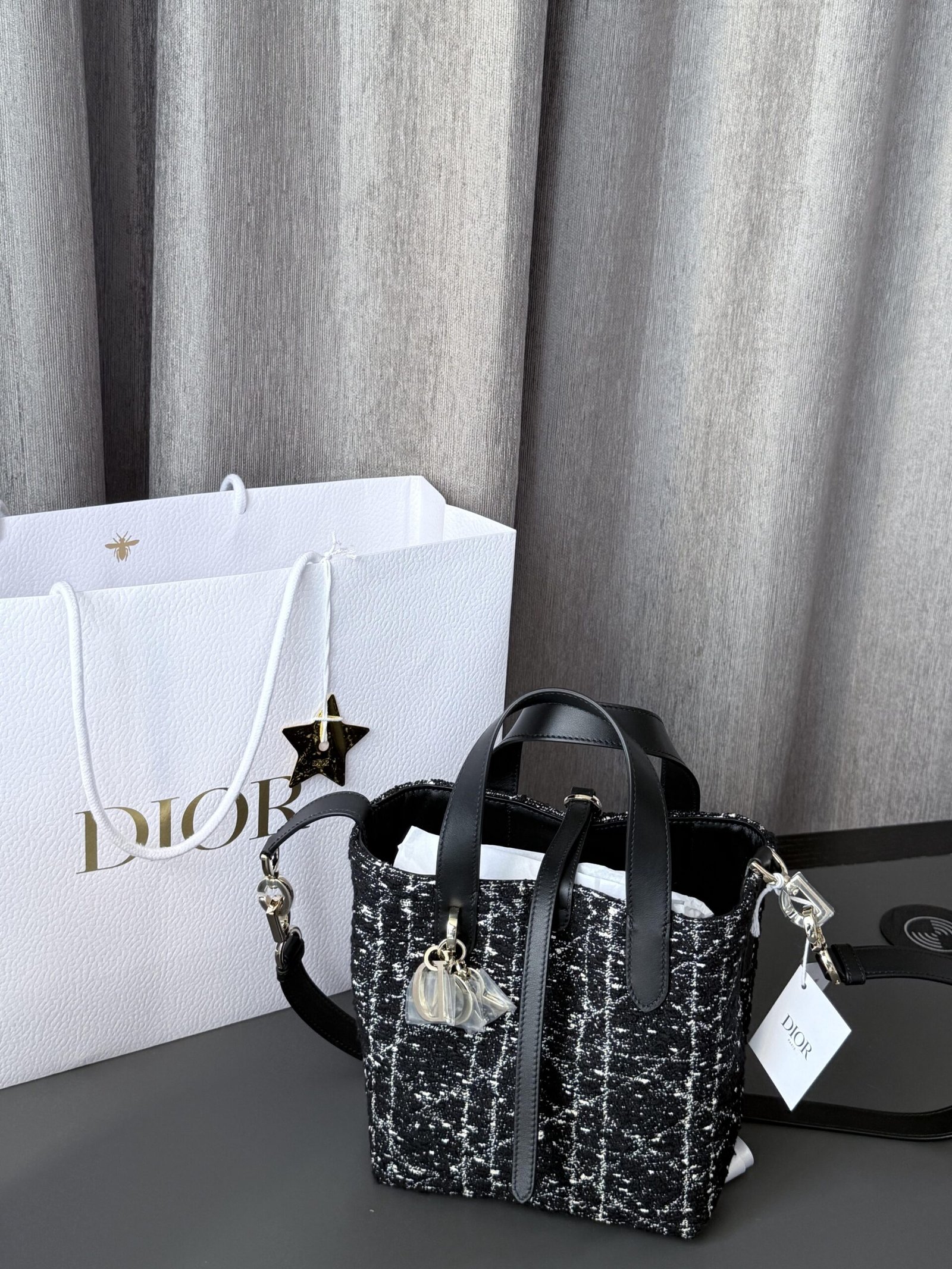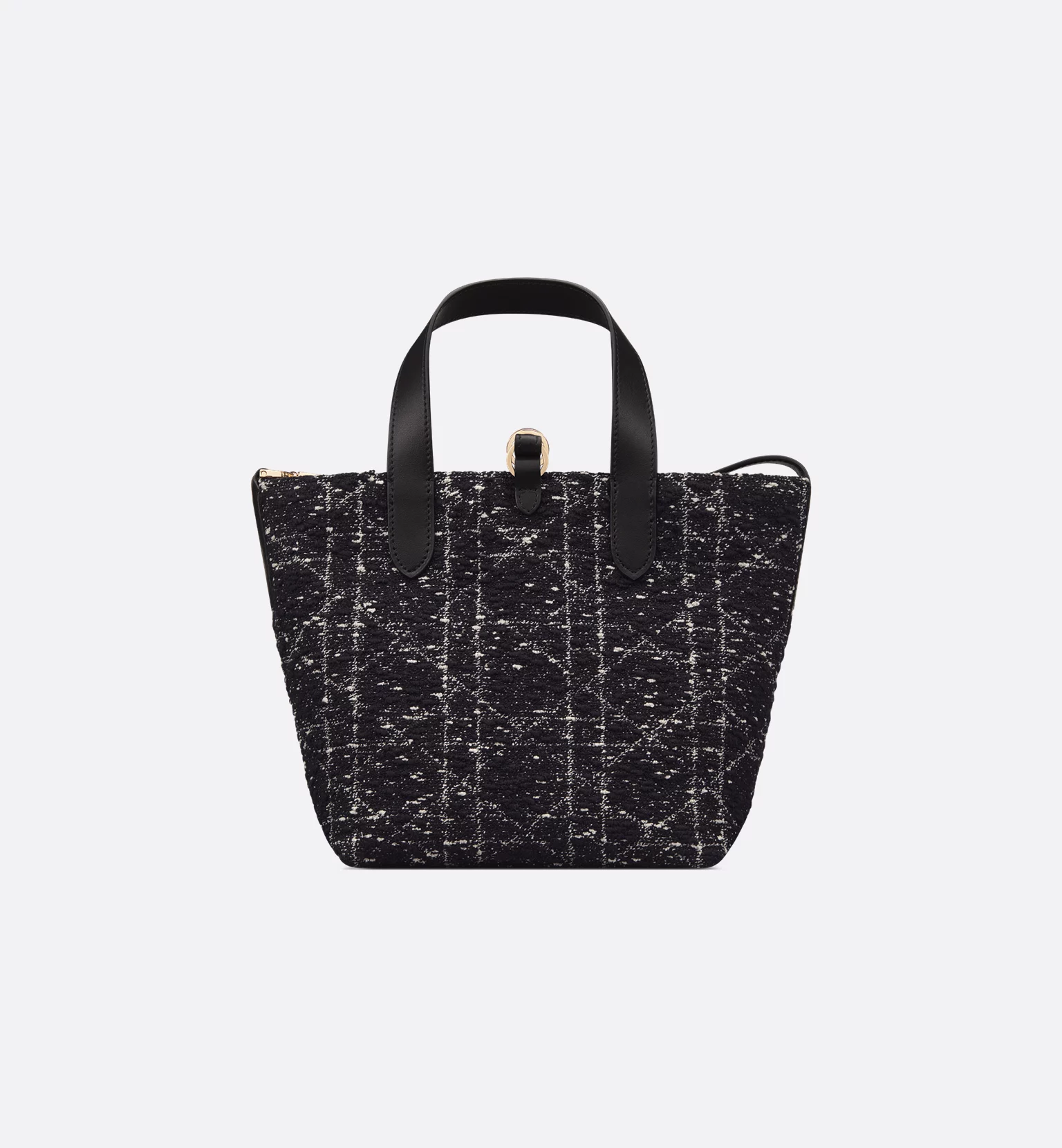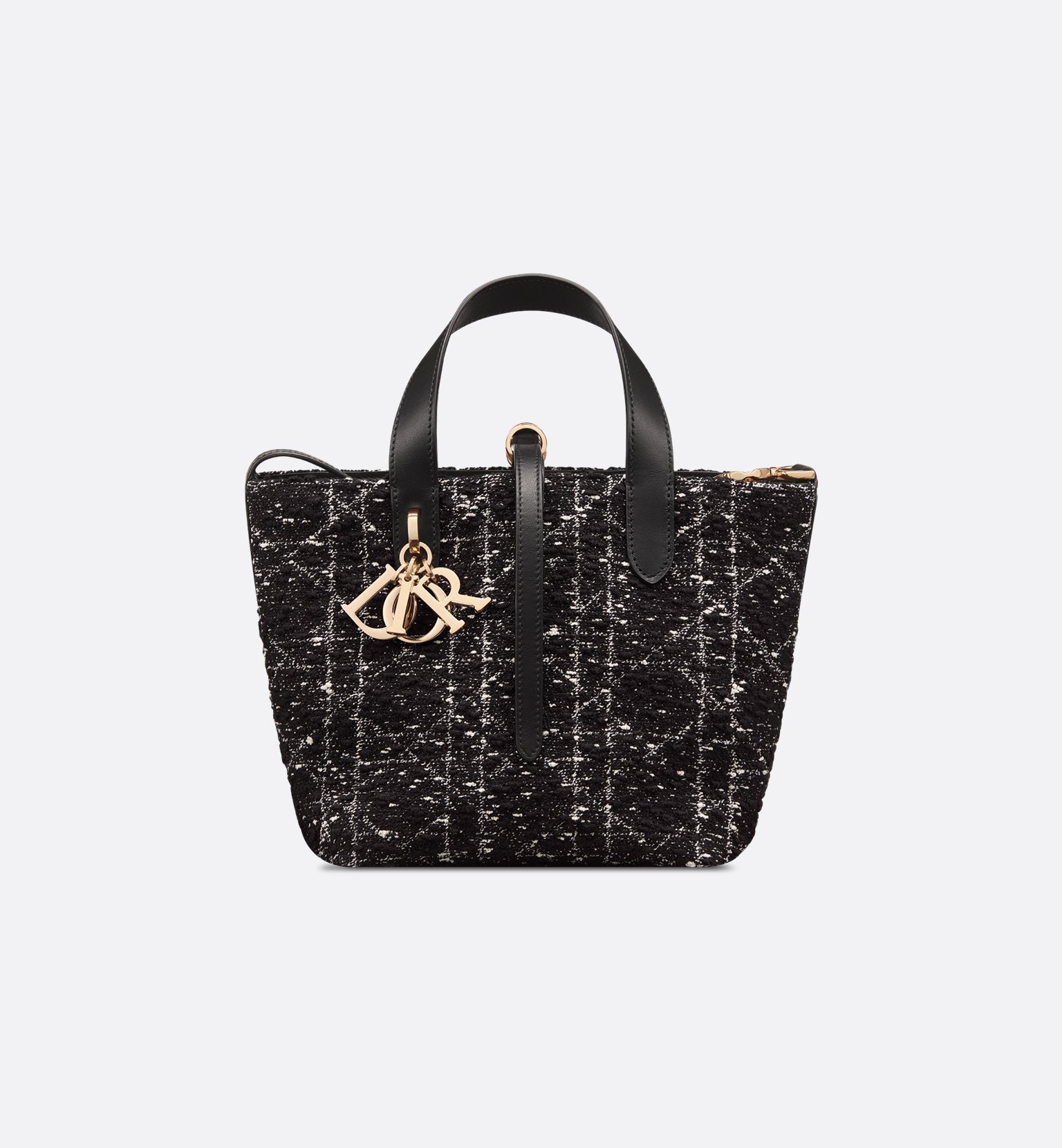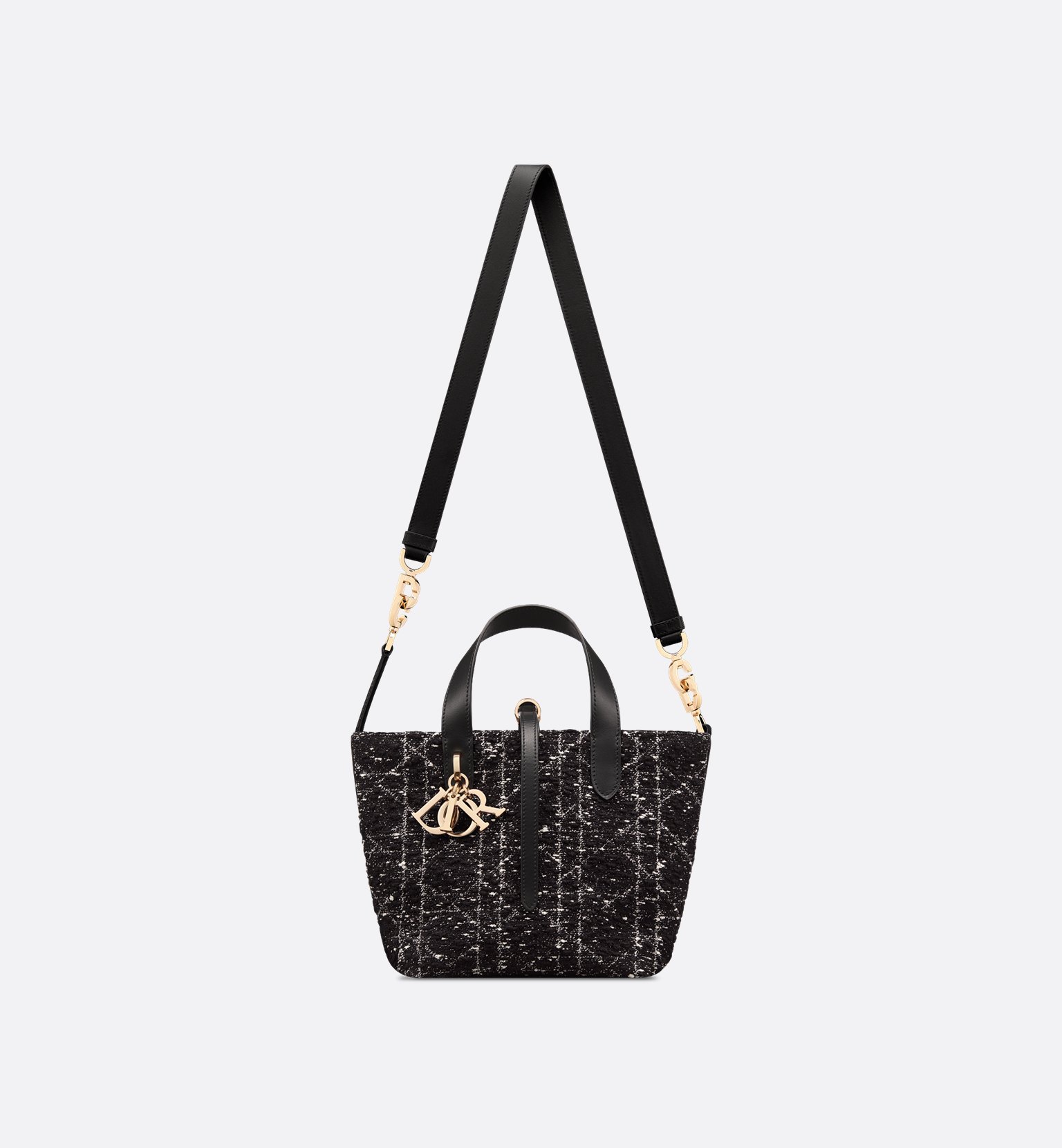 The Dior Toujours vertical tote bag is distinguished by a modern and practical design. Crafted in black tweed with a white Cannage motif, it has a spacious interior compartment to accommodate all the essentials. Its thin leather strap closure keeps items secure, while the D of the CD Lock clasp twists to adjust the sides and enhance the bag’s silhouette. The leather top handles are completed by a removable leather strap, allowing the small bag to be carried by hand, worn over the shoulder or crossbody.