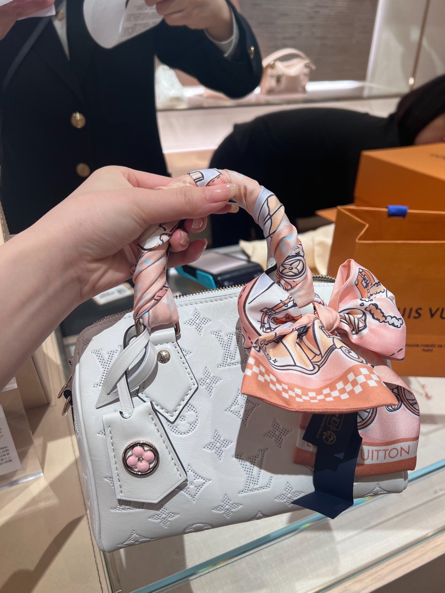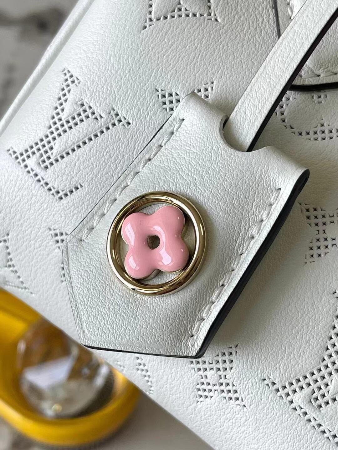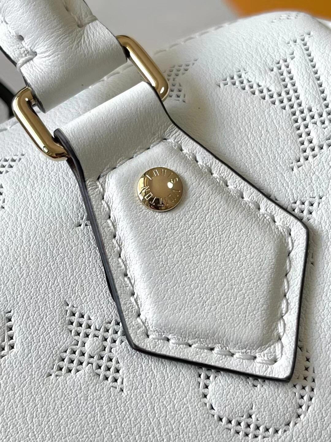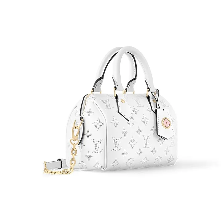 This Speedy Bandoulière 20 handbag is made from smooth calfskin leather, with the Monogram pattern in embossed trompe l’oeil perforation. Pale gold-color hardware and a name tag with a Monogram Flower complete the picture. Rolled-leather handles and a removable and adjustable strap enable a variety of carries.
