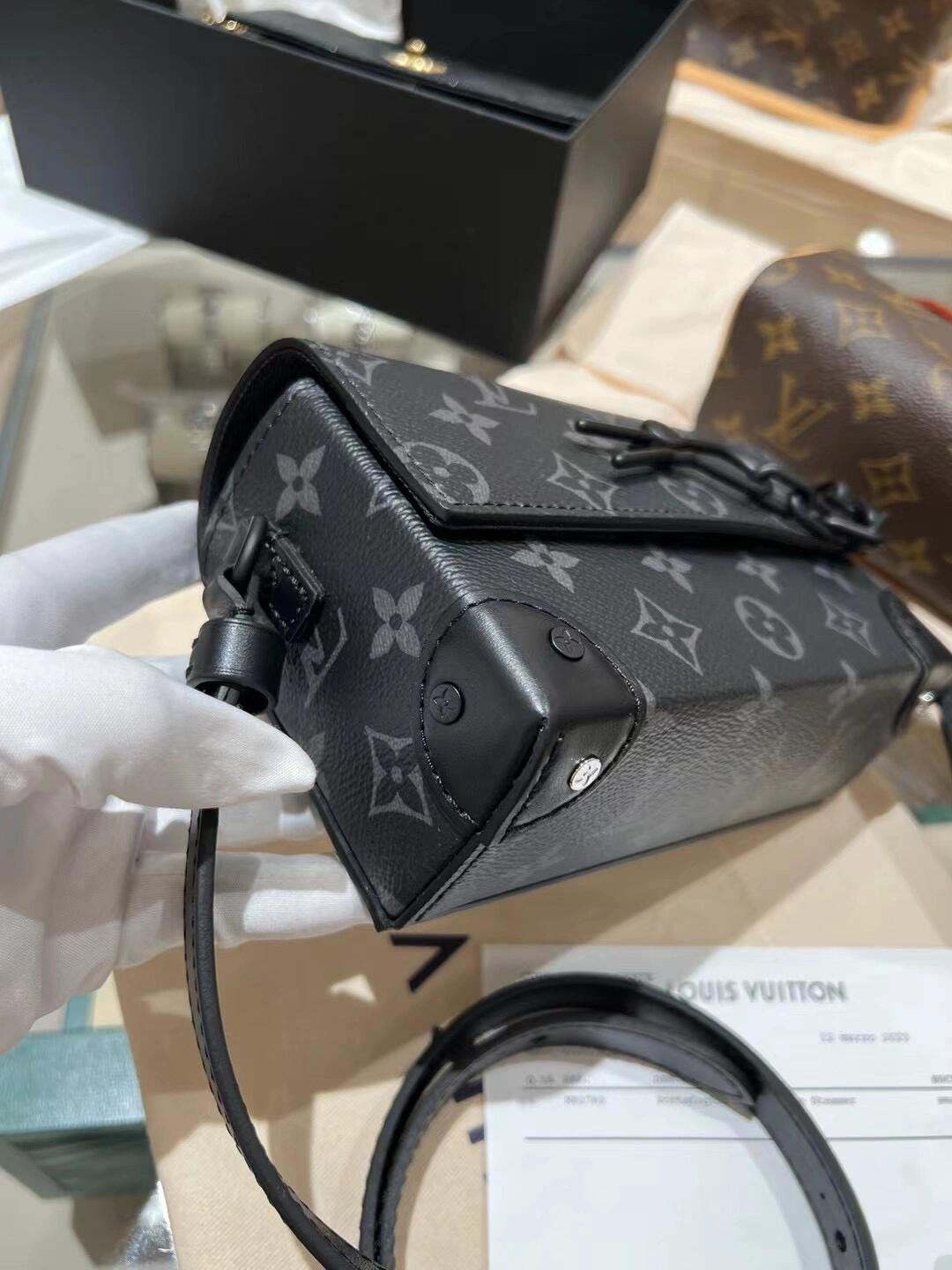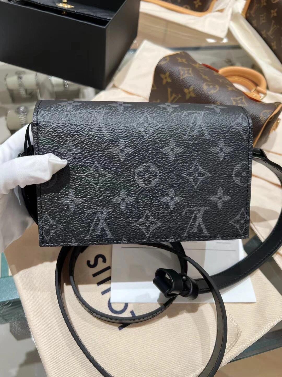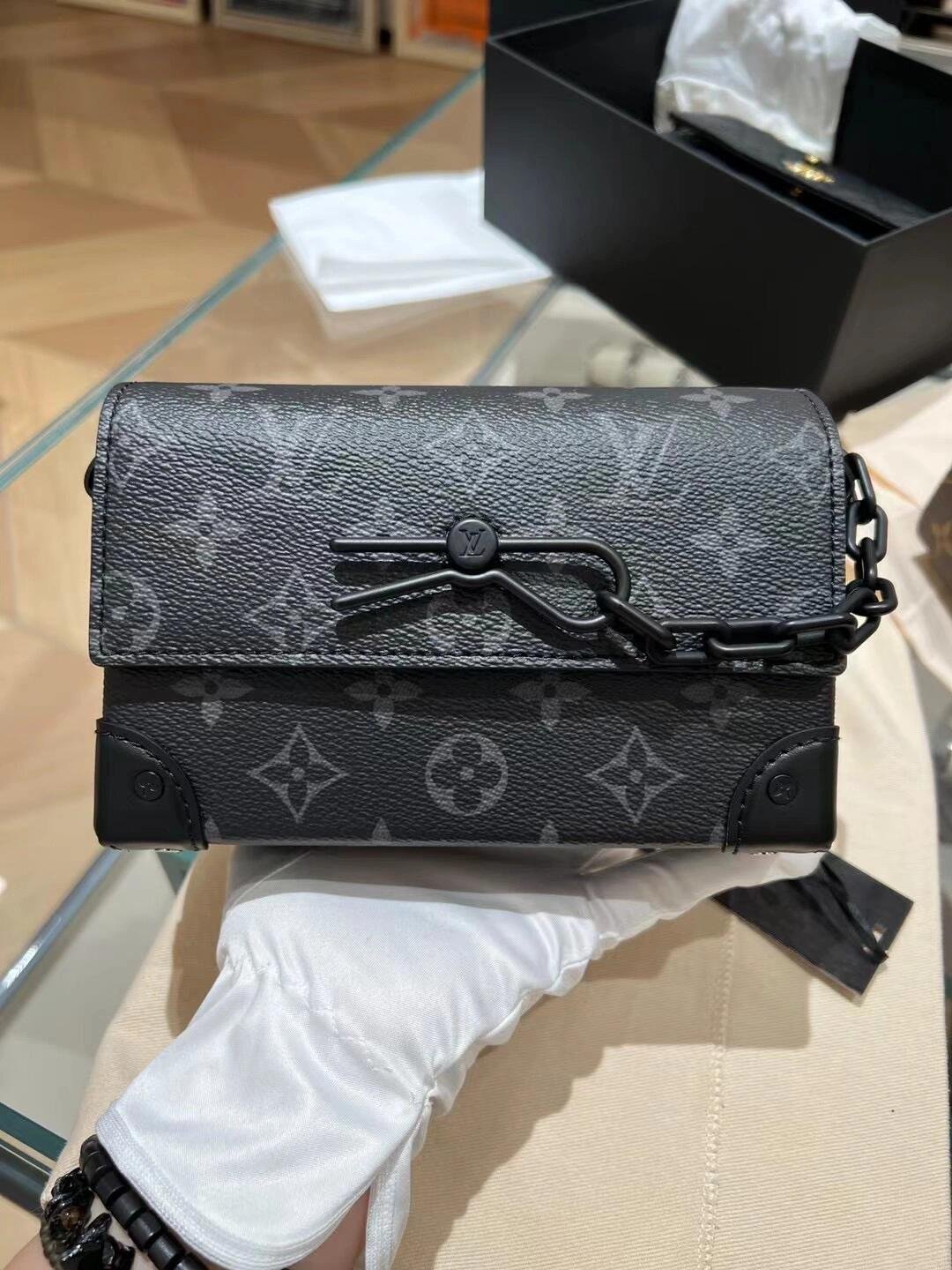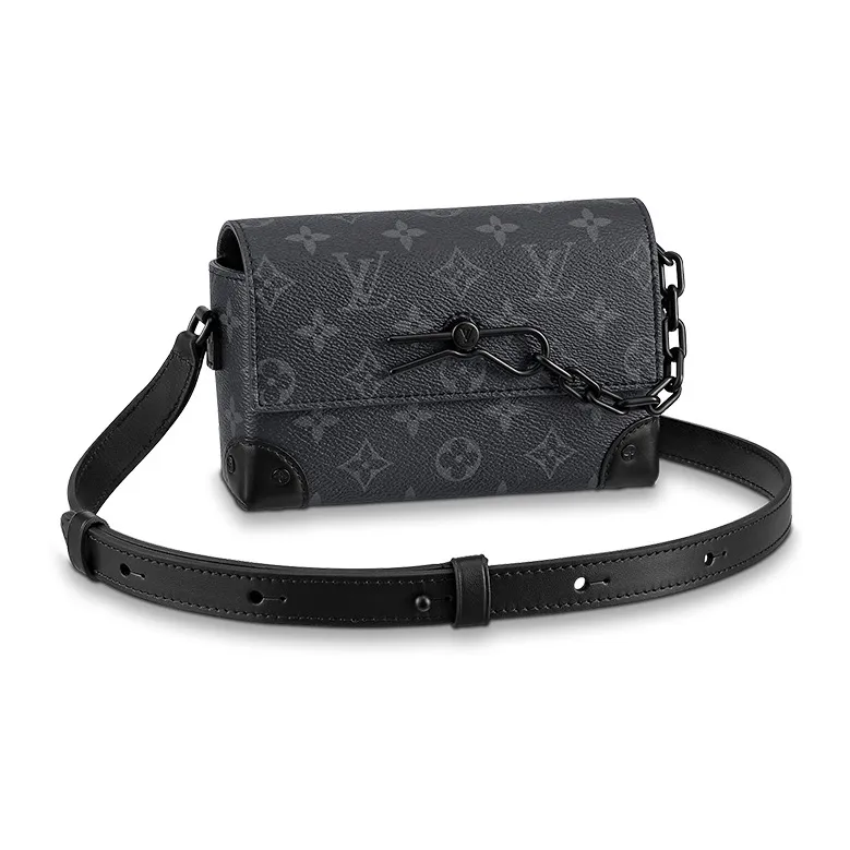 Fashioned from Monogram Eclipse canvas, the Steamer Wearable Wallet is inspired by the House’s Steamer trunk with its emblematic chain-and-pin closure. Just the right size to transport essentials, it features an inside zipped pocket. The adjustable strap ensures comfortable wear.