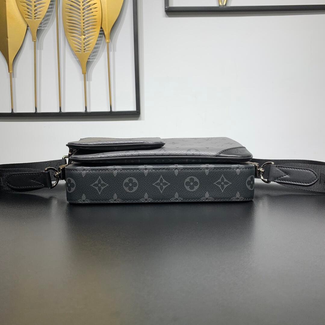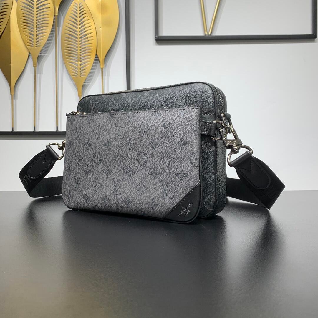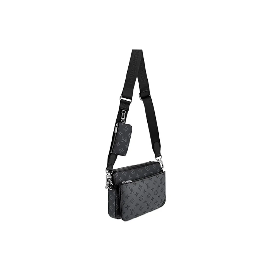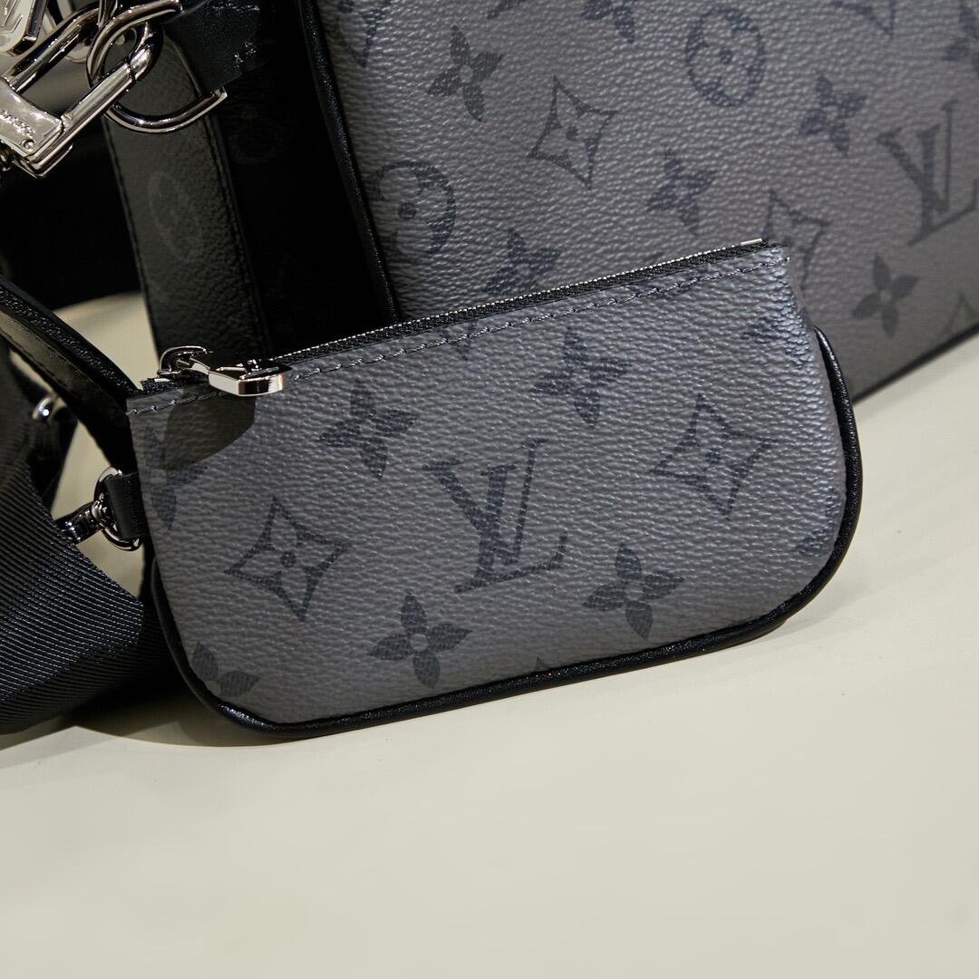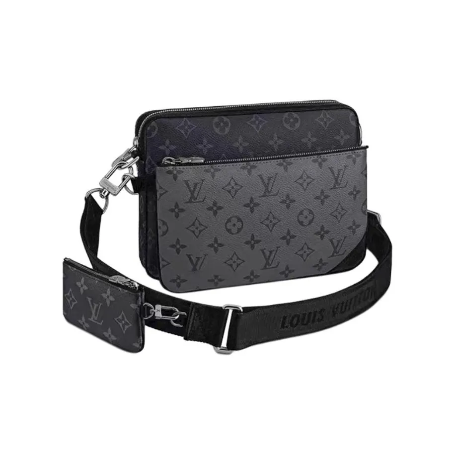 The Trio Messenger bag for men is made from Monogram Eclipse canvas and its mirror twin, Monogram Eclipse Reverse. The iconic motif in tone-on-tone shades of gray complements the lines of this functional hybrid. More than a traditional cross-body bag, it has a removable zipped pocket and a removable coin purse attached to the strap